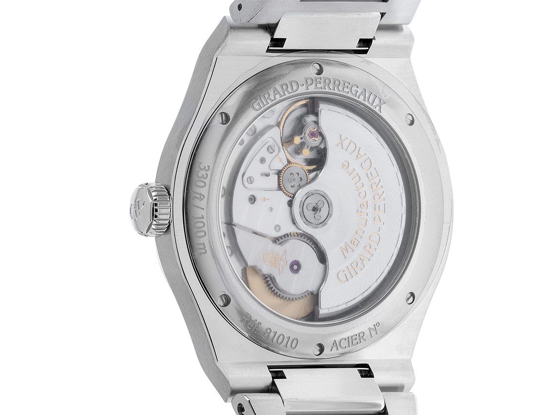 Gehäuse Edelstahl poliert und satiniert, Gehäusedurchmesser ohne Krone 42mm, Gehäusehöhe 10,8mm. Lünette Edelstahl 8-eckig poliert und satiniert. Armband Edelstahl poliert und satiniert, verdeckte Doppelsicherheitsfaltschließe Edelstahl mit Hersteller-Logo. Zifferblatt schwarz mit Waffelmuster und aufgesetzten Edelstahl Leuchtindexen und Edelstahl Leuchtzeigern. Uhrwerk Automatik, Kaliber Girard Perregaux GP01800 mit 28 Edelsteinen, Gangreserve ca. 54 Stunden. Anzeige von Stunde, Minute und Sekunde über Zeiger aus der Mitte mit Sekundenstopp zur sekundengenauen Einstellung der Uhrzeit, Datumsanzeige mit Schnellverstellung bei 3 Uhr. Saphirglas kratzfest. Krone verschraubbar mit Hersteller-Logo. Boden Edelstahl 6-fach verschraubt und graviert mit Saphirglas Sichtfenster. Gewicht der Uhr inklusive Armband 144g, Länge des Armbandes inklusive Gehäuse 200mm. Wasserdicht bis 10 ATM. Referenznummer: 81010-11-634-11A, ID: ST1160207561225H-15100, Artikelnummer: 10000083909. Original Girard Perregaux Box mit Umkarton und Garantie Papiere von November 2025, Full Set. Ungetragen. Lieferzeit sofort.