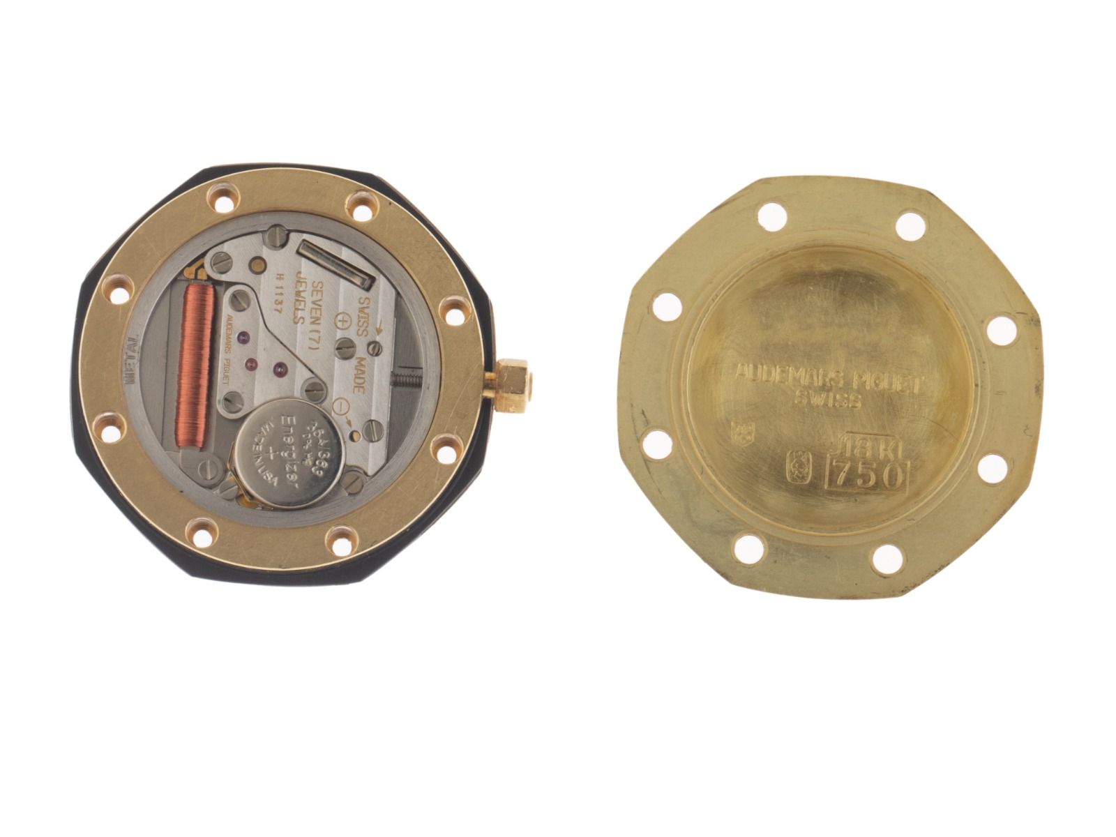 Gehäuse 18kt Gelbgold satiniert, Gehäusedurchmesser ohne Krone 26mm, Gehäusehöhe 6,4mm. Lünette 18kt Gelbgold 8-eckig mit Diamanten besetzt. Armband 18kt Gelbgold satiniert, Sicherheitsfaltschließe 18kt Gelbgold mit Hersteller-Logo. Zifferblatt schwarz mit 11 aufgesetzten Diamantindexen sowie gelbgoldenen Zeigern. Uhrwerk quarzgesteuert, Audemars Piguet Manufakturkaliber H1137 mit 7 Edelsteinen. Anzeige von Stunde und Minute über Zeiger aus der Mitte. Saphirglas kratzfest. Krone 18kt Gelbgold verschraubbar. Boden 18kt Gelbgold 8-fach verschraubt und graviert. Gewicht der Uhr inklusive Armband 105g, Länge des Armbandes inklusive Gehäuse 160mm. Referenznummer: 6008BA, Gehäusenummer: B90XXX, ID: P2115134001225H-28500, Artikelnummer: 10000083895. Mit Gangkontrolle, neuer Batterie und kompletter äußerlicher Aufarbeitung von Dezember 2025. Original Audemars Piguet Box mit Umkarton und Garantie Papiere von Januar 1988 sowie Beschreibung, Full Set. Superschnäppchen, Kapitalanlage mit Wertsteigerungspotential, extrem seltenes Sammlerstück. Wie Neu. Lieferzeit sofort.