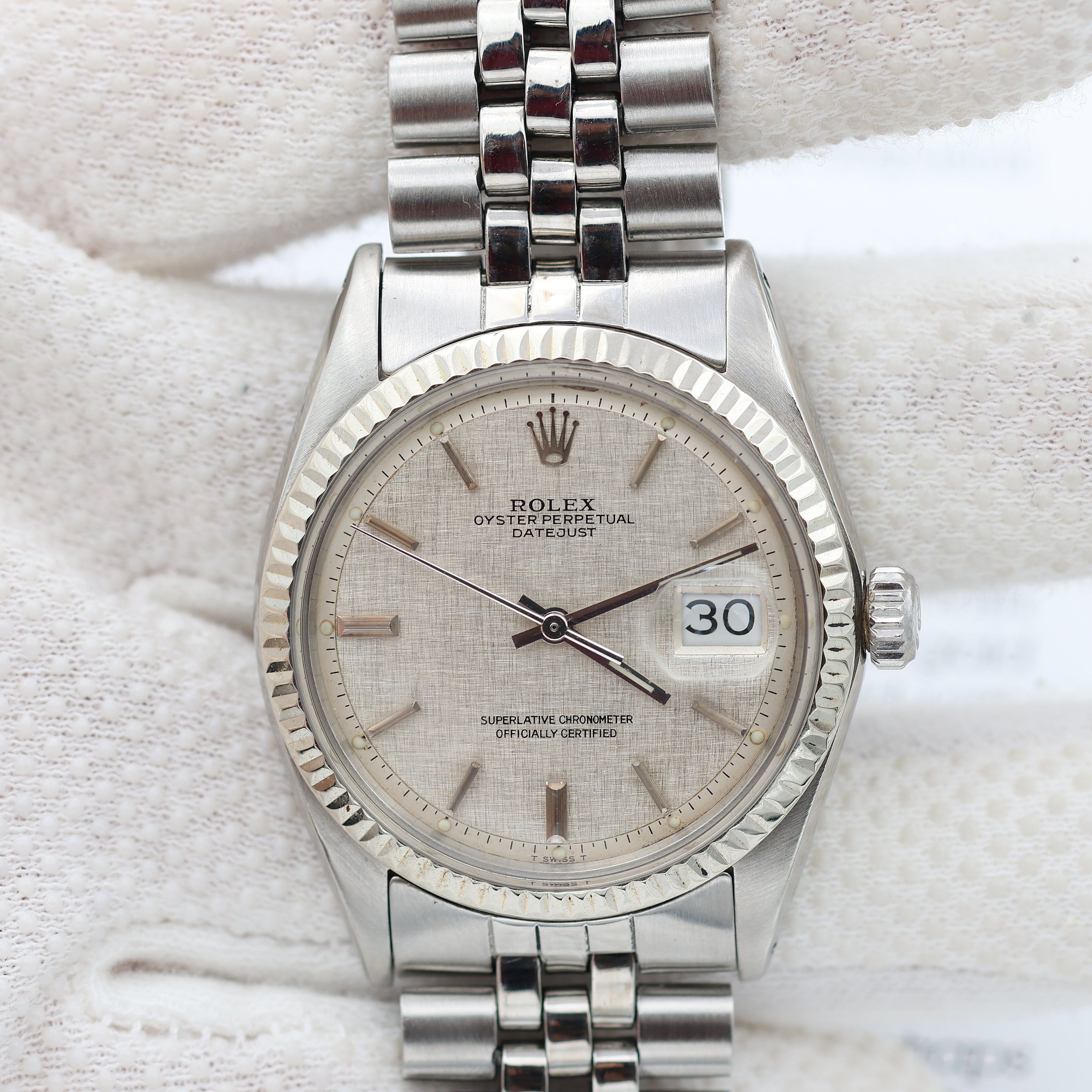For sale at Debonar Watches: pre-owned Rolex Datejust ref. 1601 in steel and white gold, with a rare and bright linen dial, and a Jubilee bracelet.The Rolex Datejust is considered the definitive “watch”: its design has barely changed in 60 years and is a familiar sight even to non-enthusiasts. This Rolex has all the signature aesthetics of a Datejust, which include a fluted bezel, baton hour markers, and the Cyclops magnifying bubble over the date window. BRAND ROLEX MODEL DATEJUST REFERENCE 1601 CASE MATERIAL STEEL MOVEMENT AUTOMATIC DIMENSION 36 MM DIAL LINEN BEZEL WHITE GOLD CRYSTAL PLEXIGLASS BRACELET TYPE BRACELET BRACELET MATERIAL JUBILEE BRACELET LENGHT 17 CM ORIGINAL BOX YES ORIGINAL PAPERS YES YEAR APPROX. THE '70s CONDITION VERY GOOD
