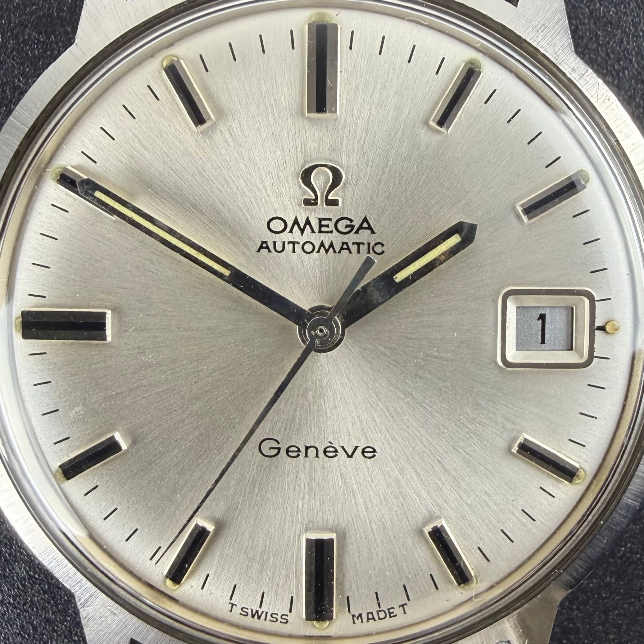 Vintage Omega Genève from 1970, featuring a white sunburst dial with tritium lume plots and tritium lume in the hands. Inside is the caliber 565 automatic movement, serviced in December 2025 and currently running and functioning very well.