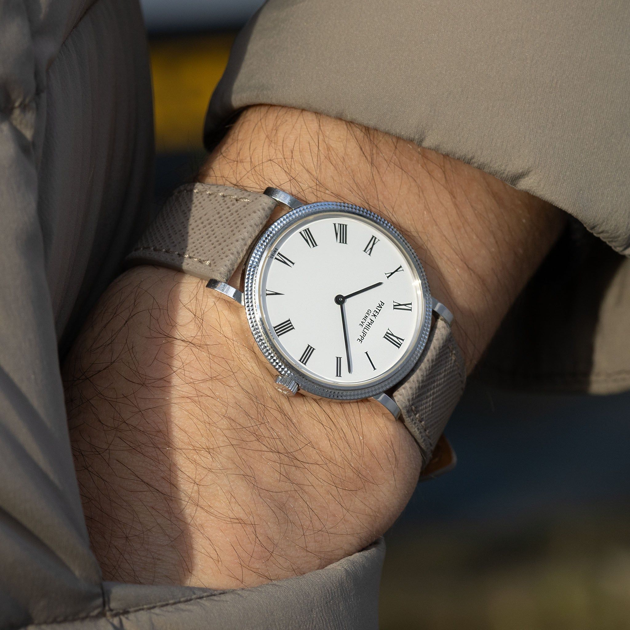 The Patek Philippe Calatrava, launched in 1932 with the iconic Reference 96, is a legendary collection symbolizing timeless, minimalist elegance. It emerged after Patek Philippe’s acquisition by the Stern brothers during the Great Depression—a pivotal moment that steered the brand toward understated, high-quality design. Named after the brand’s cross emblem—originally linked to a medieval Spanish chivalric order—the Calatrava set the standard for the modern dress watch with its clean lines, round case, and Bauhaus-inspired “form follows function” aesthetic. The Reference 5120 is a spiritual successor to the beloved hobnail (“clous de Paris”) Calatrava models such as the manual-wind Ref. 3919, translating that classic design language into an elegant automatic format. This ultra-thin 18k white gold case, measuring 35 mm, is in lovely condition, with its double row of hobnail pyramids around the bezel still crisp and well defined. It features gently curved lugs and a sapphire display back that offers a clear view of the 22k gold micro-rotor and the beautifully finished Caliber 240—an icon in its own right. The dial presents a clean white canvas with painted Roman numerals, no seconds hand for an added sense of tranquility, and simple blackened stick hands. It is paired with a refined Bulang & Sons leather strap and fitted with an 18k white gold Patek Philippe pin buckle. This minimalistic Calatrava has been fully serviced by our watchmaker and is ready to be enjoyed for many years to come. The 5120 represents perhaps the last generation of truly two-hand (hour + minute) automatic Calatavas from Patek — minimalism at its finest.. Give your collection the clous de Paris touch it deserves—take this refined Calatrava home! Specifications: Patek Philippe Calatrava Reference 5120G 35mm 18k white gold case with “hobnail” bezel Display case back White dial with black Roman numerals and non-lumed hands Bulang and sons leather strap , 18 k white gold Patek' pin buckle Calibre 240 automatic movement with gold micro rotor Movement number 120xxxx, dating to the early 2000’s Fully serviced by our watchmaker One-year mechanical warranty Free worldwide FedEx Priority shipping