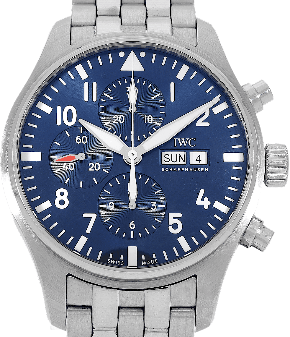 IWC Pilot's Watch Chronograph Edition "Le Petit Prince", Reference: IW377714, Gender: Male, Size: 43mm, Dial color: Black, Strap material: Calf Leather, Movement: Automatic, Year: 2019, Condition: Previously worn with some signs of usage. The movement is flawless and the case has been cleaned. watch tested to ensure full functionality. An inspection by our certified watchmakers guarantees its authenticity., Documents: Original papers, CHRONEXT Certificate