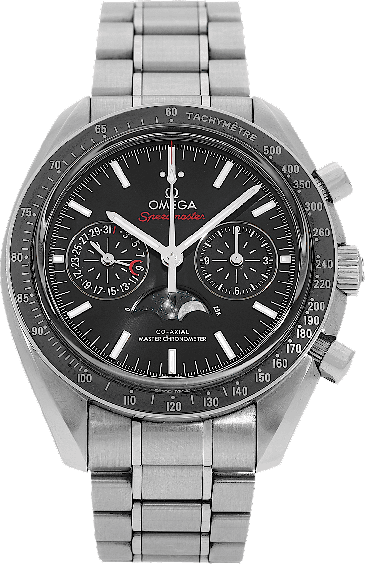 Omega Speedmaster Moonwatch Co-Axial Master Chronometer Moonphase Chronograph, Reference: 304.30.44.52.01.001, Gender: Male, Size: 44mm, Dial color: Black, Strap material: Stainless Steel, Movement: Automatic, Year: 2021, Condition: Previously worn with some signs of usage. The movement is flawless and the case has been cleaned. watch tested to ensure full functionality. An inspection by our certified watchmakers guarantees its authenticity., Documents: Original papers, CHRONEXT Certificate