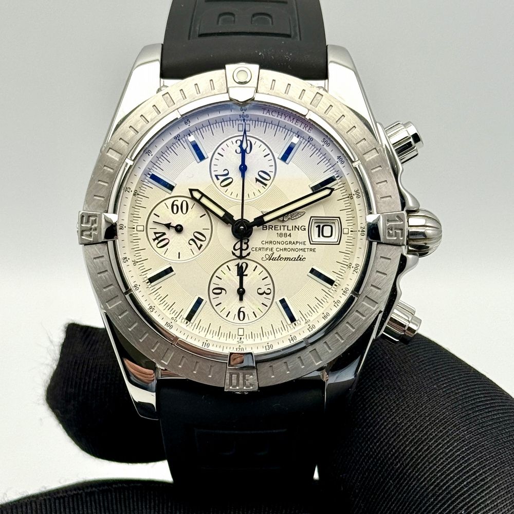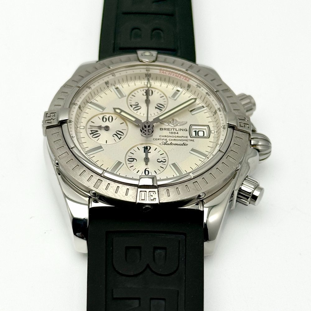 The Breitling Chronomat, reference A13356, features a 44 mm stainless steel case with a silver-white dial and subdials, and luminous hands and markers for excellent legibility. Powered by the Breitling caliber 13 automatic chronograph movement, this COSC-certified movement ensures reliable, chronometer-level accuracy.
