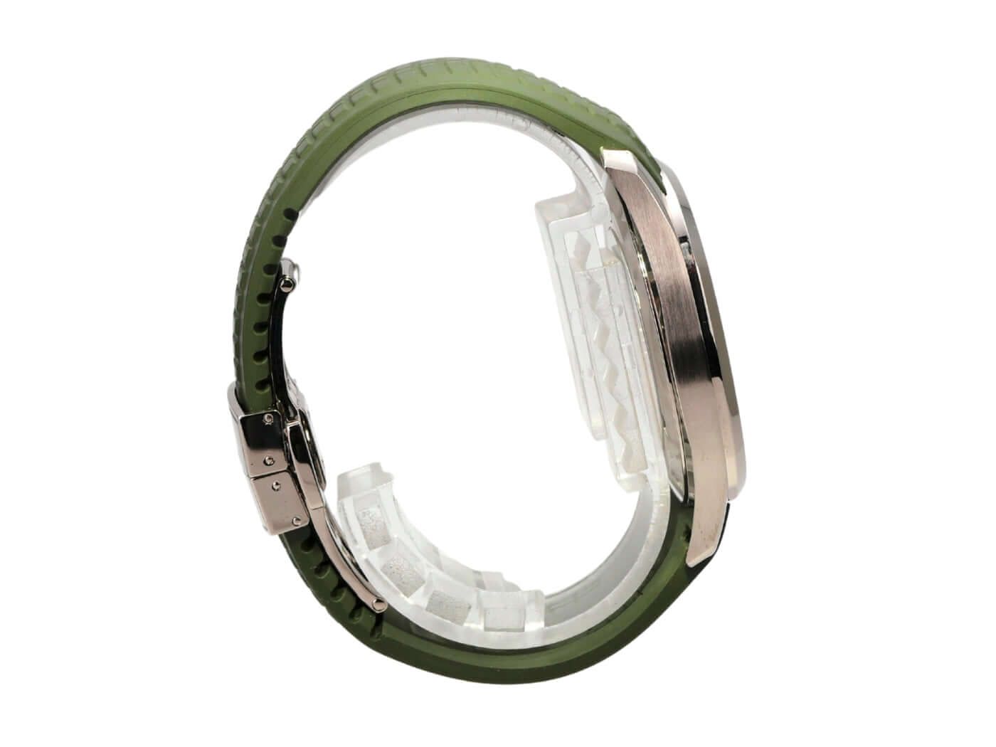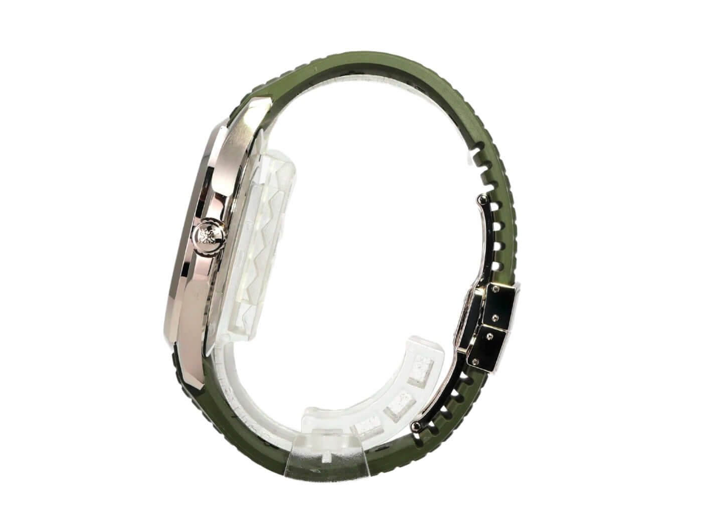 Case made of 18 kt white gold, polished and satin-finished, case diameter 42.2 mm, 18 kt white gold bezel, polished and satin-finished, green rubber strap with folding clasp, green dial with applied Arabic luminous numerals, automatic winding, manufacture caliber 324 S C with 29 jewels, frequency 28,800 A/h, power reserve up to 45 hours, date, central seconds, case back made of 18 kt white gold with sapphire crystal window, water-resistant up to 12 bar.