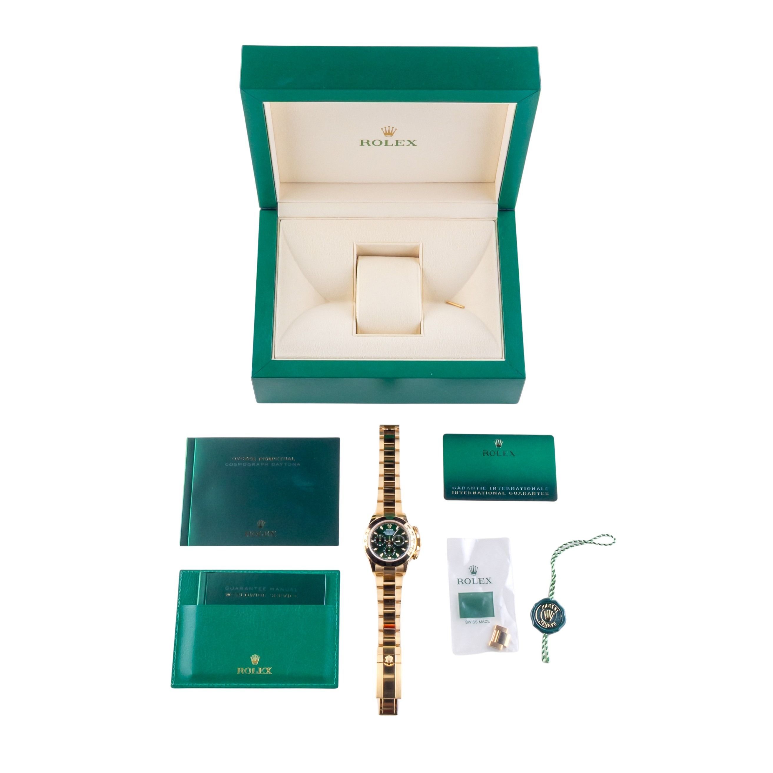 Rolex Daytona reference 116508 from 2020 including full set. The Rolex Daytona reference 116508 measures a 40mm gold case, and features a gold Oyster bracelet, tachymeter scale bezel and green John Mayer dial. The Rolex Daytona 116508 is powered by an in-house Caliber 4130 movement that features a chronograph function, allowing you to time your activities with accuracy and ease.
