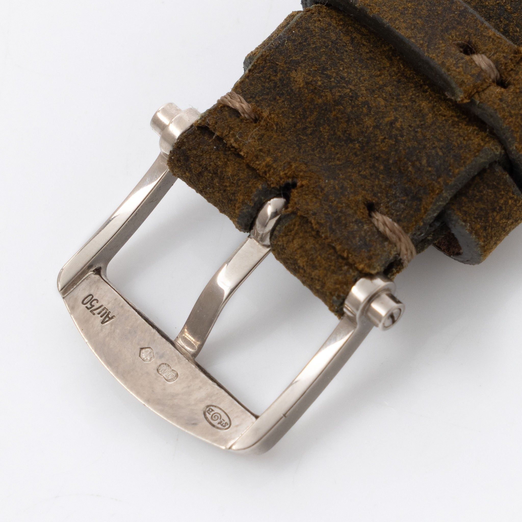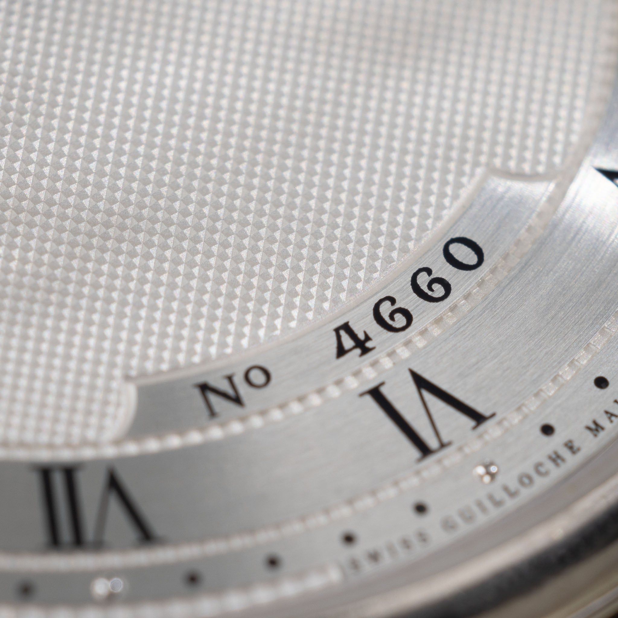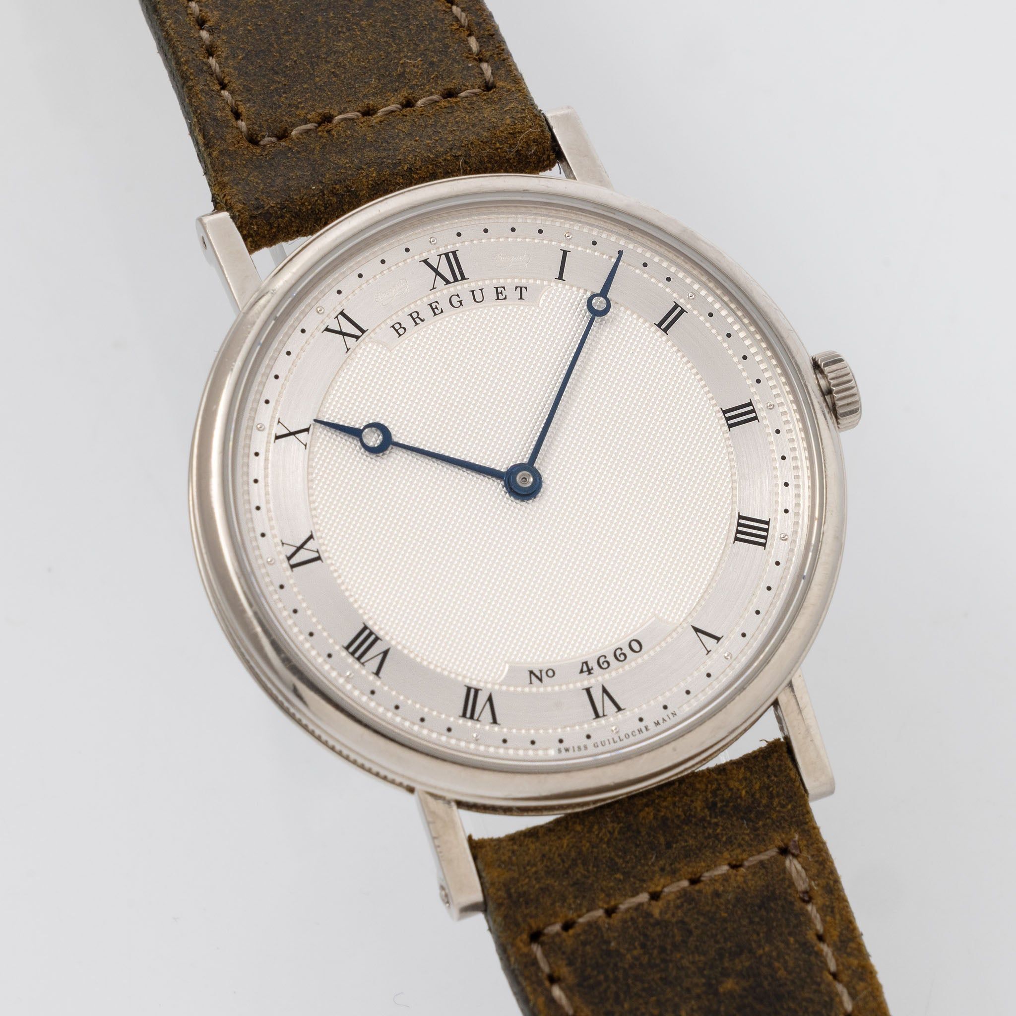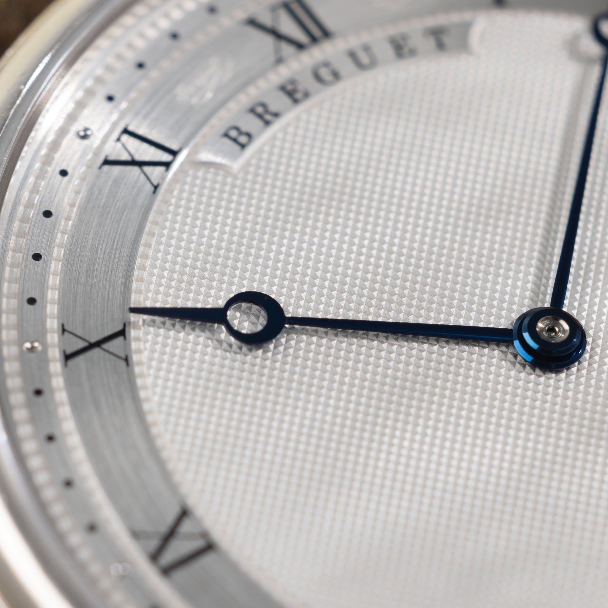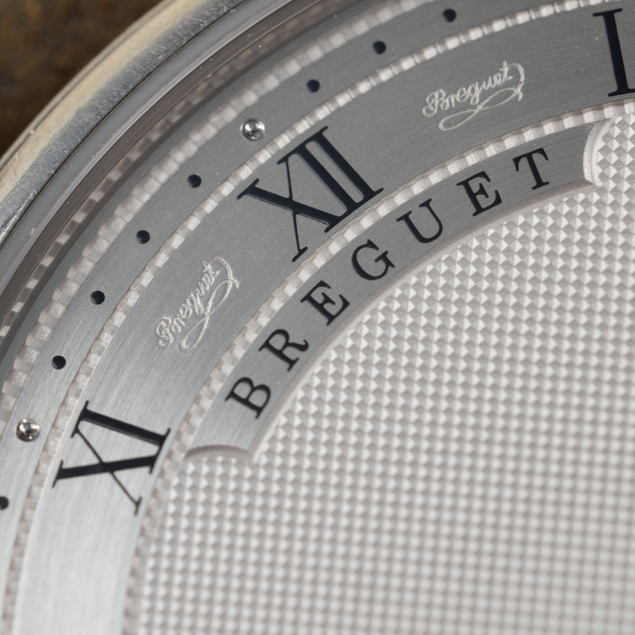 Breguet was founded in 1775 by Abraham-Louis Breguet in Paris and quickly became a name synonymous with innovation, attracting a clientele that included European royalty. Among his many groundbreaking inventions were the tourbillon and, of course, the iconic “Breguet” style hands. This elegant 18k white gold Classique dress watch features an ultra-thin 38 mm case with Breguet’s signature coin-edge fluting along the sides, a display caseback, and—stealing the spotlight—a beautifully hand-finished, silvered two-tone guilloché dial. It showcases a double minute track with a brushed finish, refined Roman numerals, and an inner hobnail pattern. With no date and no seconds, the dial is a clean, pure expanse punctuated only by the blued Breguet “apple” hands. Simply stunning. Breguet has a long-standing tradition of crafting these guilloché dials. The brand still uses machines dating back to the 19th century, requiring exceptional steadiness and precise hand–eye coordination. The dials are made from gold and then silvered after the guillochage process. As noted, the watch features a sapphire display caseback offering a full view of the automatic calibre 502.3—another delight for the eyes. This dapper piece is paired with a handsome Bulang & Sons strap and fitted with its original 18k white gold Breguet pin buckle and has been fully serviced by our watch maker. This watch embodies the idea that “less is more,” making it a strong contender for the ultimate dress watch. Specifications: Breguet Classique reference 5157 38 mm 18k white gold case, coin-edge case -with display case back Serial 46xx dating to ca 2019 Silvered Guilloché dial with original blued Breguet hands Automatic-wind calibre 502.3 Bulang and sons leather strap with Original Breguet 18k white-gold pin buckle Fully serviced by our watchmaker One-year mechanical warranty Free worldwide FedEx Priority shipping