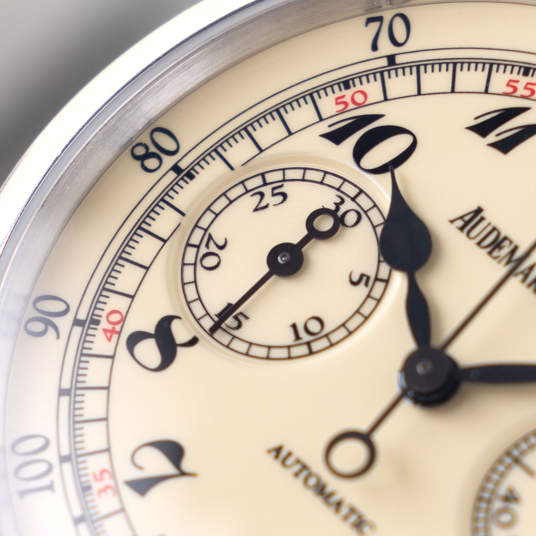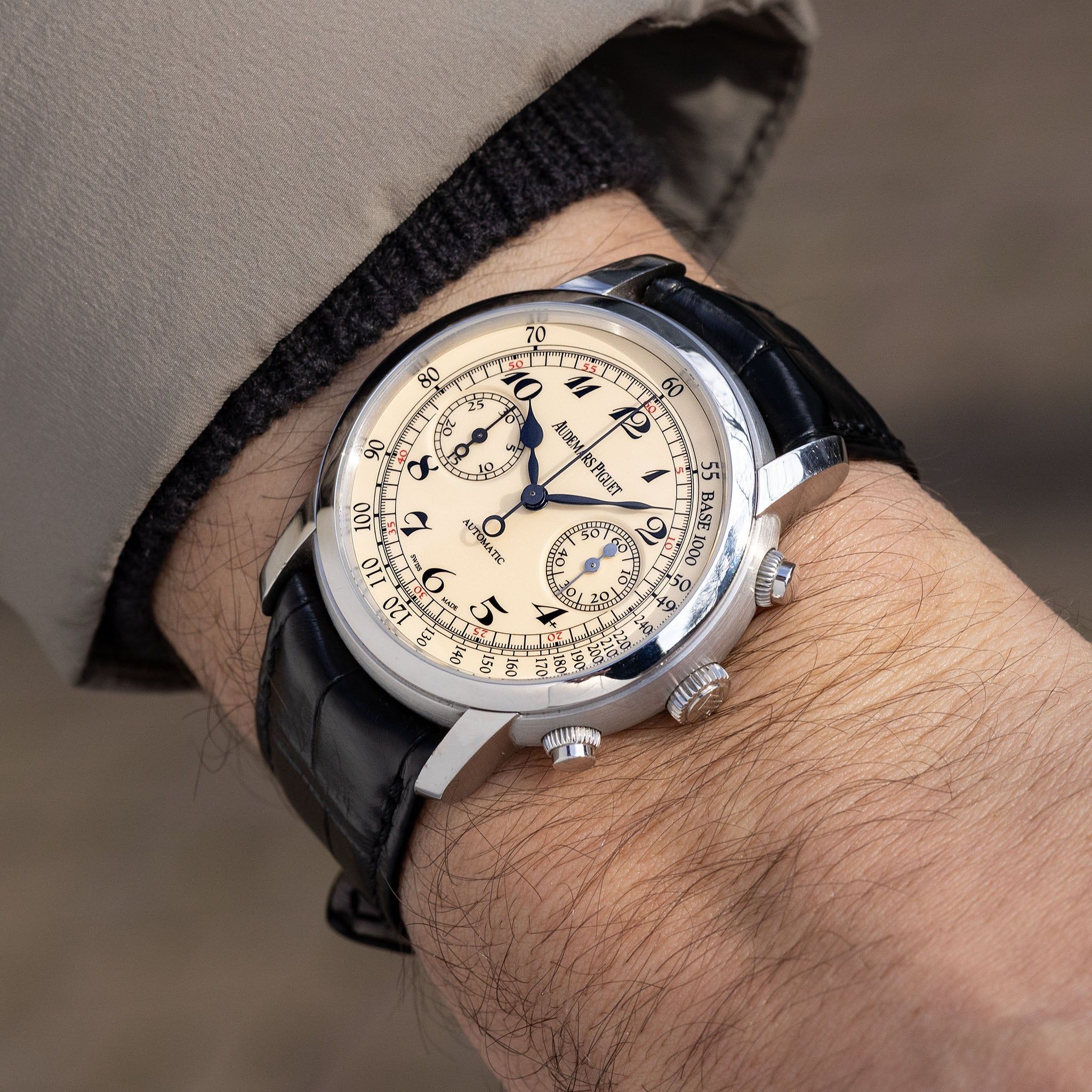 This handsome chronograph series was introduced in the Jules Audemars collection in 2008, featuring the first automatic-wound calibre in the line and paying homage to one of the company’s founders, Jules Louis Audemars. This specimen features a satin-brushed 18k white-gold case measuring 41 mm, with elegant pushers and a display case back. We particularly adore this eggshell—or better yet, cream-coloured—dial, which carries distinct Art Deco details, such as the font used on the base-1000 outer scale and the romantic glossy black Arabic numerals. Other notable details include the two recessed sub-dials, with a glossy black chronograph hand on the left counter and a polished metal hand on the right. Speaking of hands: they are blackened, with a spade-shaped hour hand and a minute hand that is reminiscent of a spear. A small splash of red on the minute track gives the dial a subtle touch of visual “pop”! Another show-stopper is visible on the back of the watch, where you have a clear view of the calibre 3124, complete with a beautifully crafted gold rotor engraved and decorated with various elements—more lively detailing from AP. The watch is paired with a lightly worn Audemars Piguet leather strap with an 18k white-gold AP folding clasp. Furthermore, this piece comes with its original AP warranty and registration certificate booklet, stating a sale in 2014 in New York City, United States. The watch has been fully serviced by our watchmaker and is ready for the years to come. This watch should be a real contender if you are looking for an understated, beautiful, and currently somewhat undervalued luxury chronograph—get in touch! Specifications: Audemars Piguet Jules Audemars chronograph reference 26100BC 41 mm 18k white gold case with display case back Case number H93xxx, dating to circa 2012 Cream dial with dual chrono registers, black painted Breguet numerals and black hands Automatic wound caliber 3124 with decorated gold rotor Comes on the pictured Audemars ' leather strap with 18 k white gold folding clasp Original AP warranty and registration certificate booklet, stating a sale in 2014 in New York City Fully serviced by our watchmaker One-year mechanical warranty Free worldwide FedEx Priority shipping
