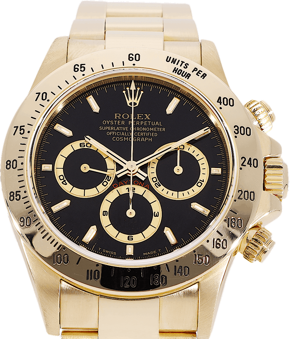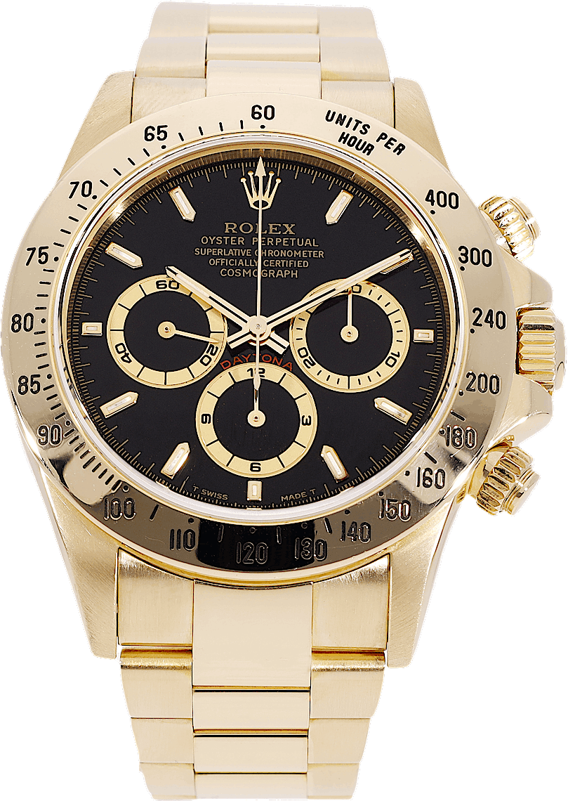 Rolex Cosmograph Daytona Zenith, Reference: 16528, Gender: Unisex, Size: 40mm, Dial color: Black, Strap material: Yellow Gold, Movement: Automatic, Condition: Previously worn with some signs of usage. The movement is flawless and the case has been cleaned. watch tested to ensure full functionality. An inspection by our certified watchmakers guarantees its authenticity., Documents: Chronext Certificate