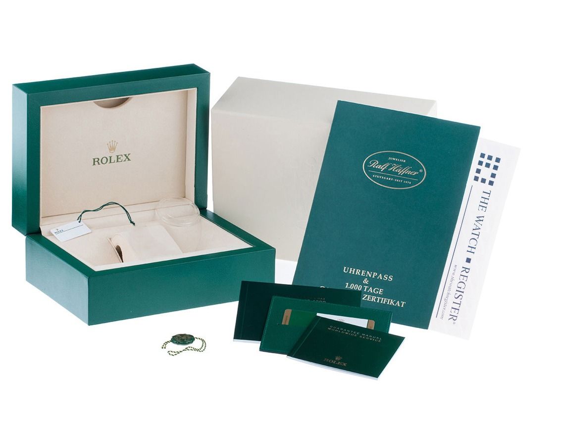 Inklusive Uhrenpass mit einem Farbbild, der genauen Beschreibung sowie dem Wiederbeschaffungswert der Uhr über 14500,-€ und 1000 Tage Garantie ab Kaufdatum.