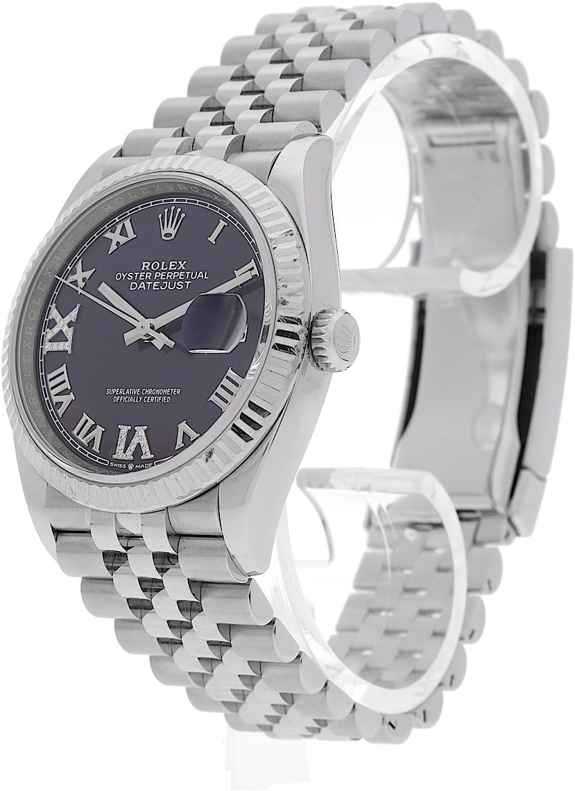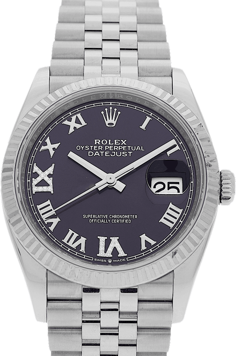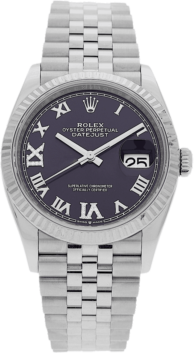 Rolex Datejust, Reference: 126234, Gender: Unisex, Size: 36mm, Dial color: Violet, Strap material: Stainless Steel, Movement: Automatic, Condition: Previously worn, minor to no signs of usage. The movement is flawless and the case has been cleaned. watch tested ensure full functionality. An inspection by our certified watchmakers guarantees its authenticity., Documents: Original papers, CHRONEXT Certificate
