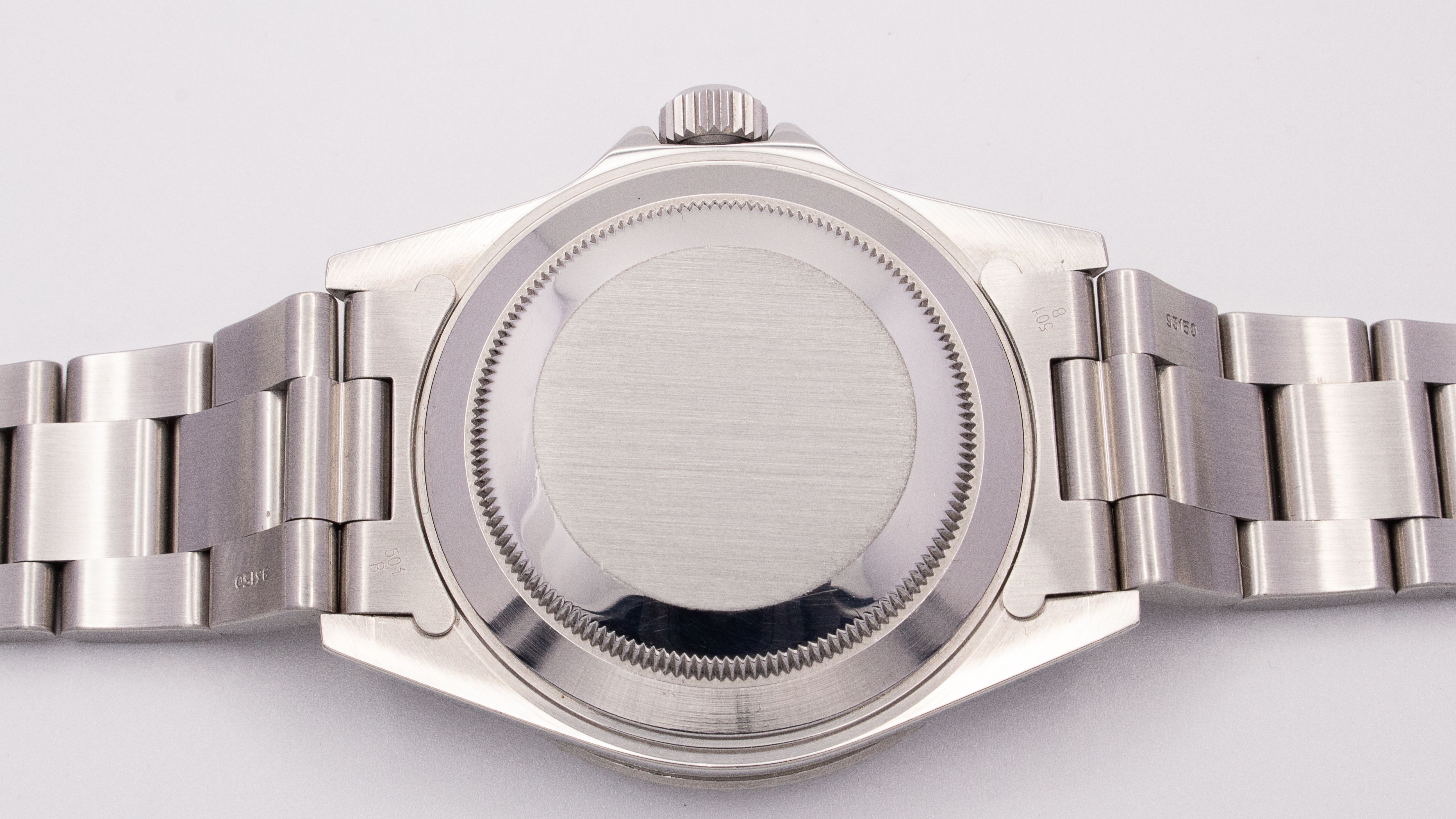 Im Inneren arbeitet das bewährte Rolex Kaliber 3130 mit hervorragenden Gangwerten von 0 Sek./Tag und einer sehr starken Amplitude von 283°, gemessen in der Lage Zifferblatt oben.
