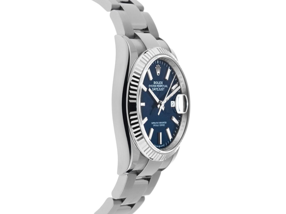 Gehäuse Edelstahl poliert und satiniert, Gehäusedurchmesser ohne Krone 36mm, Gehäusehöhe 11,7mm. Lünette 18kt Weißgold geriffelt und poliert. Armband Oyster Edelstahl poliert und satiniert, Faltschließe Edelstahl mit Hersteller-Logo. Zifferblatt blau mit weißgoldenen Leuchtindexen und weißgoldenen Leuchtzeigern. Uhrwerk Automatik, Chronometer mit Zeugnis, Rolex Manufakturkaliber 3235 mit 31 Edelsteinen, Gangreserve ca. 70 Stunden. Anzeige von Stunde, Minute und Sekunde über Zeiger aus der Mitte mit Sekundenstopp zur sekundengenauen Einstellung der Uhrzeit, Datumsanzeige mit Schnellverstellung unter Glaslupe bei 3 Uhr. Saphirglas kratzfest. Krone verschraubbar mit Hersteller-Logo. Boden Edelstahl verschraubt. Gewicht der Uhr inklusive Armband 126g, Länge des Armbandes inklusive Gehäuse 175mm. Referenznummer: 126234, ID: P2160182121225H-13500/9200, Artikelnummer: 10000084090. Original Rolex Box mit Umkarton und Garantie Papiere von Dezember 2024, neue Rolex Garantie Karte ohne Ländercode sowie Beschreibung, Ledermäppchen, Rolex Chronometer-Siegel und Watchregister Auszug von Dezember 2025, The Watch Register Zertifikat / ohne Eintrag (Internationale Datenbank für verlorene oder gestohlene Uhren), Full Set. Kapitalanlage mit Wertsteigerungspotential. Ungetragen. Lieferzeit sofort.