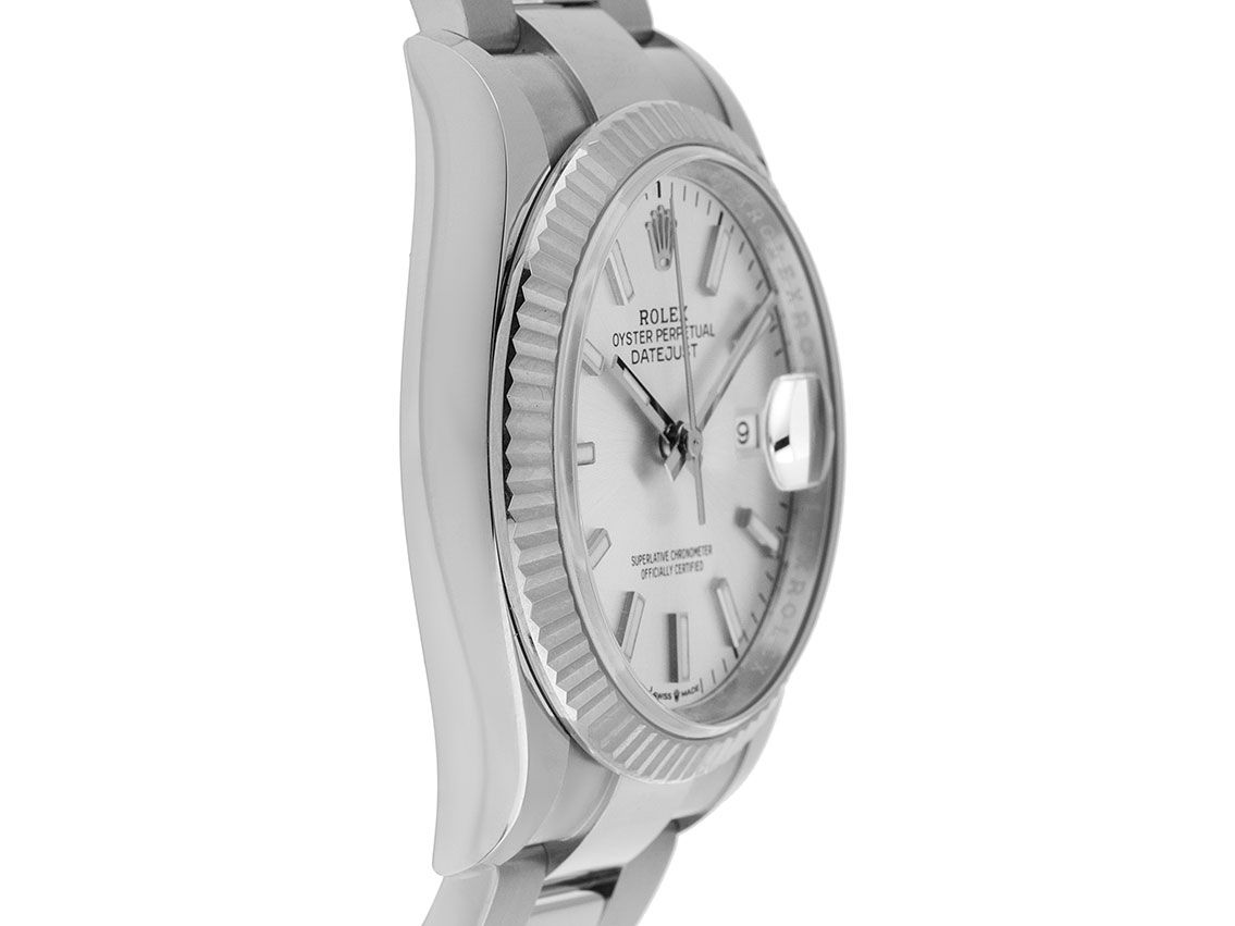 Gehäuse Edelstahl poliert und satiniert, Gehäusedurchmesser ohne Krone 36mm, Gehäusehöhe 11,7mm. Lünette 18kt Weißgold geriffelt und poliert. Armband Oyster Edelstahl poliert und satiniert, Faltschließe Edelstahl mit Hersteller-Logo. Zifferblatt silberfarben mit weißgoldenen Indexen und weißgoldenen Zeigern. Uhrwerk Automatik, Chronometer mit Zeugnis, Rolex Manufakturkaliber 3235 mit 31 Edelsteinen. Anzeige von Stunde, Minute und Sekunde über Zeiger aus der Mitte mit Sekundenstopp zur sekundengenauen Einstellung der Uhrzeit, Datumsanzeige mit Schnellverstellung unter Glaslupe bei 3 Uhr. Saphirglas kratzfest. Krone verschraubbar mit Hersteller-Logo. Boden Edelstahl verschraubt. Gewicht der Uhr inklusive Armband 127g, Länge des Armbandes inklusive Gehäuse 175mm. Referenznummer: 126234, Gehäusenummer: 83L8NXXX, ID: P2159175001225H-12800/9450, Artikelnummer: 10000084086. Mit Gangkontrolle und kompletter äußerlicher Aufarbeitung von Dezember 2025. Original Rolex Box mit Umkarton und Garantie Papiere von Juli 2021, neue Rolex Garantie Karte ohne Ländercode, Beschreibung, Ledermäppchen, Rolex Chronometer-Siegel und Watchregister Auszug von Dezember 2025, The Watch Register Zertifikat / ohne Eintrag (Internationale Datenbank für verlorene oder gestohlene Uhren), inkl. Erstkaufrechnung und Vita von Juli 2025, Full Set. Kapitalanlage mit Wertsteigerungspotential, wie Neu. Lieferzeit sofort.