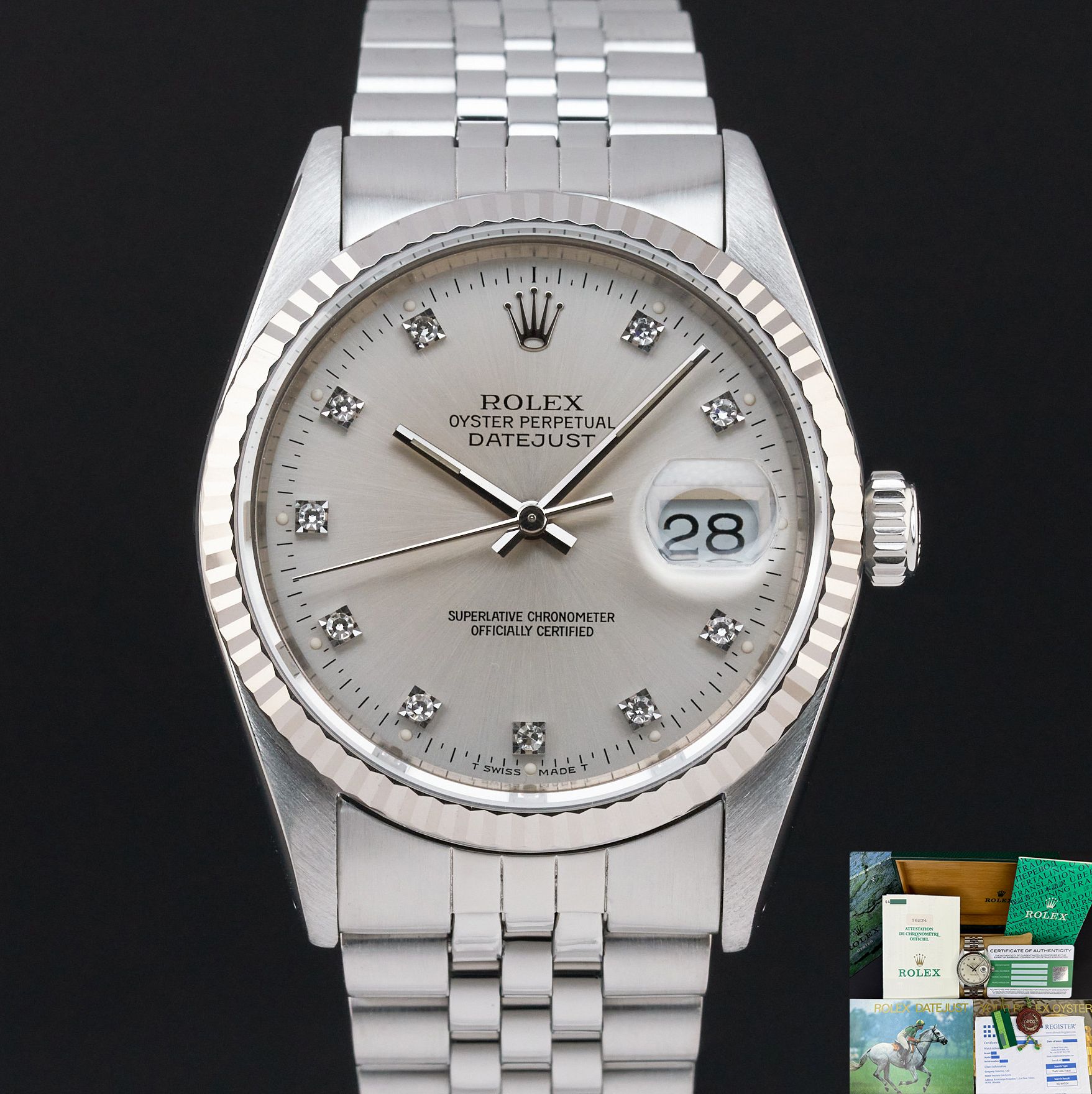 Rolex Datejust, 16234, 36mm, 1993, Steel, Silver Small Diamond dial, Fullset, 1y warranty