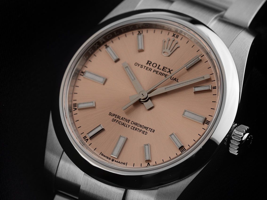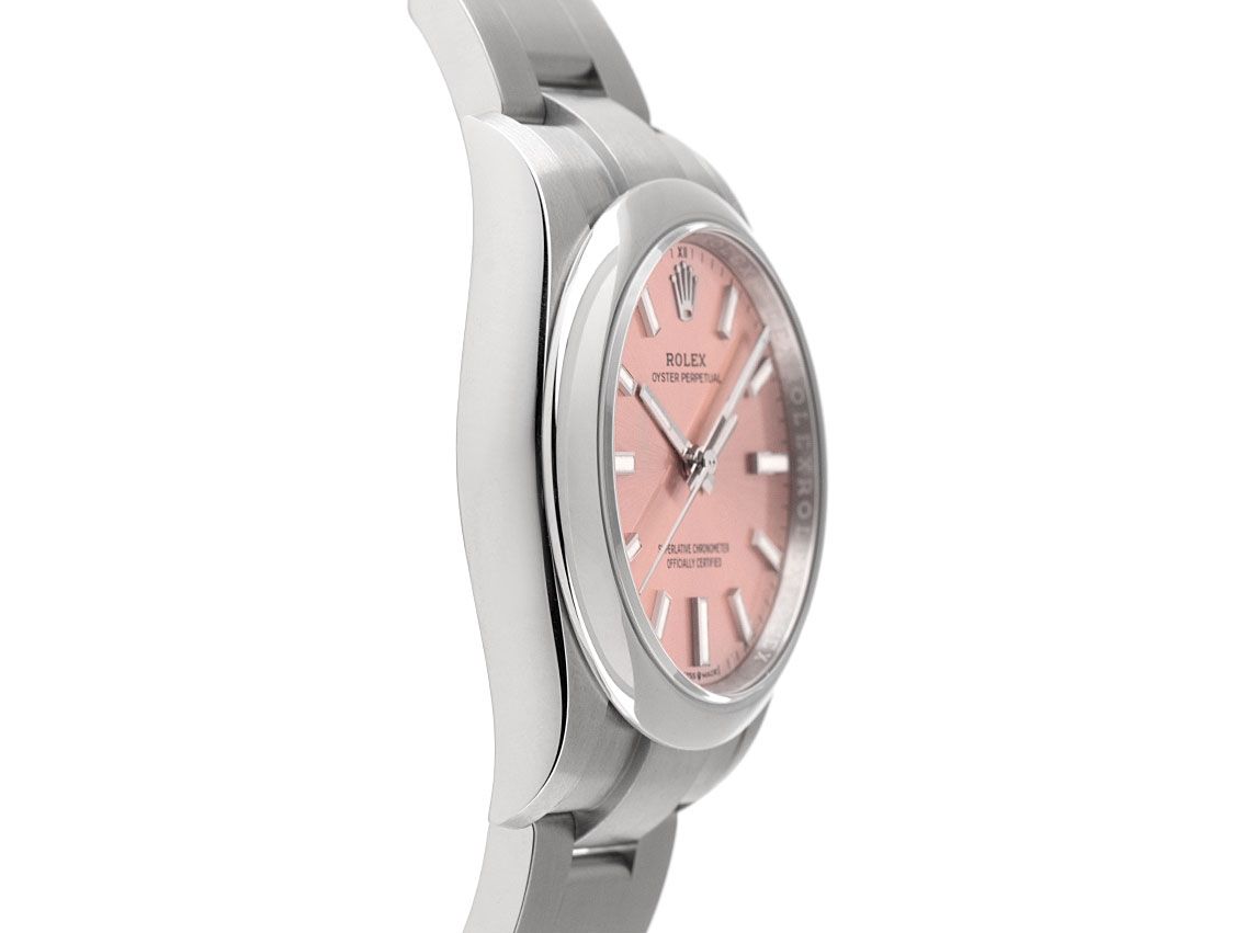 Gehäuse Edelstahl poliert und satiniert, Gehäusedurchmesser ohne Krone 34mm, Gehäusehöhe 10,7mm. Lünette Edelstahl glatt und poliert. Armband Oyster Edelstahl poliert und satiniert, Faltschließe Edelstahl mit Hersteller-Logo. Zifferblatt roséfarben mit aufgesetzten weißgoldenen Leuchtindexen und weißgoldenen Leuchtzeigern. Uhrwerk Automatik, Chronometer mit Zeugnis, Rolex Manufakturkaliber 2232 mit 31 Edelsteinen, Gangreserve ca. 55 Stunden. Anzeige von Stunde, Minute und Sekunde über Zeiger aus der Mitte mit Sekundenstopp zur sekundengenauen Einstellung der Uhrzeit. Saphirglas kratzfest. Krone verschraubbar mit Hersteller-Logo. Boden Edelstahl verschraubt. Gewicht der Uhr inklusive Armband 104g, Länge des Armbandes inklusive Gehäuse 175mm. Wasserdicht bis 10 ATM. Referenznummer: 124200, Gehäusenummer: 696V3XXXX, ID: P2232145520126H-11800, Artikelnummer: 10000084212. Mit Gangkontrolle und kompletter äußerlicher Aufarbeitung von Januar 2026. Original Rolex Box mit Umkarton und Garantie Papiere von Dezember 2022, neue Rolex Garantie Karte ohne Ländercode sowie Beschreibung, Ledermäppchen, Rolex Chronometer-Siegel und Watchregister Auszug von Januar 2026, The Watch Register Zertifikat / ohne Eintrag (Internationale Datenbank für verlorene oder gestohlene Uhren), Full Set. Superschnäppchen, Kapitalanlage mit Wertsteigerungspotential, aus erster Hand, fast nicht getragen, ausverkauftes Sammlerstück wird nicht mehr hergestellt. Wie Neu. Lieferzeit sofort.