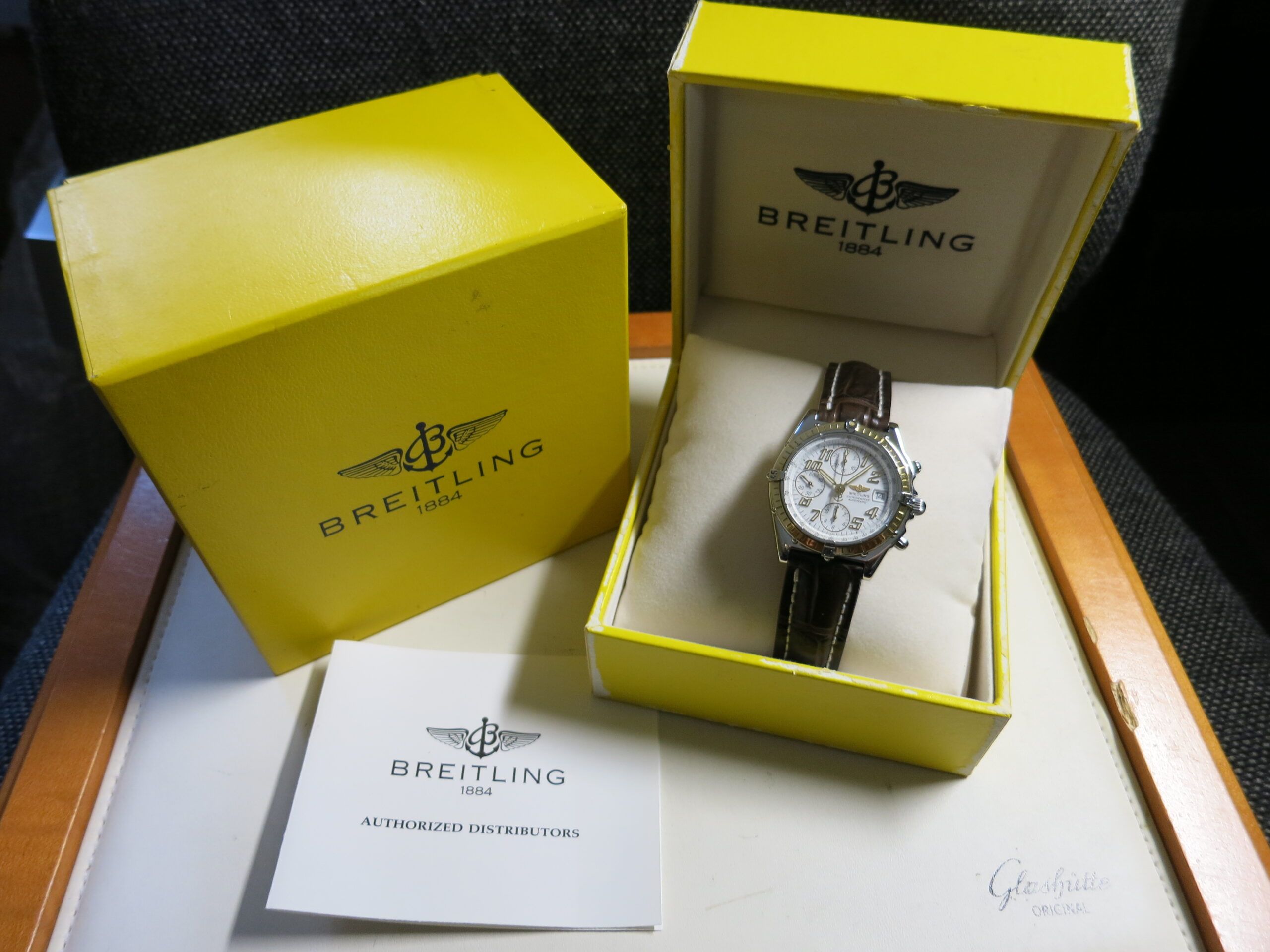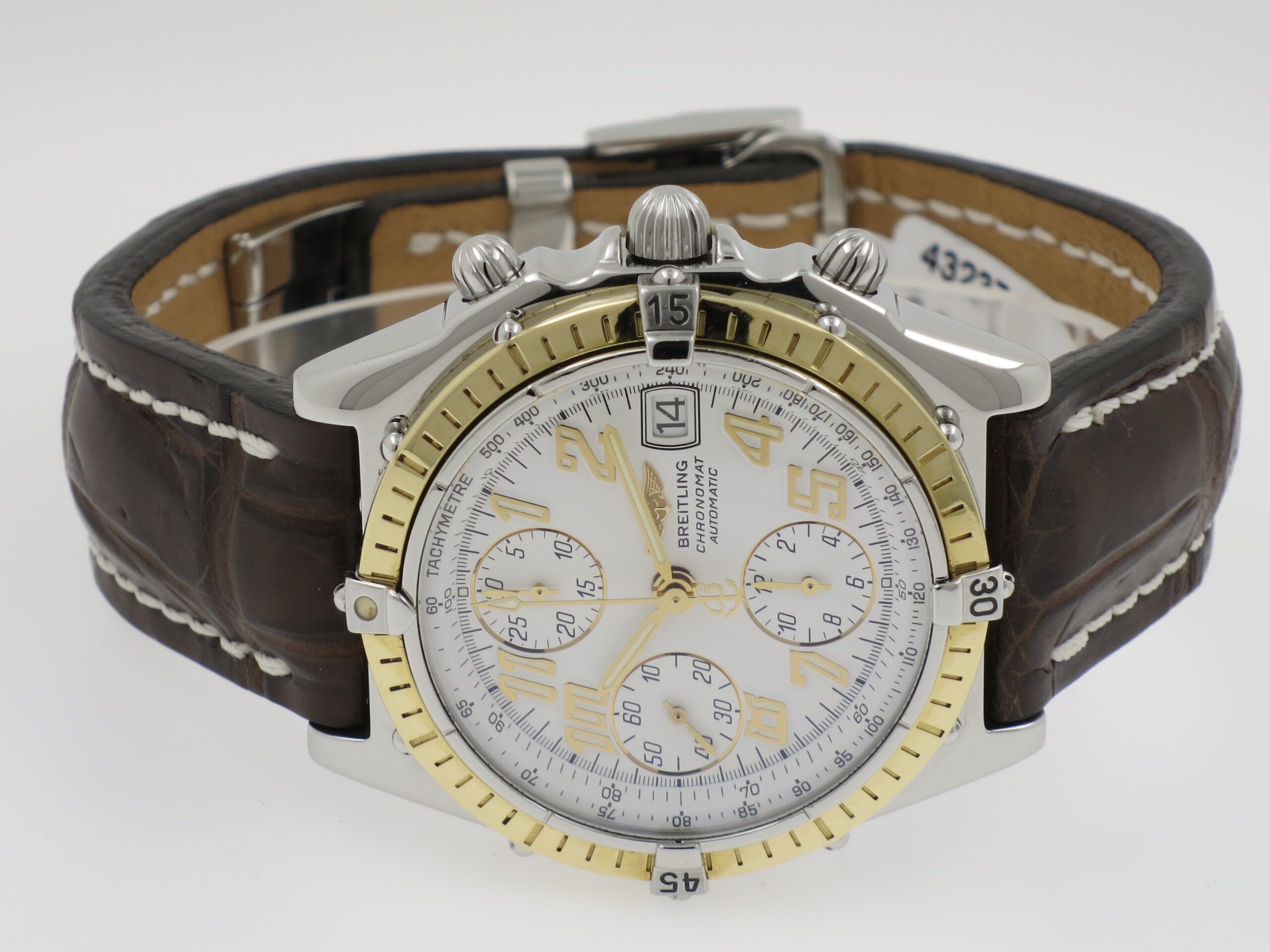 Breitling Chronomat Vitesse" 18K (750) golden bezel on steel 39mm. case Vitesse dial. Beautiful white dial in a 45 mm gold/steel case with yellow gold bezel. Shipping immediately upon receipt of payment. Our photos are NOT edited! What you see is what you get. Shipped registered and insured with Fedex Priority.