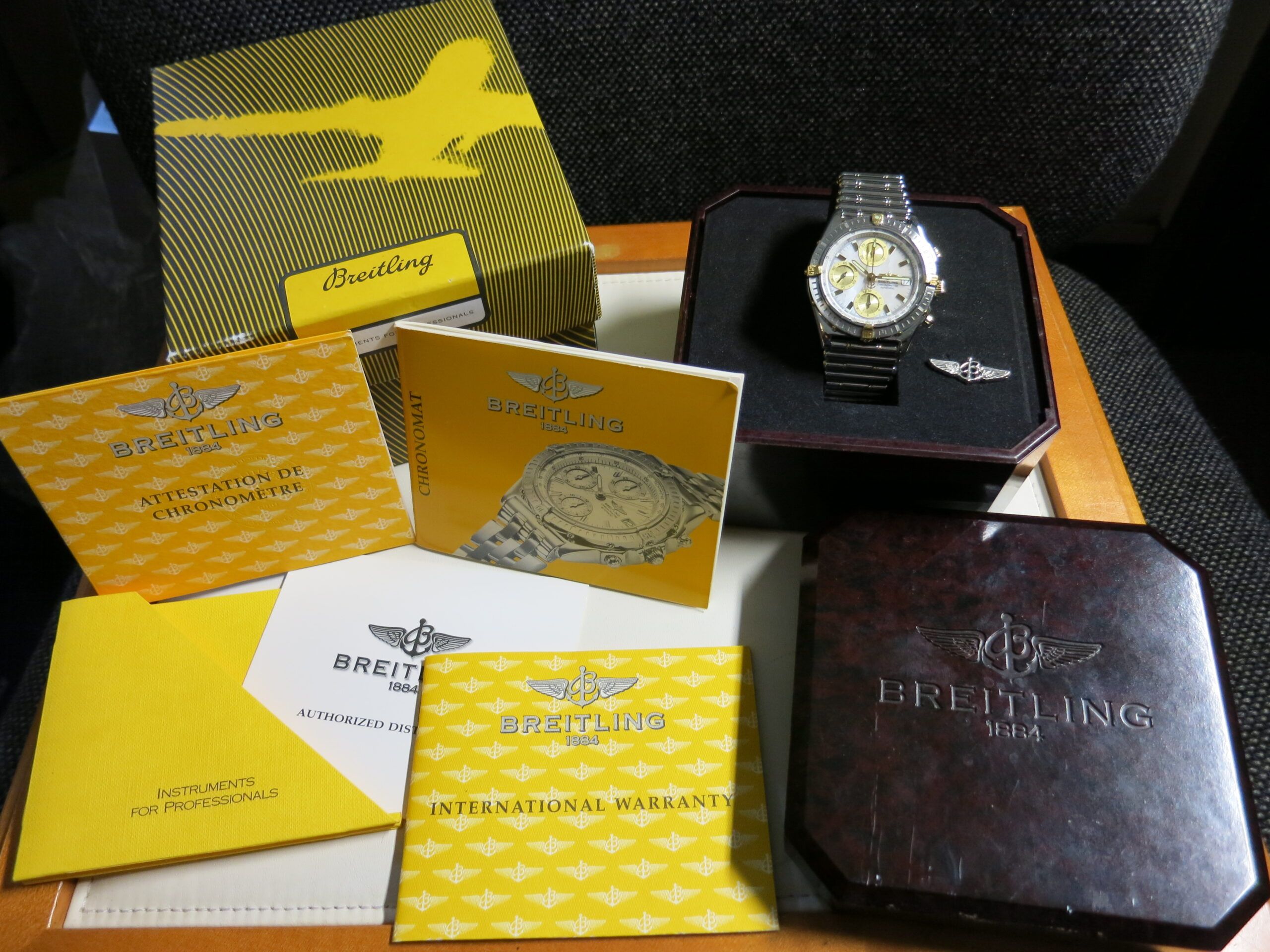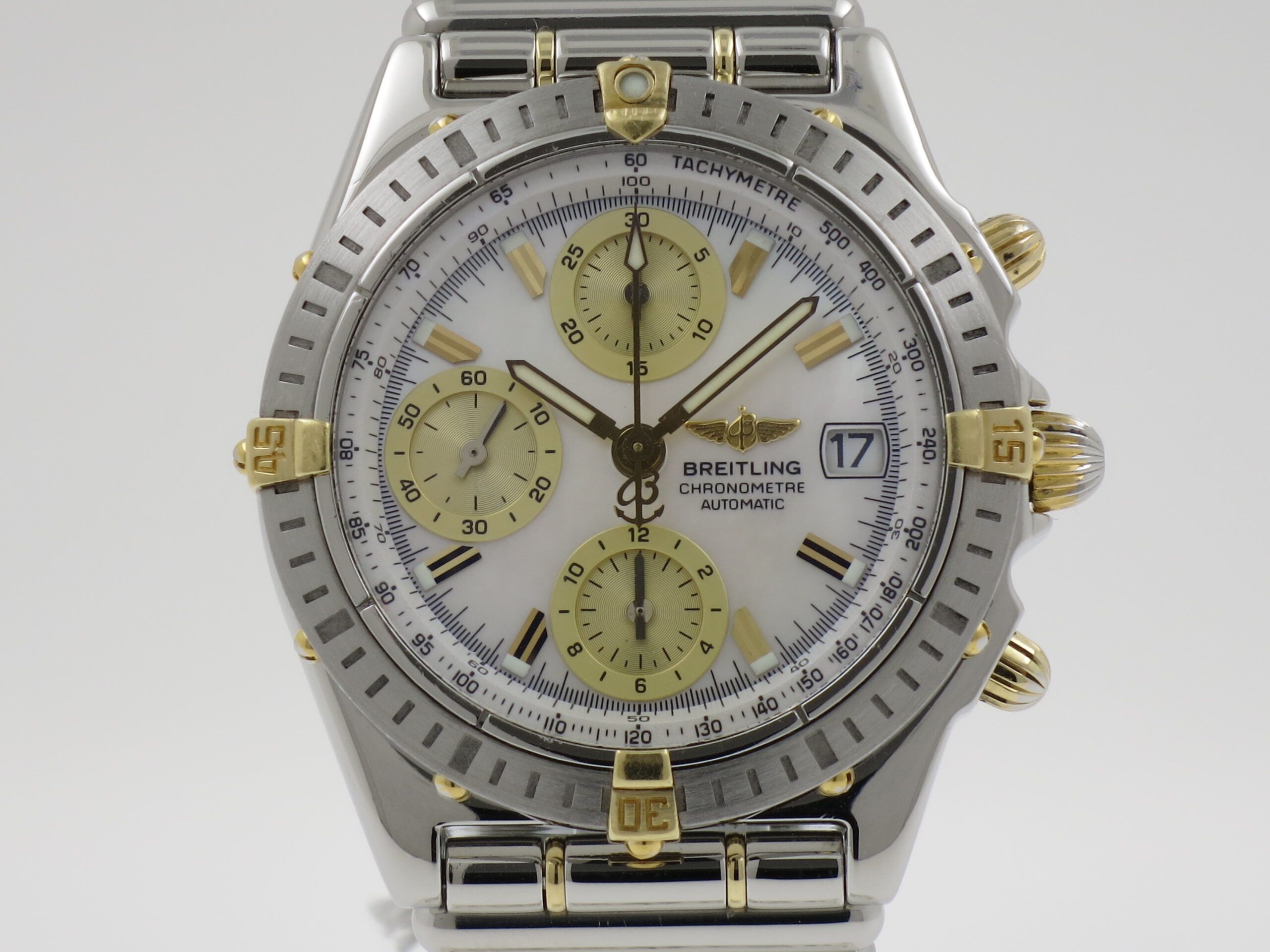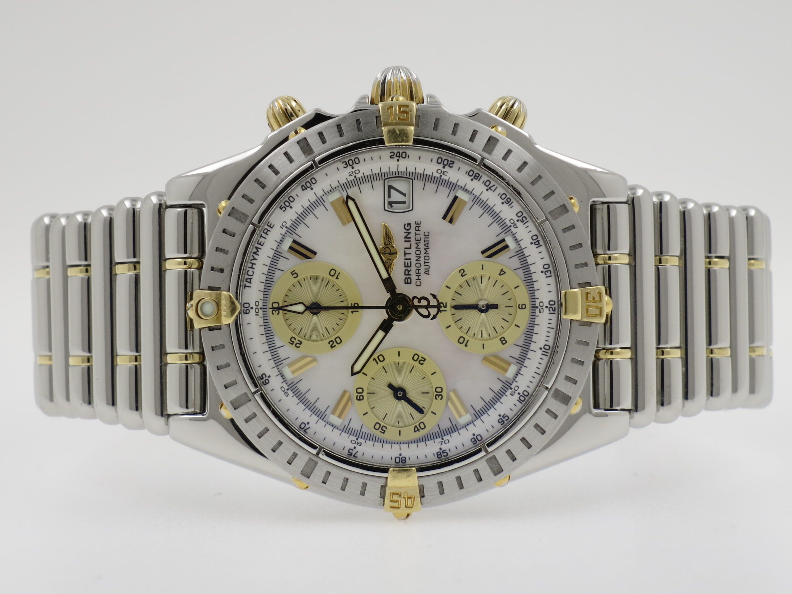 Breitling Chronomat Automatic" Gold/steel case MOP dial gold/steel Rouleaux bracelet. Beautiful mother of pearl dial in a 39 mm gold/steel case with gold/steel bezel. Shipping immediately upon receipt of payment. Our photos are NOT edited! What you see is what you get. Shipped registered and insured with Fedex Priority.