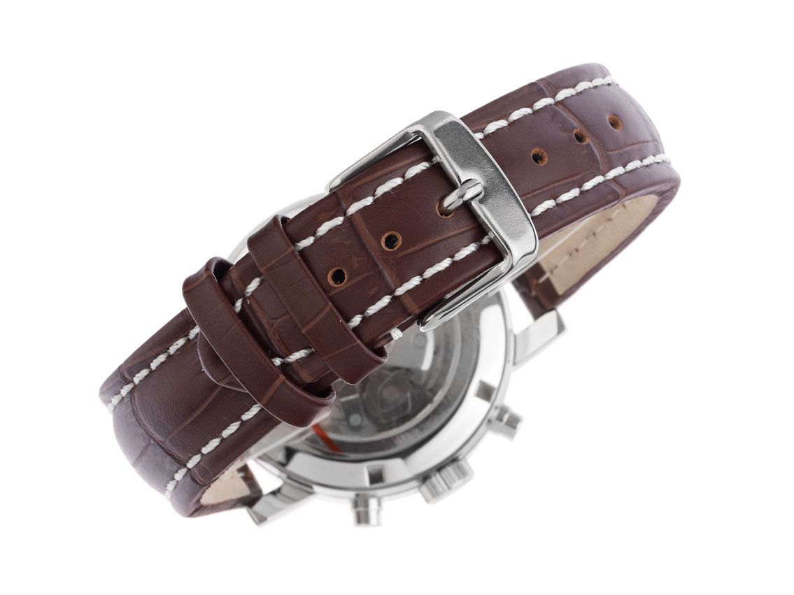 Gehäuse Edelstahl poliert, Gehäusedurchmesser ohne Krone 40,5mm, Gehäusehöhe 15,8mm. Lünette Edelstahl glatt und poliert. Armband Leder braun mit weißer Ziernaht, Anstoßbreite 20mm, Stiftschließe Edelstahl. Zifferblatt weiß mit beiger Minuterie, aufgesetzten arabischen Edelstahl Ziffern und Punktindexen sowie polierten Edelstahl Zeigern. Uhrwerk Automatik, Chronograph, Kaliber Valjoux 7750 mit 25 Edelsteinen. Anzeige von Stunde und Minute über Zeiger aus der Mitte, Datums- und Wochentaganzeige in Deutsch mit Schnellverstellung bei 3 Uhr. Saphirglas kratzfest und gewölbt. Krone geriffelt. Boden Edelstahl verschraubt und graviert mit Saphirglas Sichtfenster. Gewicht der Uhr inklusive Armband 101g. ID: P229014000126H-3200, Artikelnummer: 10000084284. Mit Gangkontrolle und kompletter äußerlicher Aufarbeitung von Januar 2026. Original Box und Garantie Papiere von November 2017, Full Set. Superschnäppchen, aus erster Hand, fast nicht getragen. Wie Neu. Lieferzeit sofort.