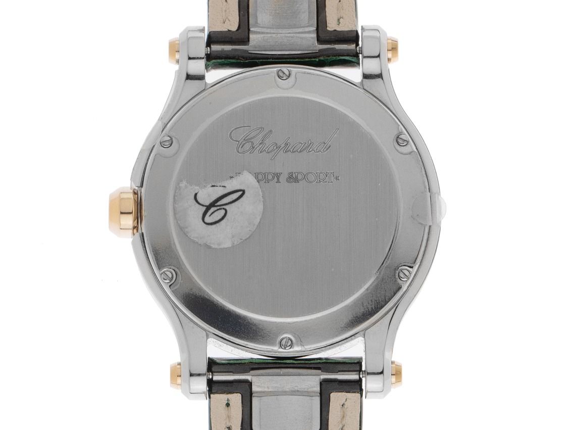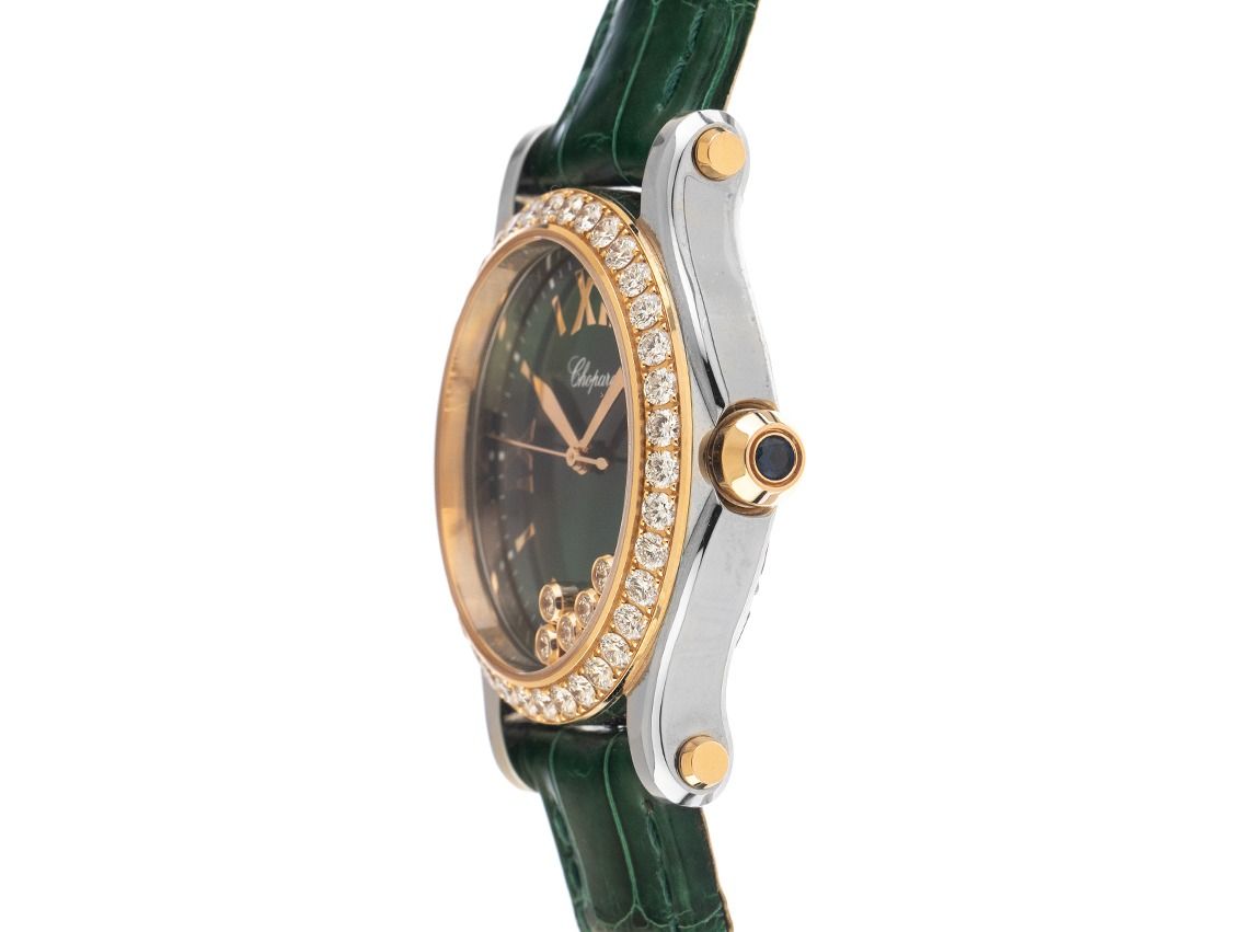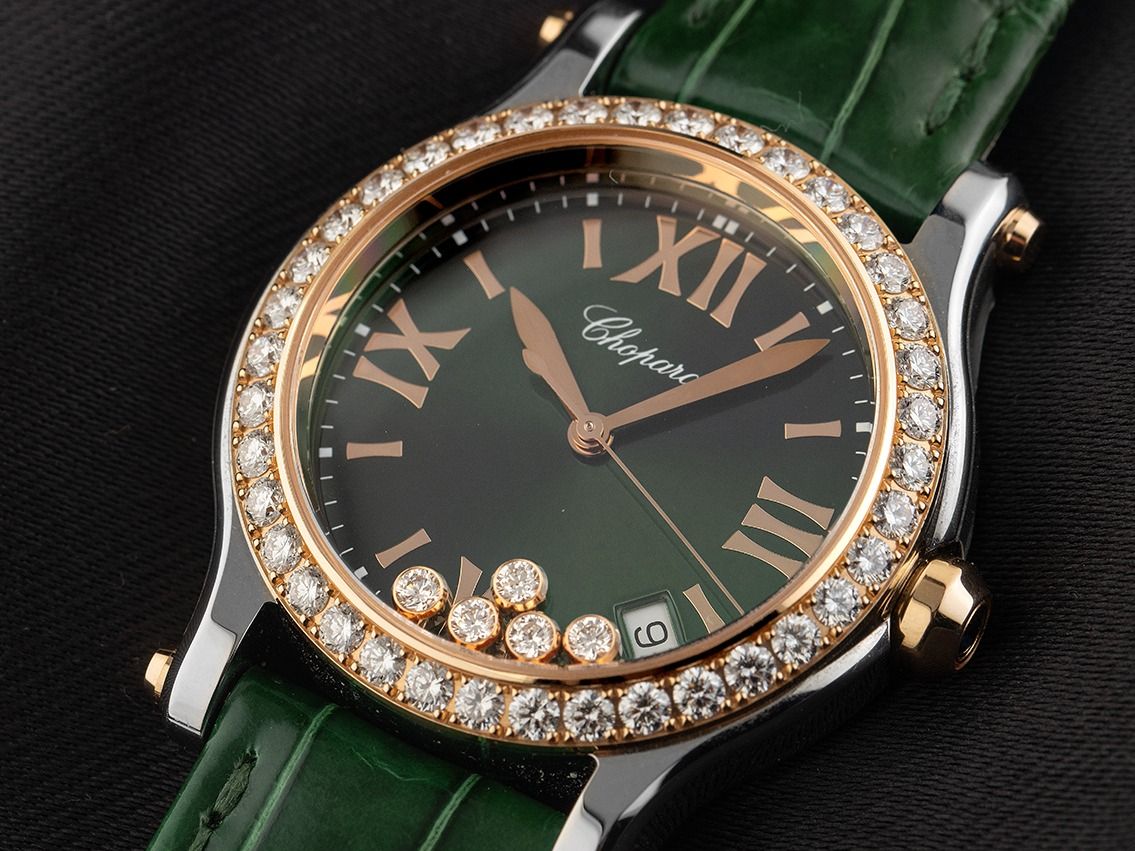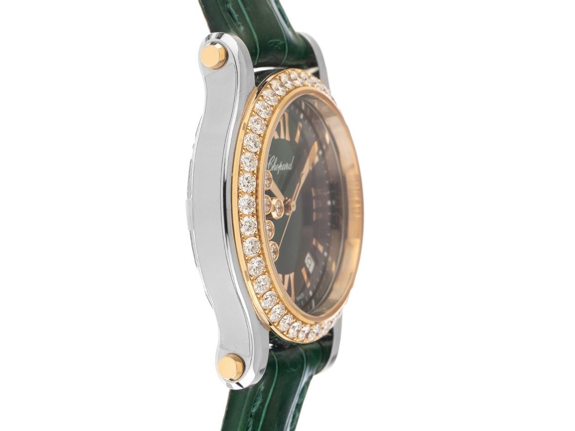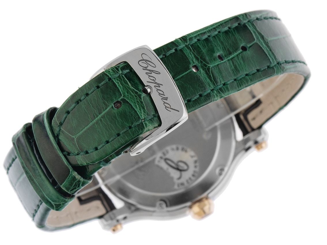 Edelstahl poliert, Gehäusedurchmesser ohne Krone 36mm, Gehäusehöhe 10,7mm. Lünette 18kt Roségold mit 38 Diamanten besetzt, zusammen ca. 1,96ct TW / IF -VVS (feines Weiß mit Lupenreinen bis sehr sehr kleinen Einschlüssen). Armband Krokoleder grün mit Ziernaht, Anstoßbreite 18mm, Chopard Stiftschließe Edelstahl mit Hersteller-Logo. Zifferblatt grün mit 5 beweglichen Brillanten 0,24ct TW / IF -VVS (feines Weiß mit Lupenreinen bis sehr sehr kleinen Einschlüssen), aufgesetzten roségoldenen römischen Ziffern und Indexen sowie roségoldenen Zeigern. Uhrwerk quarzgesteuert, Kaliber Chopard mit 7 Edelsteinen. Anzeige von Stunde, Minute und Sekunde über Zeiger aus der Mitte mit Sekundenstopp zur sekundengenauen Einstellung der Uhrzeit, Datumsanzeige mit Schnellverstellung zwischen 4 und 5 Uhr. Saphirglas kratzfest. Krone mit Saphir Cabochon, 0,10ct. Boden Edelstahl 6-fach verschraubt und graviert. Gewicht der Uhr inklusive Armband 55g. Referenznummer: 278582-6007, ID: P2328140000126H-22200, Artikelnummer: 10000084357. Mit Gangkontrolle und kompletter äußerlicher Aufarbeitung von Januar 2026. Original Chopard Box mit Umkarton und Garantie Papiere von August 2021 sowie Beschreibung sowie Watchregister Auszug von Januar 2026, The Watch Register Zertifikat / ohne Eintrag (Internationale Datenbank für verlorene oder gestohlene Uhren), Full Set. Wie Neu. Lieferzeit sofort.