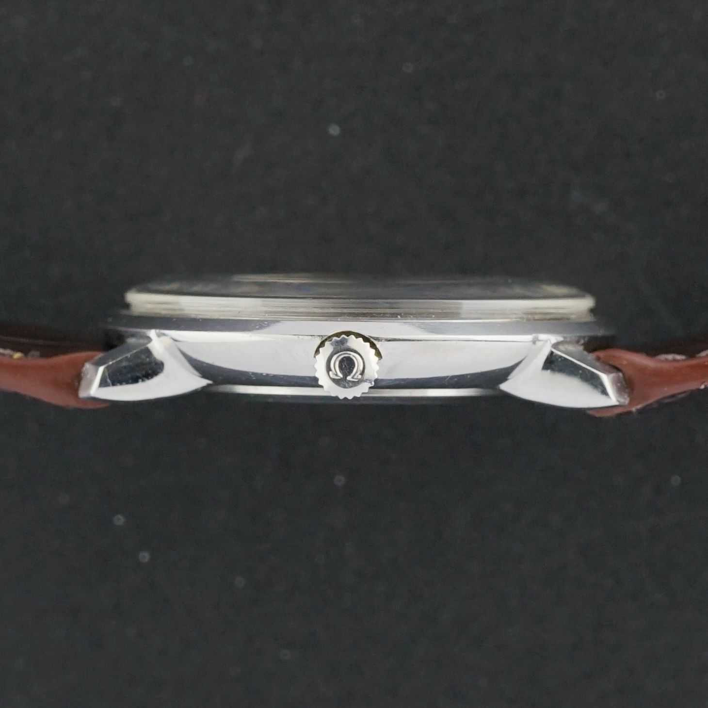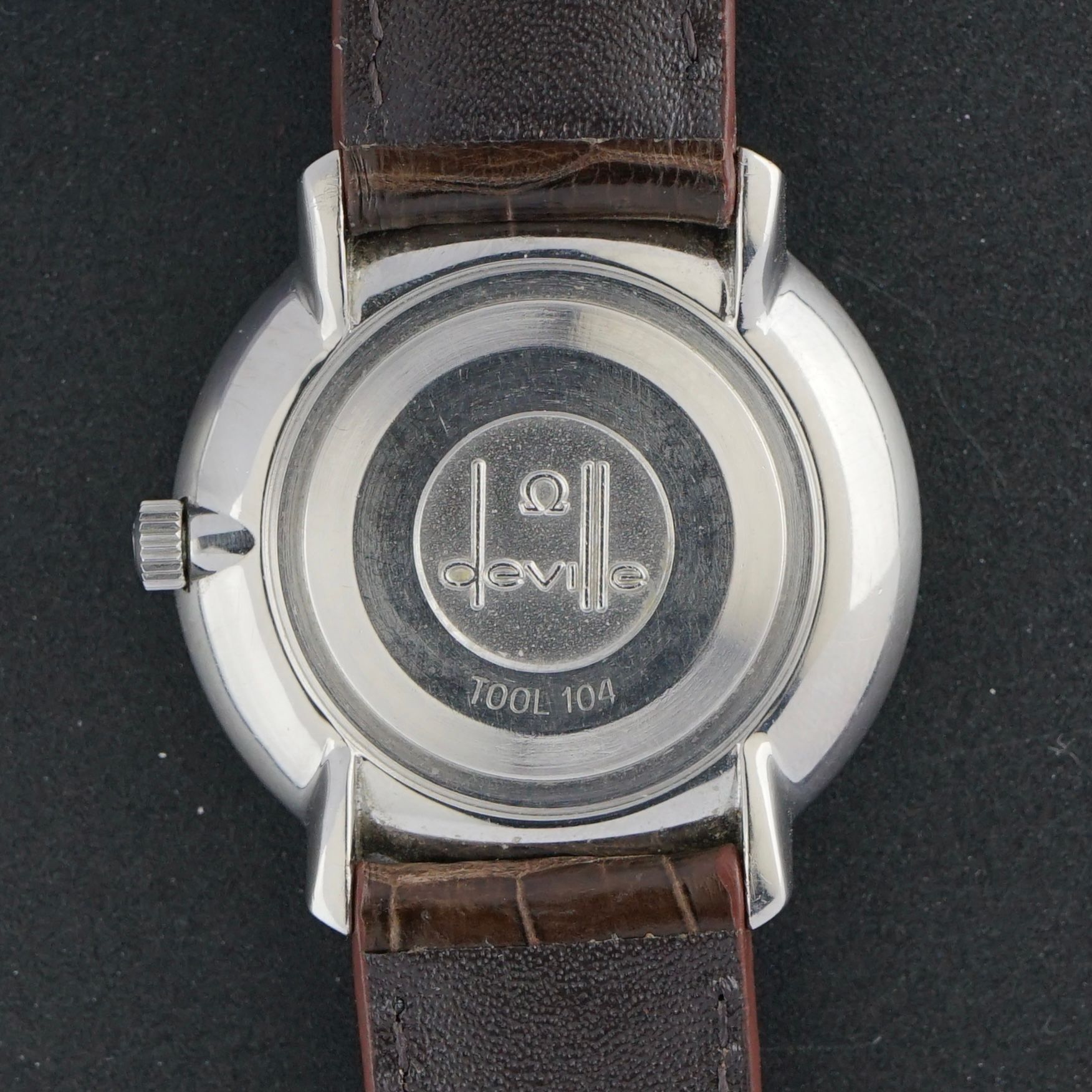 This vintage Omega De Ville from 1973 features a sleek, subtle, and elegant design with a 33mm monocoque case. The grey dial is in perfect condition, complemented by black hands and steel-and-black lacquer sandwich hour markers. Inside is a caliber 625 manual-wind movement, recently serviced in January 2026 and running flawlessly. It is paired with a top-grain leather strap with a crocodile motif, light glossy finish, and brown stitching. The watch is in excellent overall condition and entirely original, except for the newly fitted leather strap.