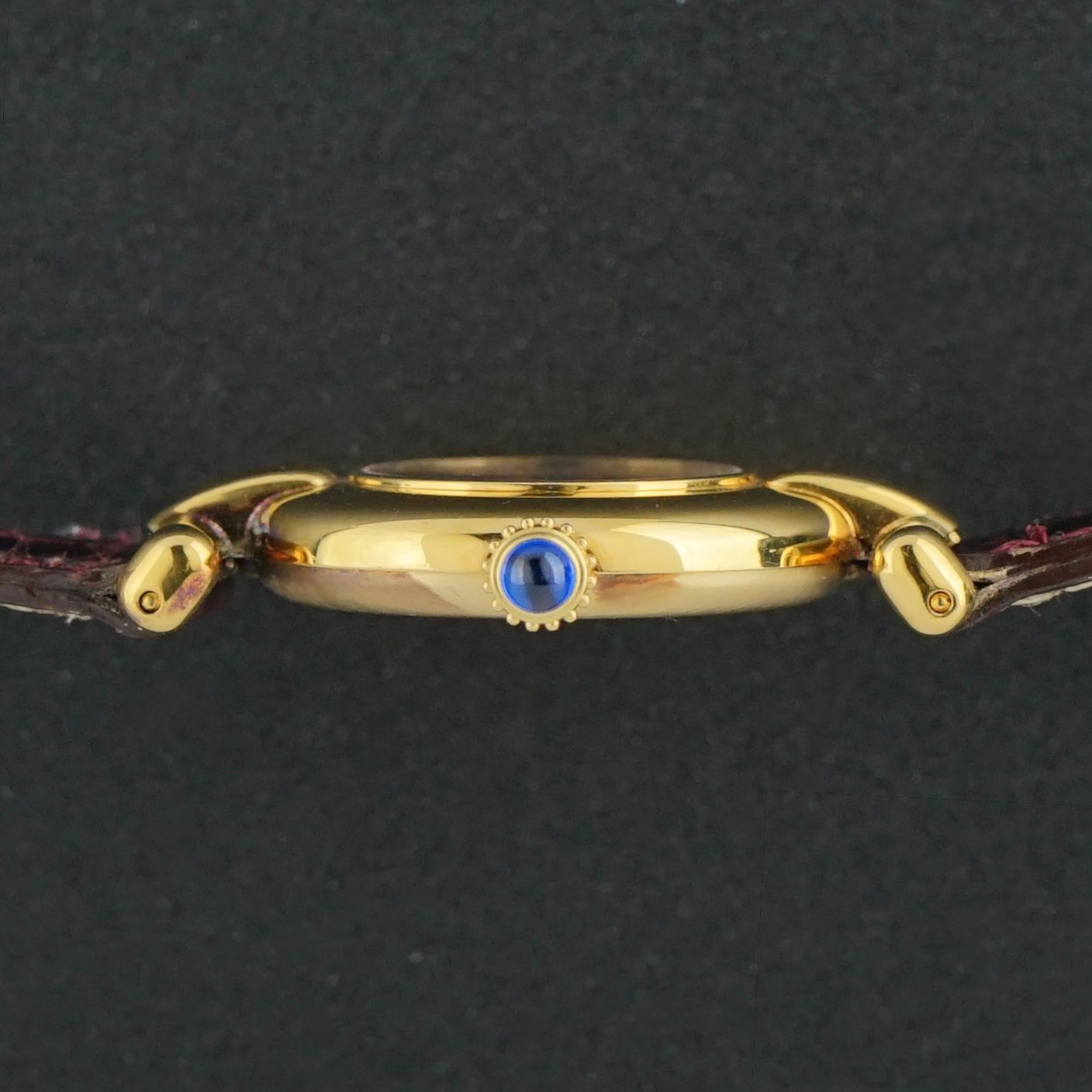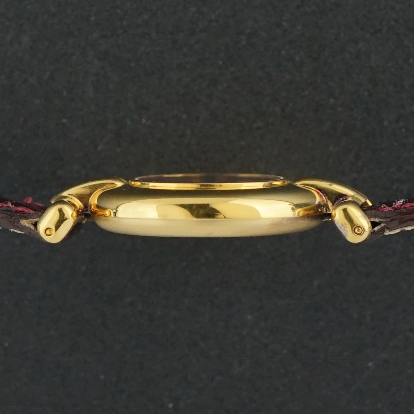 Strap: The original bordeaux red Cartier leather strap with crocodile motif and Cartier buckle. (Fits a 8 to 18cm wrist)