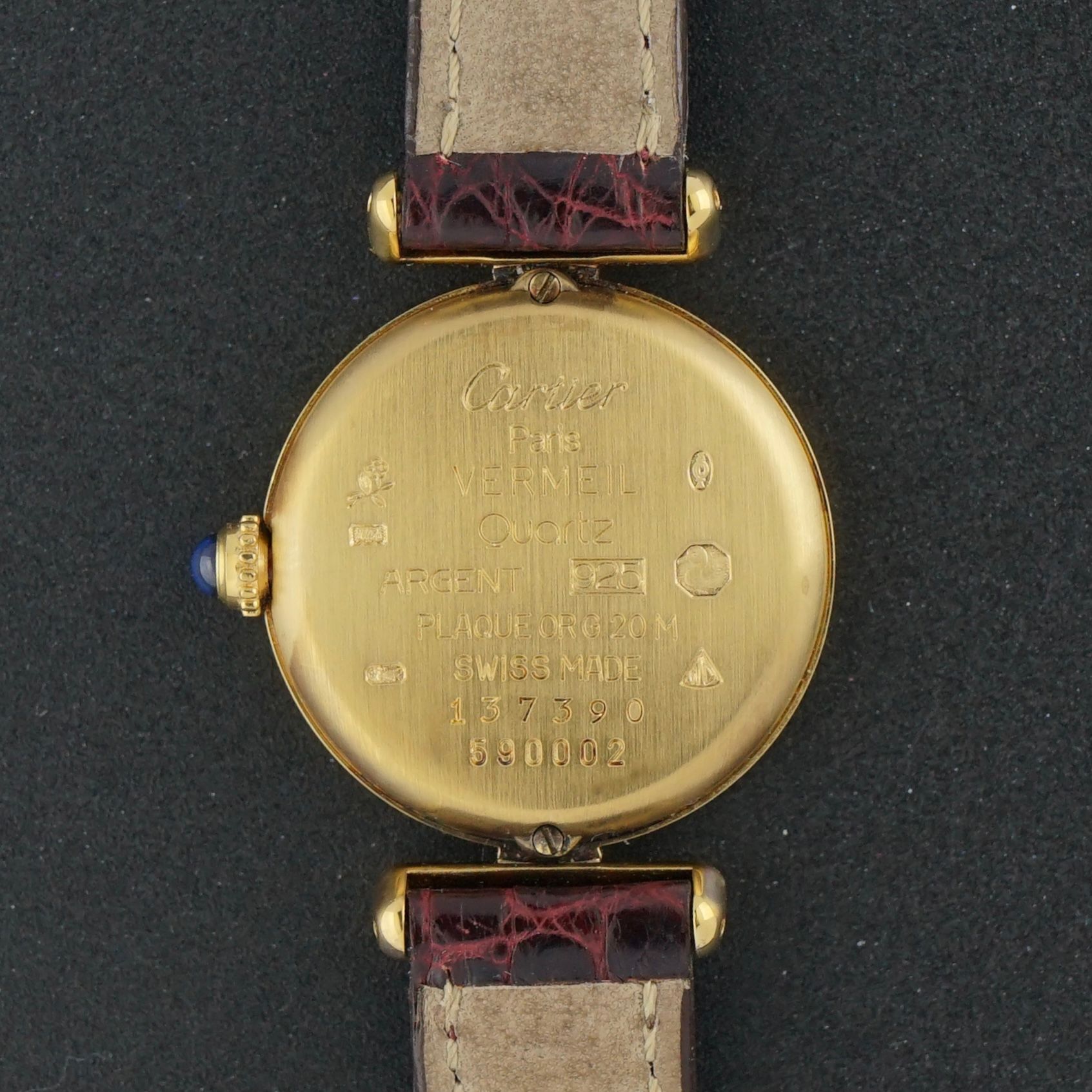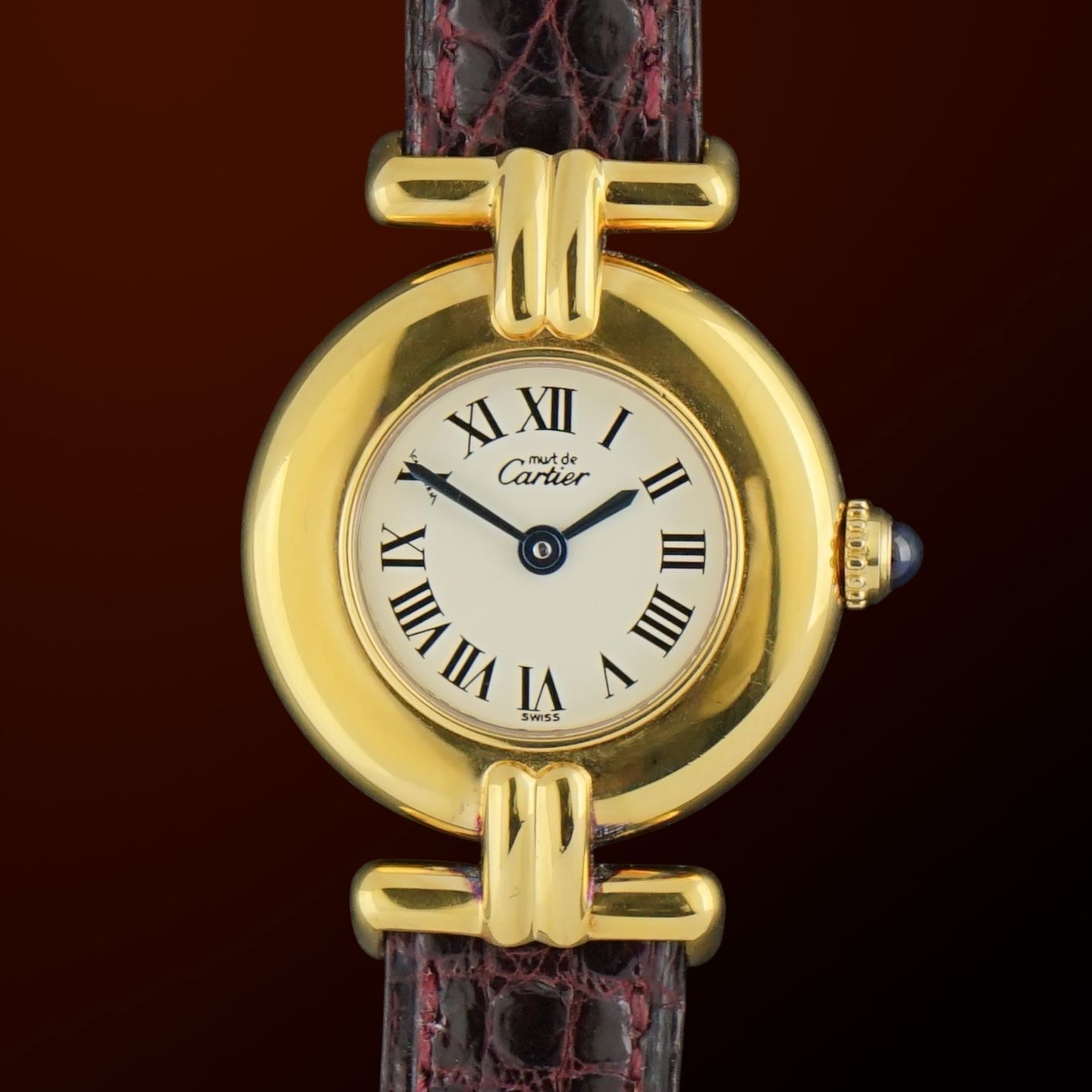 Powered by a quartz movement overhauled in January 2026, the watch runs and functions excellently. It comes on its original Cartier leather strap with a dark Bordeaux red crocodile motif and its original Cartier buckle, both in perfect condition.