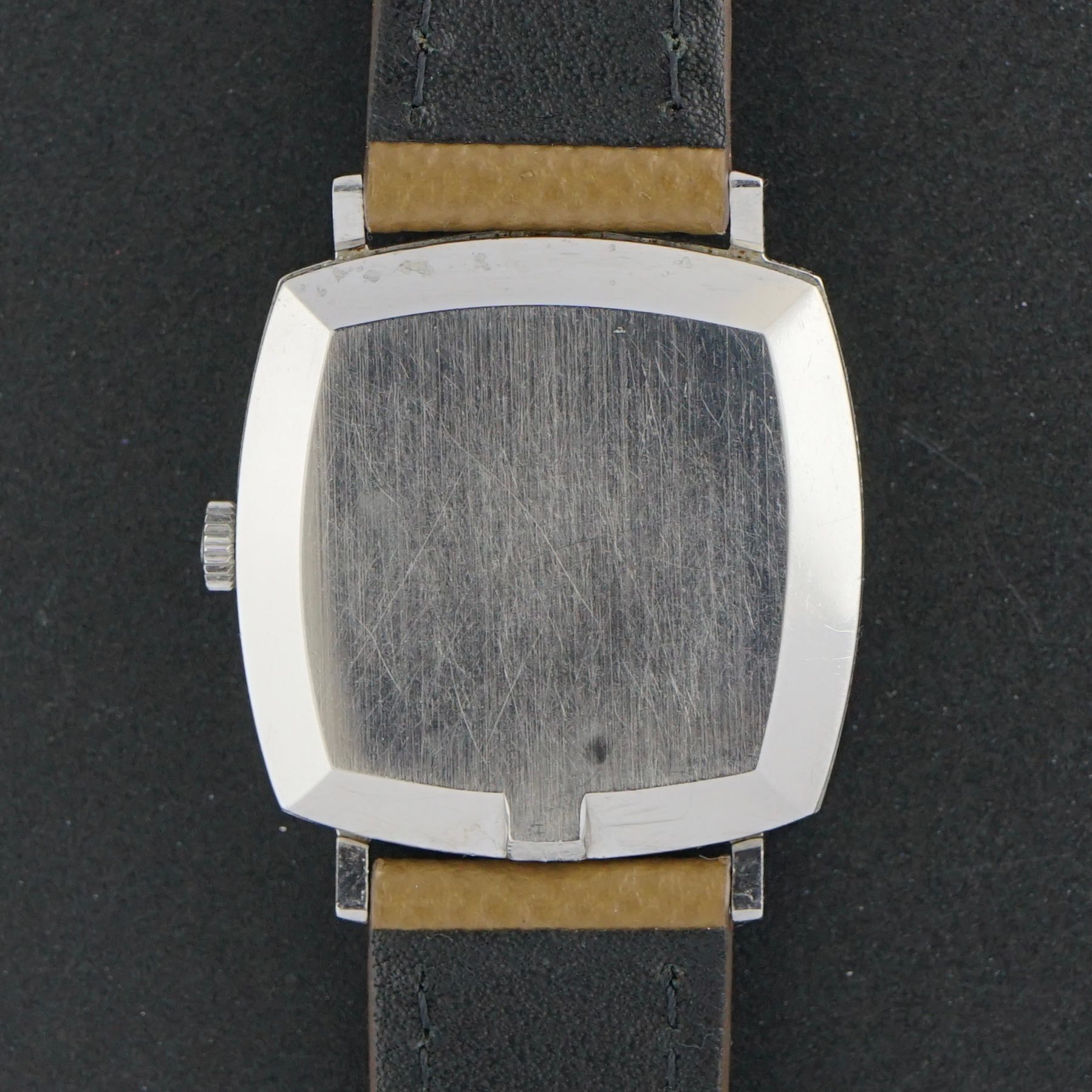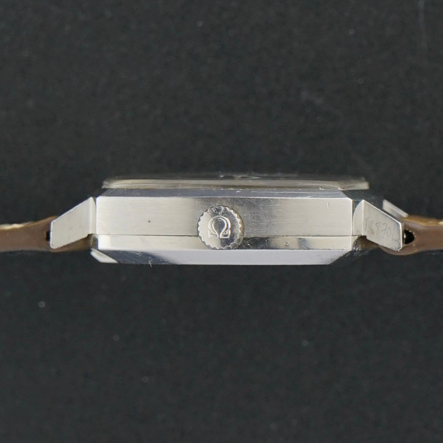 This vintage Omega Genève from 1968 features a square steel case and a striking blue sunburst dial. White hands, hour markers, and dial text provide crisp contrast. The case measures 31mm excluding the crown (33mm including) and 37,5mm lug to lug. Condition is good, with most of the original polish still intact. Inside is the Omega caliber 565 automatic movement, serviced in January 2026 and currently running and functioning excellently. It is paired with a brown leather strap.