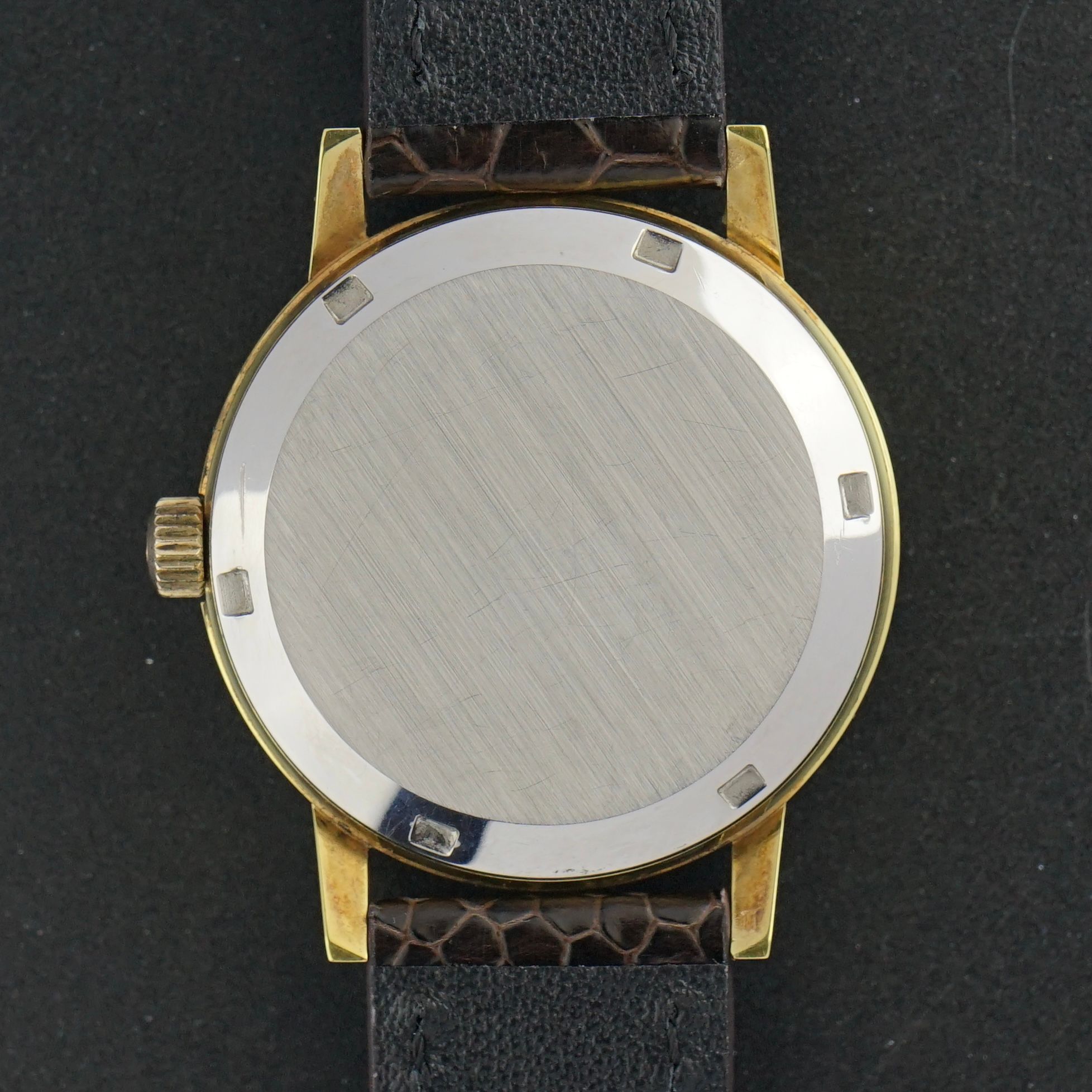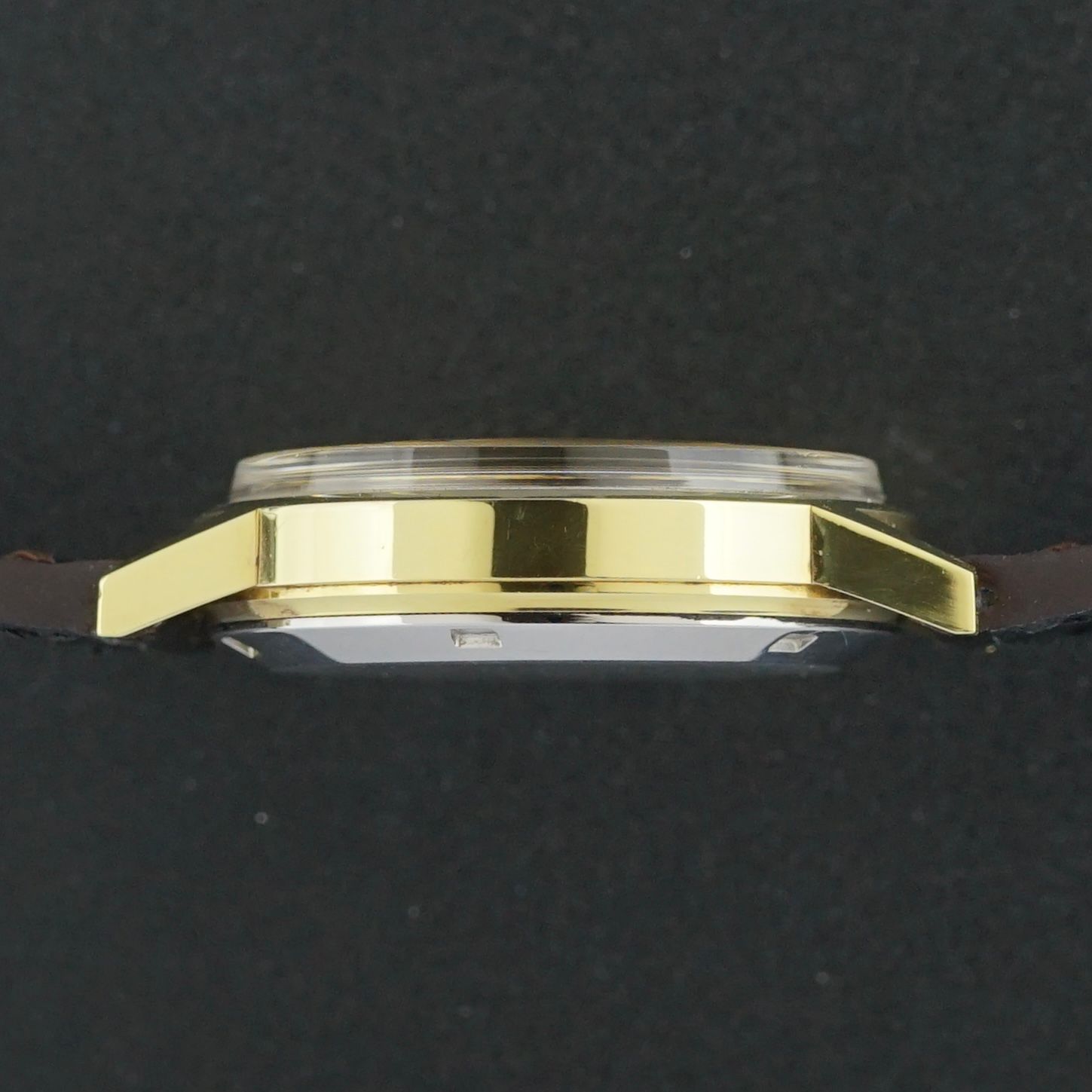 This vintage Omega Genève from 1972 features a day-date complication with weekdays displayed in English. It is powered by the caliber 1022 automatic movement with double quickset, serviced in January 2026 and currently running and functioning excellently. The gold-plated case measures 35mm in width and remains in perfect condition, with no gold fading. The dial is gold with a sunburst effect. Overall, the watch is in incredible condition and is paired with a Grade 3 brown leather strap with crocodile motif.