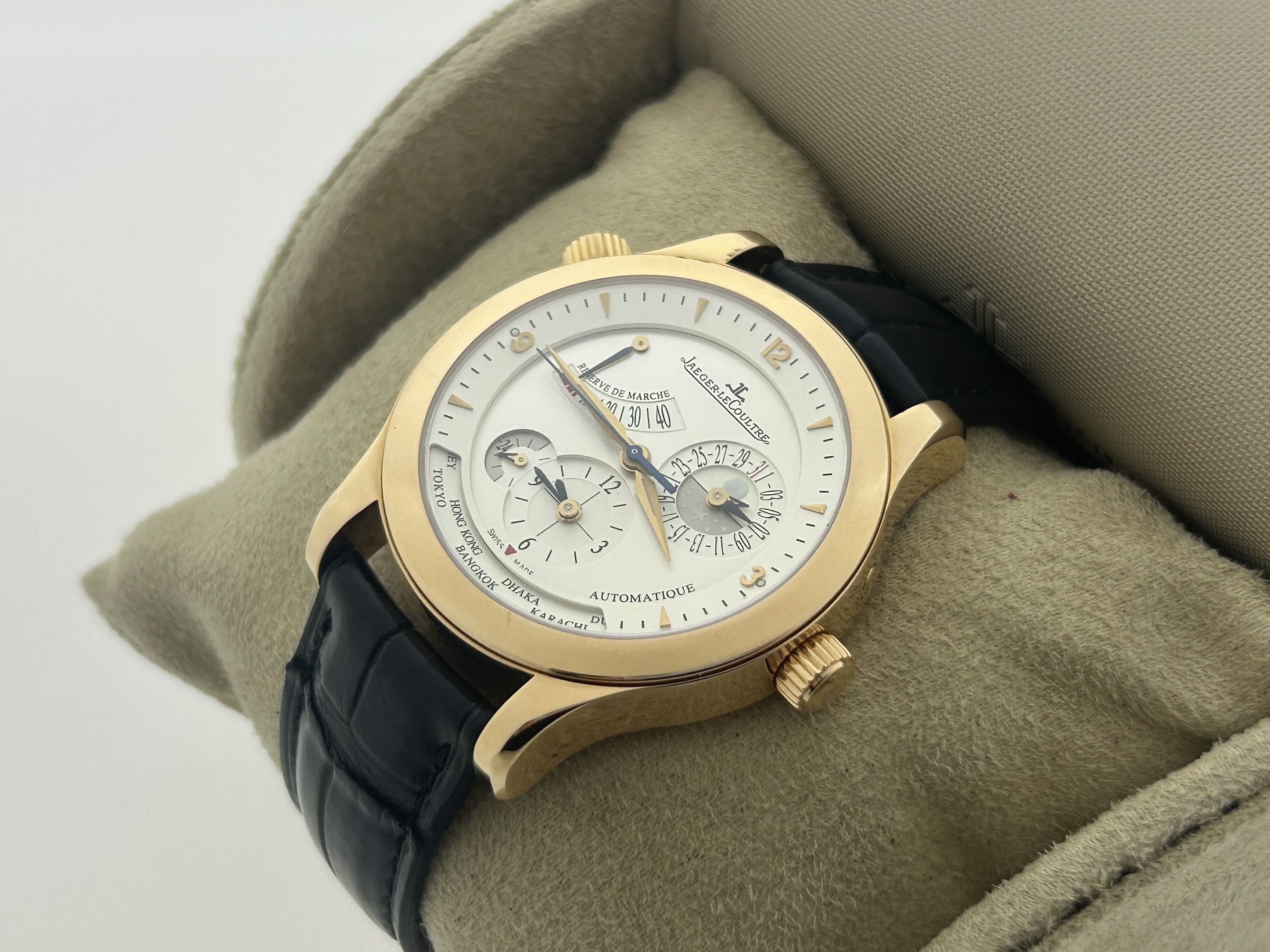A rose-gold Jaeger-LeCoultre Master Geographic watch. The watch has a rose-gold 40mm case with a black alligator leather strap and a rose-gold JLC folding clasp. The watch has a silvered colored dial with Arabic numerals. The watch has a date-window between 2 and 3 o'clock and at 6 o'clock the watch has a timezone dial. The JLC has a automatic movement.The Jeager-LeCoultre watch is in a great condition, in 2022 the watch has been serviced by JLC and comes with the box.