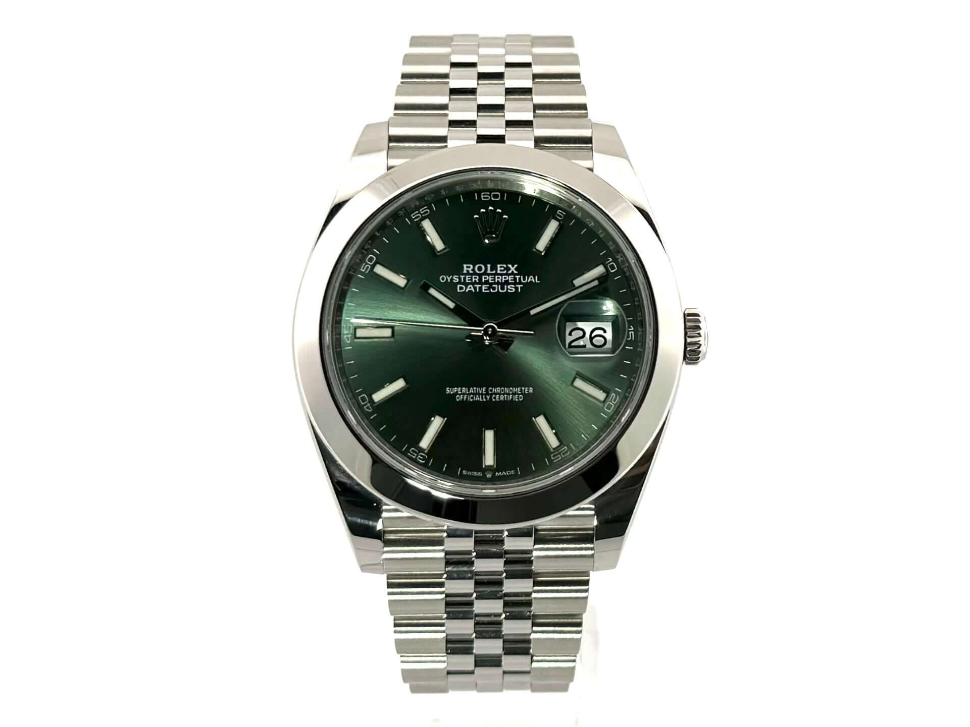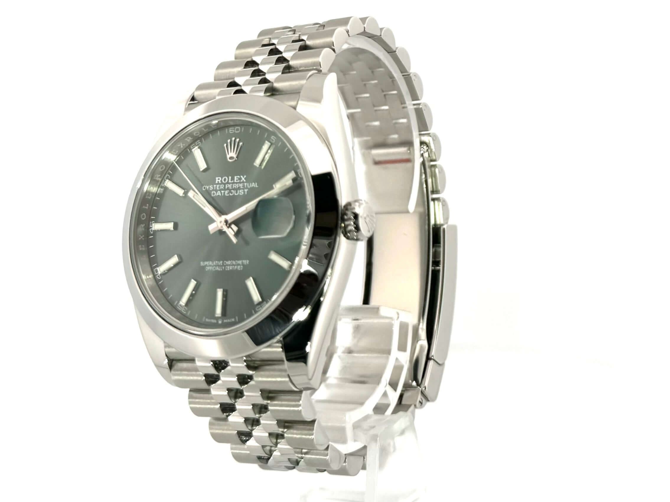 Rolex Datejust 41 Ref. 126300 Stainless Steel Mint Green Jubile Bracelet Case made of polished and satin-finished stainless steel, case diameter 41 mm, polished stainless steel bezel, polished and satin-finished Jubile stainless steel strap with folding clasp, mint green dial with 18 kt white gold luminous indices, luminous hands, automatic movement, Rolex manufacture caliber 3235, chronometer, 70-hour power reserve, date display, scratch-resistant sapphire crystal , screwed crown, screwed stainless steel base, water resistant up to 10 bar.