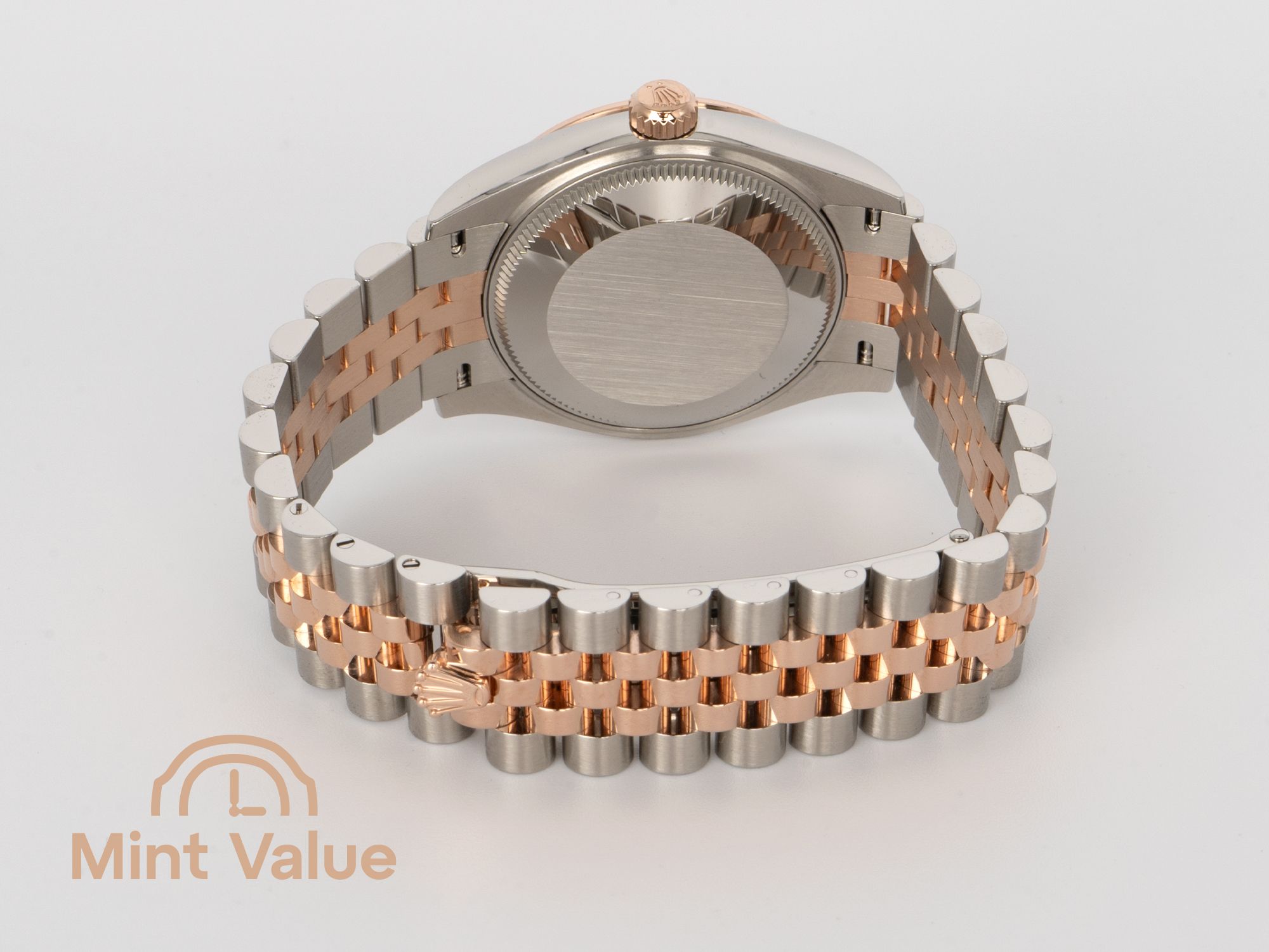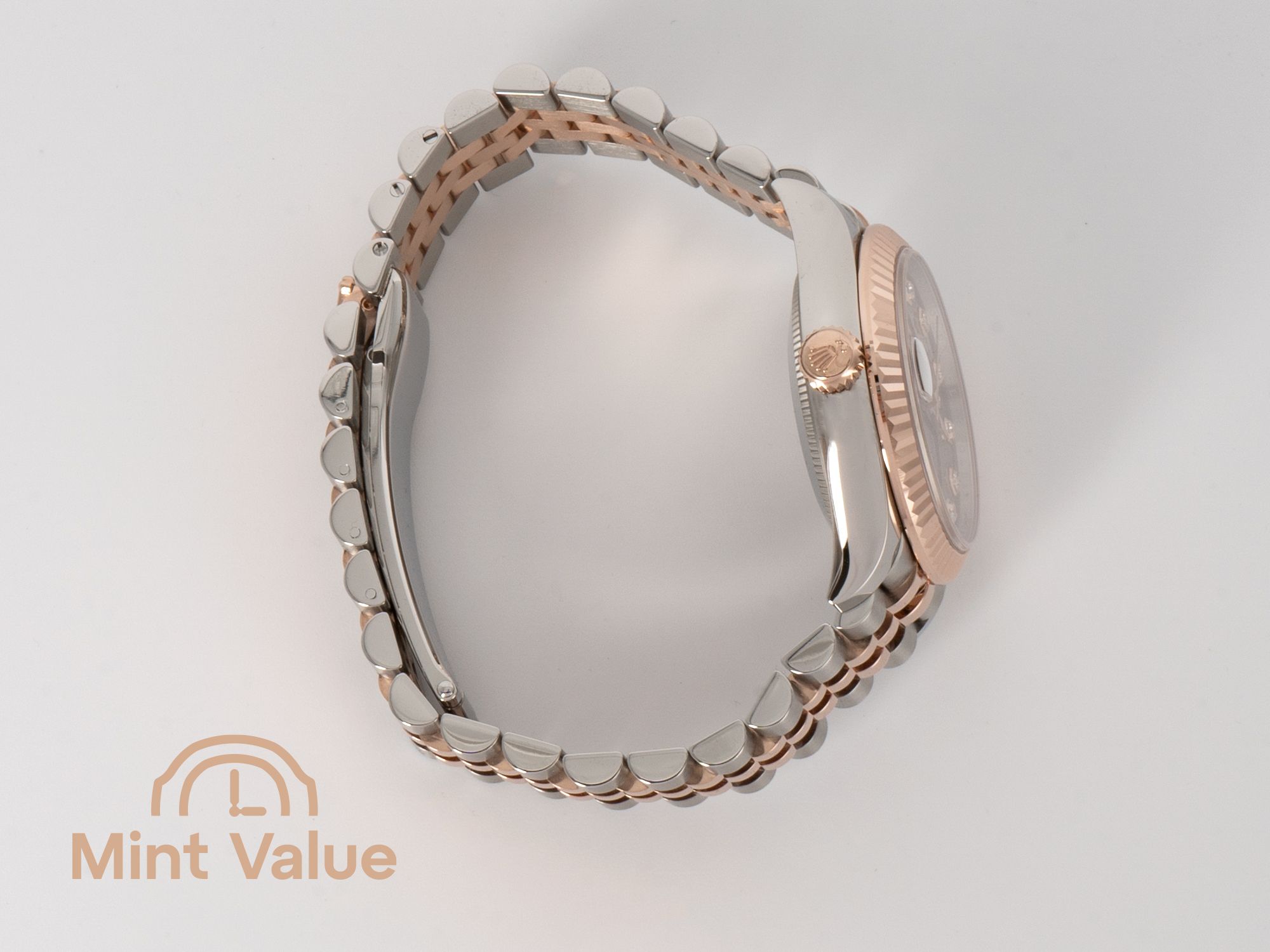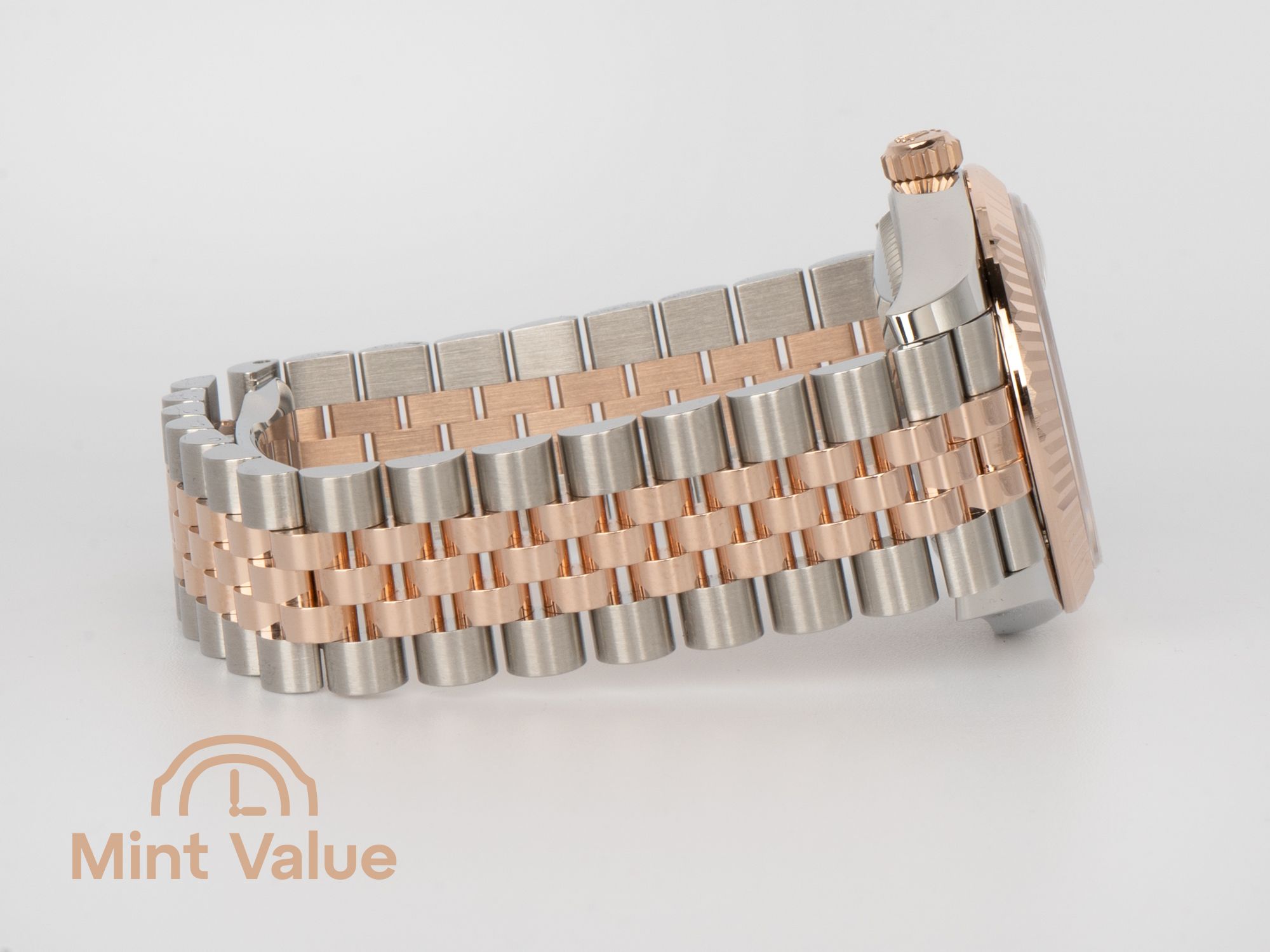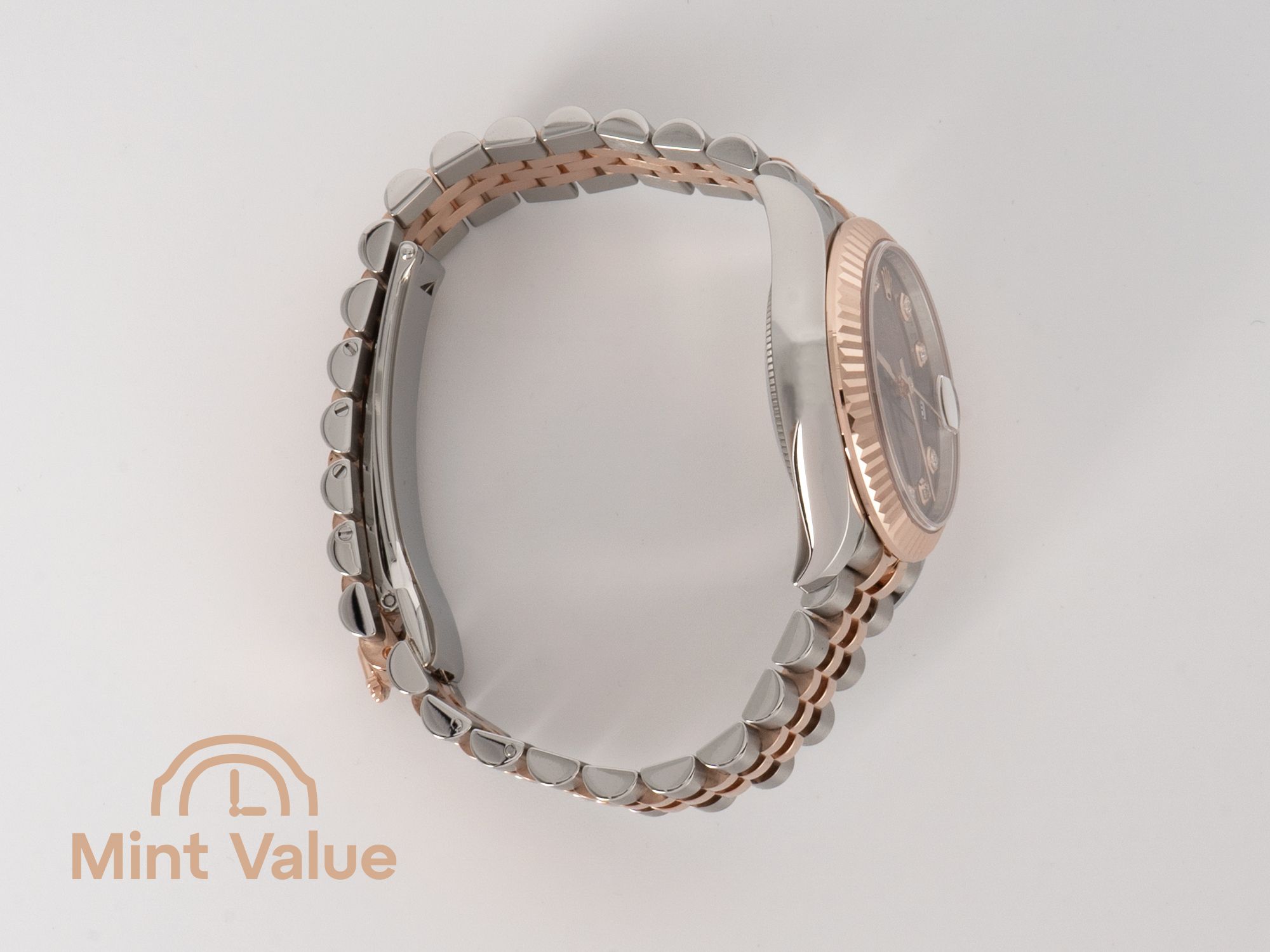 blends Oystersteel and Everose gold in a composition that radiates balance and sophistication. Its sunray-finished chocolate dial, adorned with diamond hour markers set in 18 ct gold, captures light with quiet brilliance — a modern interpretation of feminine elegance within Rolex’s most enduring collection.