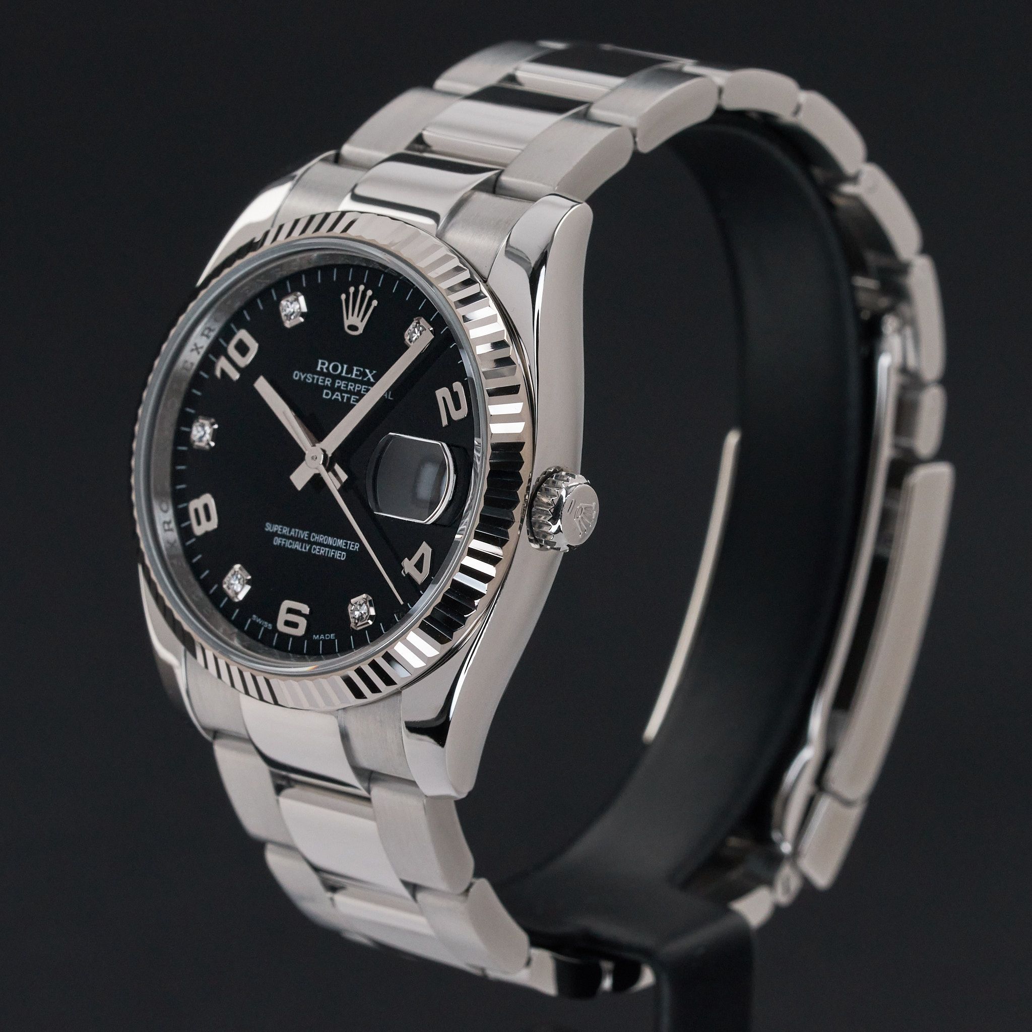 This Rolex Oyster Perpetual Date 115234 features a Black Arabic diamond dial and is crafted from stainless steel, with a production year of 2008.