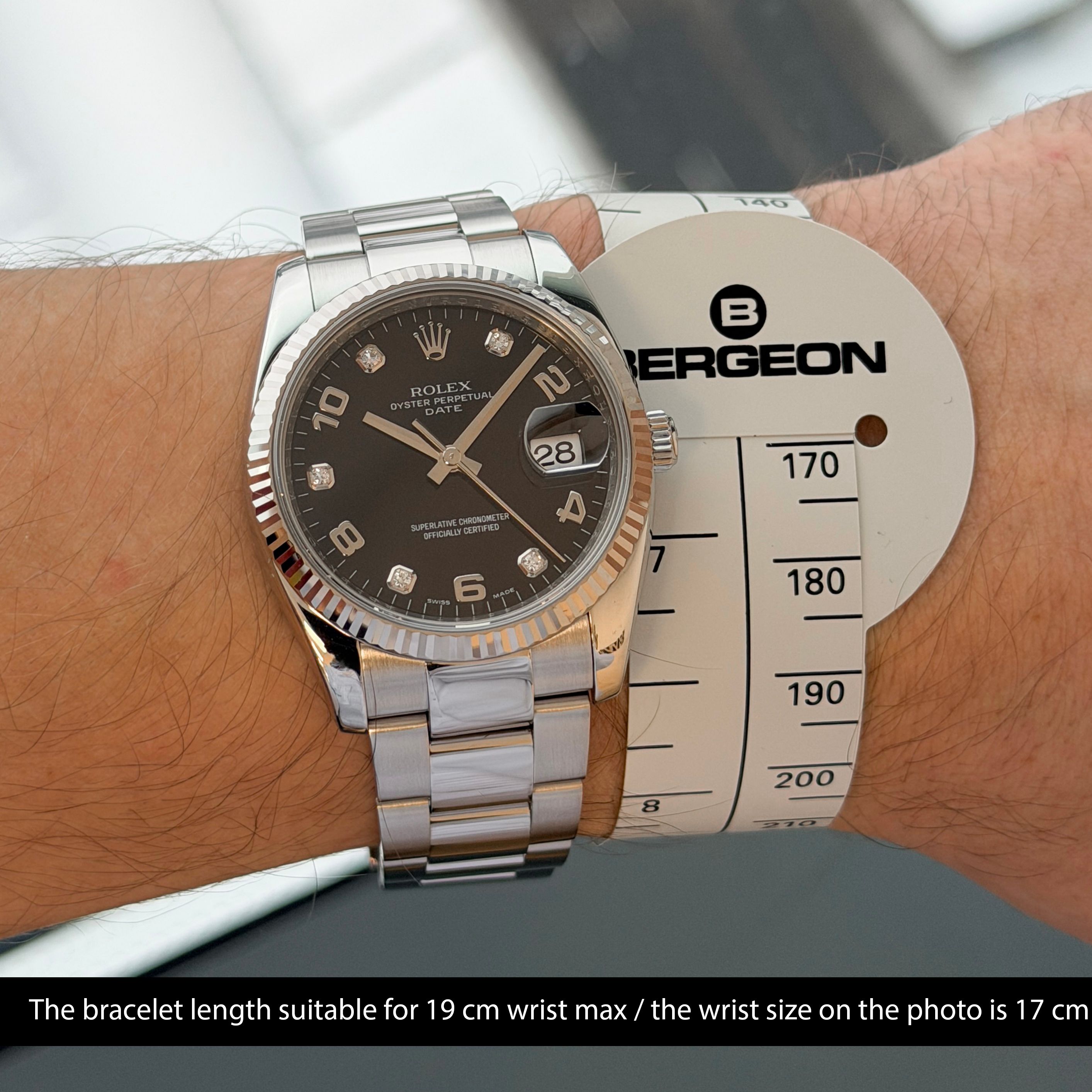 Rolex Oyster Perpetual Date, 115234, 34mm, 2008, Steel, Black Arabic Diamond dial, Fullset, 1y warranty