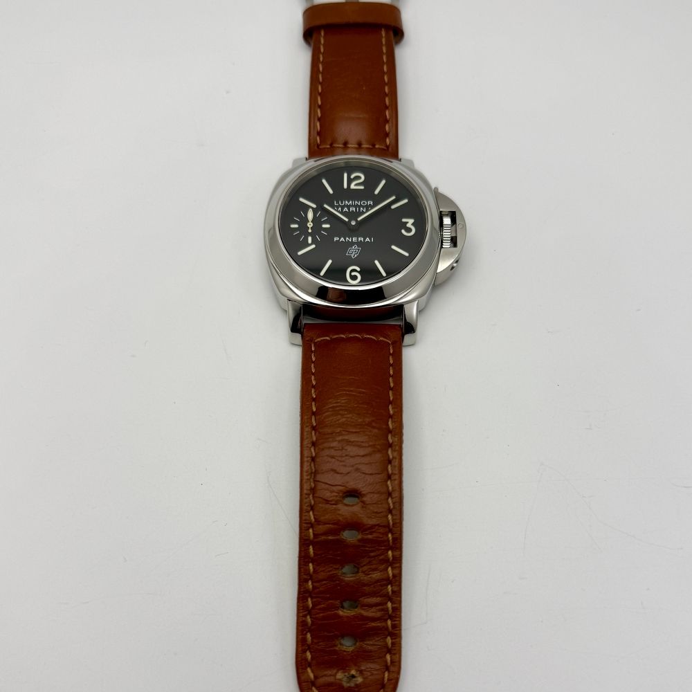 The Panerai Luminor Marina Logo, reference PAM00005, features a 44 mm stainless steel case with a classic brushed finish and a black sandwich dial. Large luminous Arabic numerals and hour markers provide outstanding legibility, while the small seconds subdial at 9 o’clock adds functional balance to the design. Powered by the Panerai caliber handwound movement (based on the ETA 6497-1). A scratch-resistant sapphire crystal protects the dial, while the signature crown-protecting bridge reinforces the watch’s professional tool-watch character. With 300 meters of water resistance, the Luminor Marina is built for serious underwater use as well as everyday wear. This model is fitted on a brown leather strap with a stainless steel pin buckle, complementing the watch’s vintage military aesthetic.