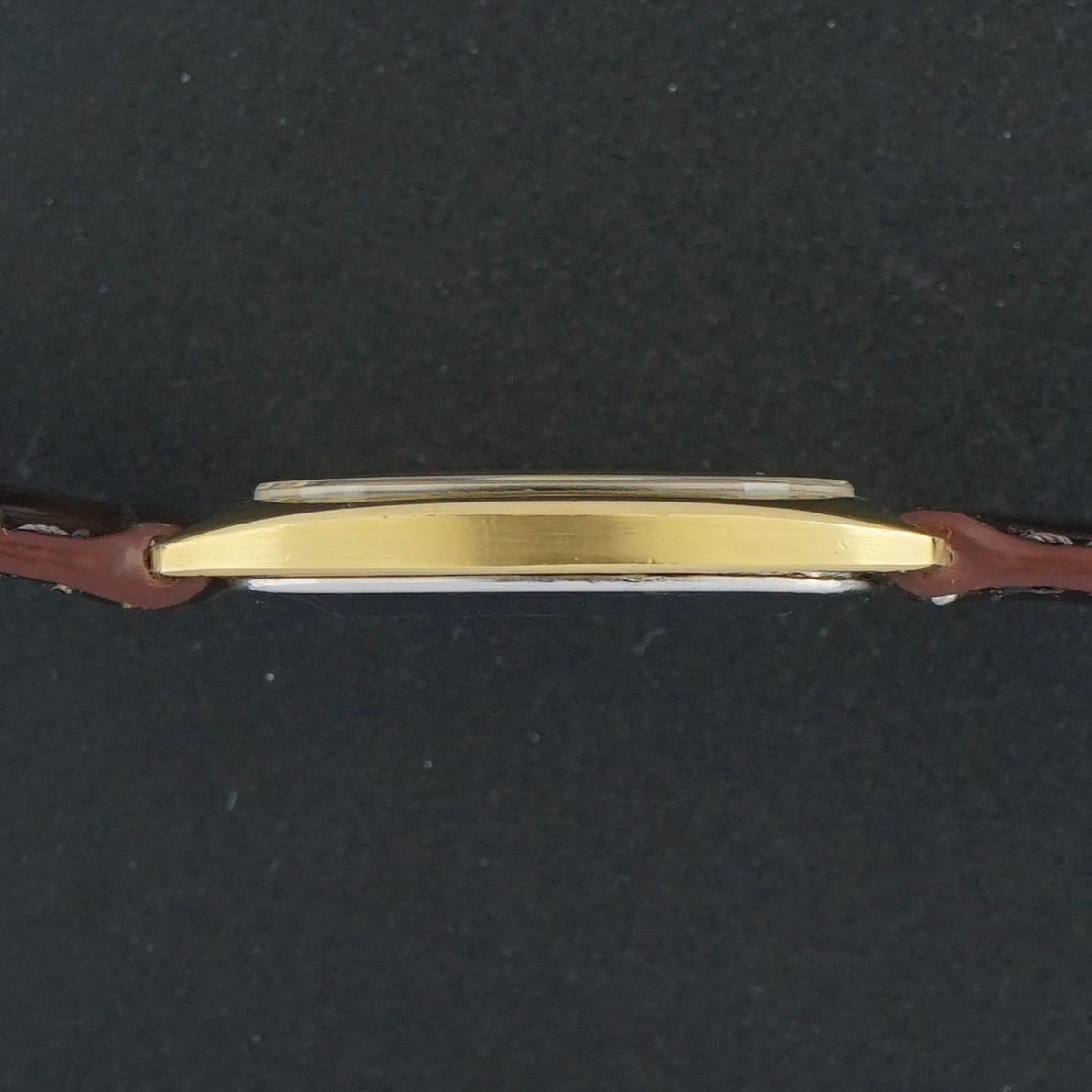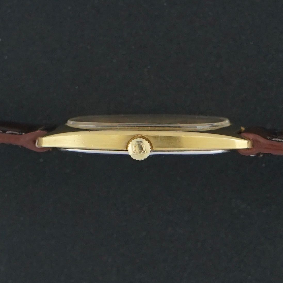 This vintage Omega De Ville was produced in 1975 and features a beautiful golden colored dial with a vertical brushed finish. It is fitted with sandwich hour markers and stick hands, and housed in a gold plated case measuring 32 millimeters in width. Inside is a caliber 625 manual wind movement, which was serviced in January 2026 and now runs and functions excellently. The watch is paired with a brown top grain leather strap with a crocodile motif, and aside from this brand new strap the watch remains entirely original. Overall, the watch is in beautiful shape and presents as an elegant and timeless piece.