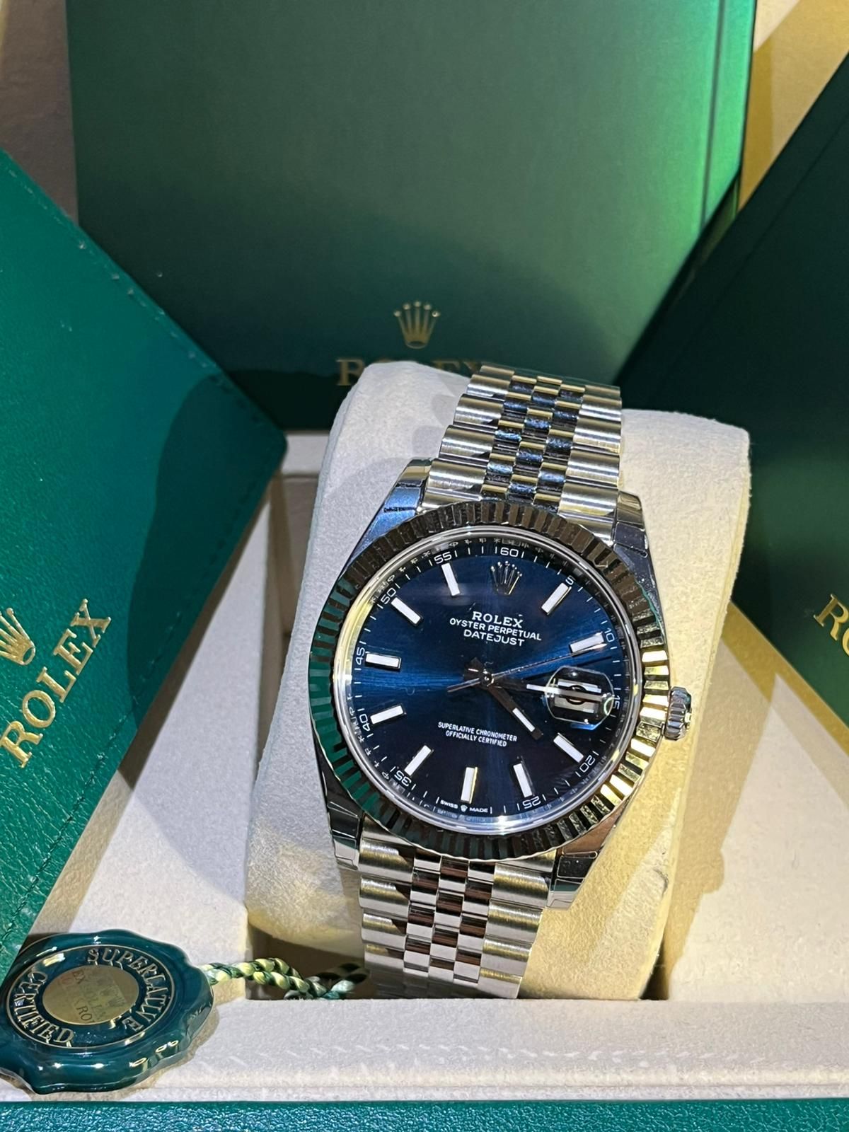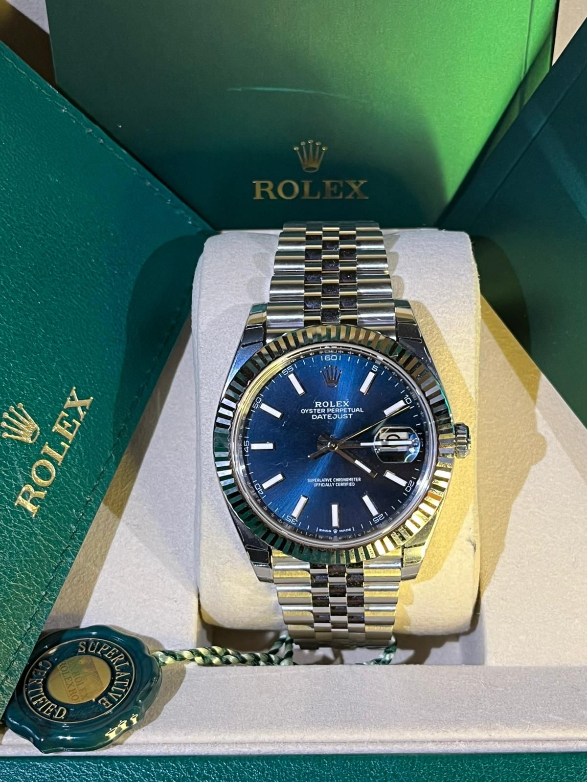The watch comes as a full set, including the original Rolex box, warranty papers, booklets, and all original full links. An excellent opportunity to acquire a new and unworn Rolex Datejust 41 in one of its most popular and refined configurations.