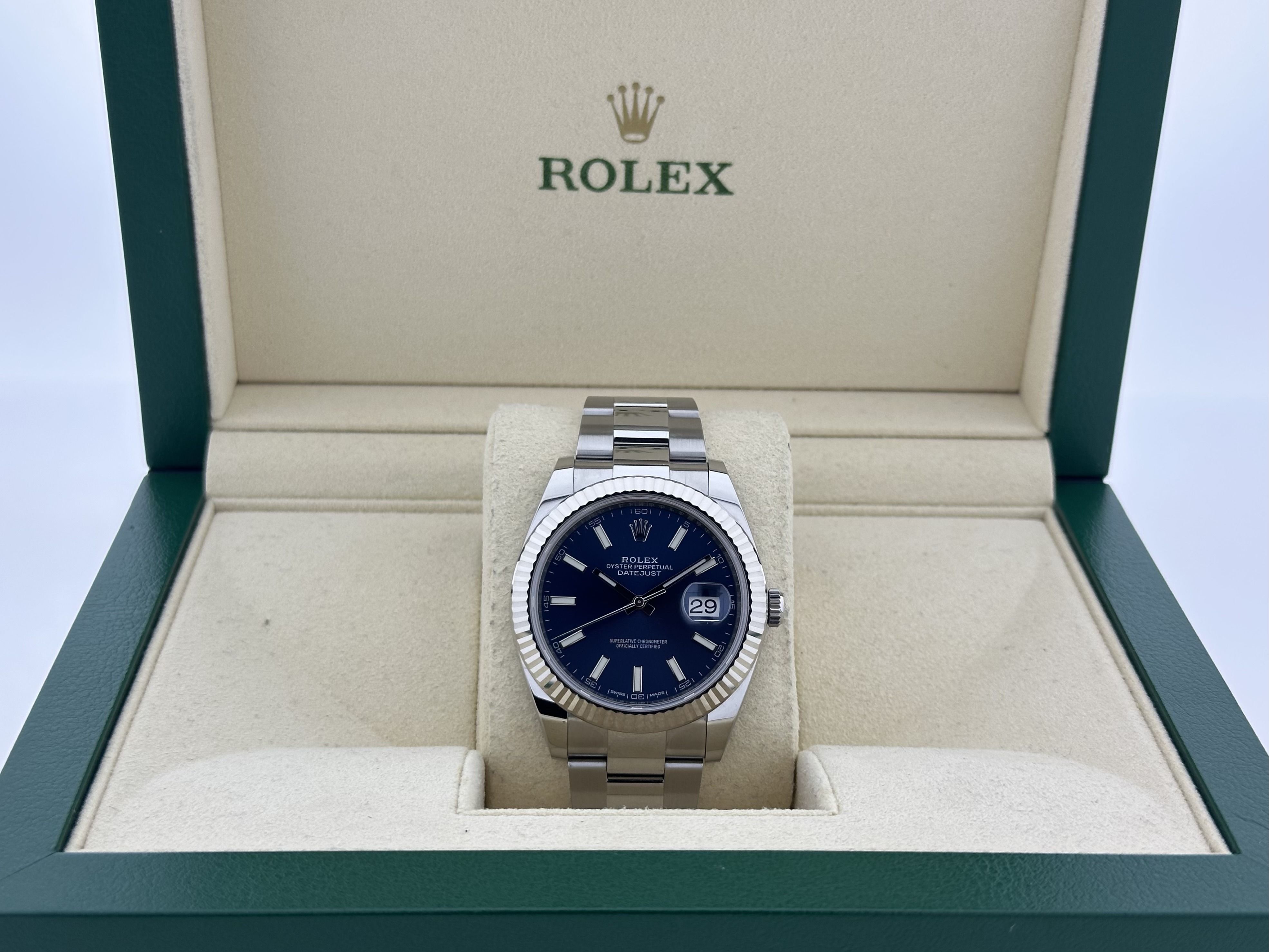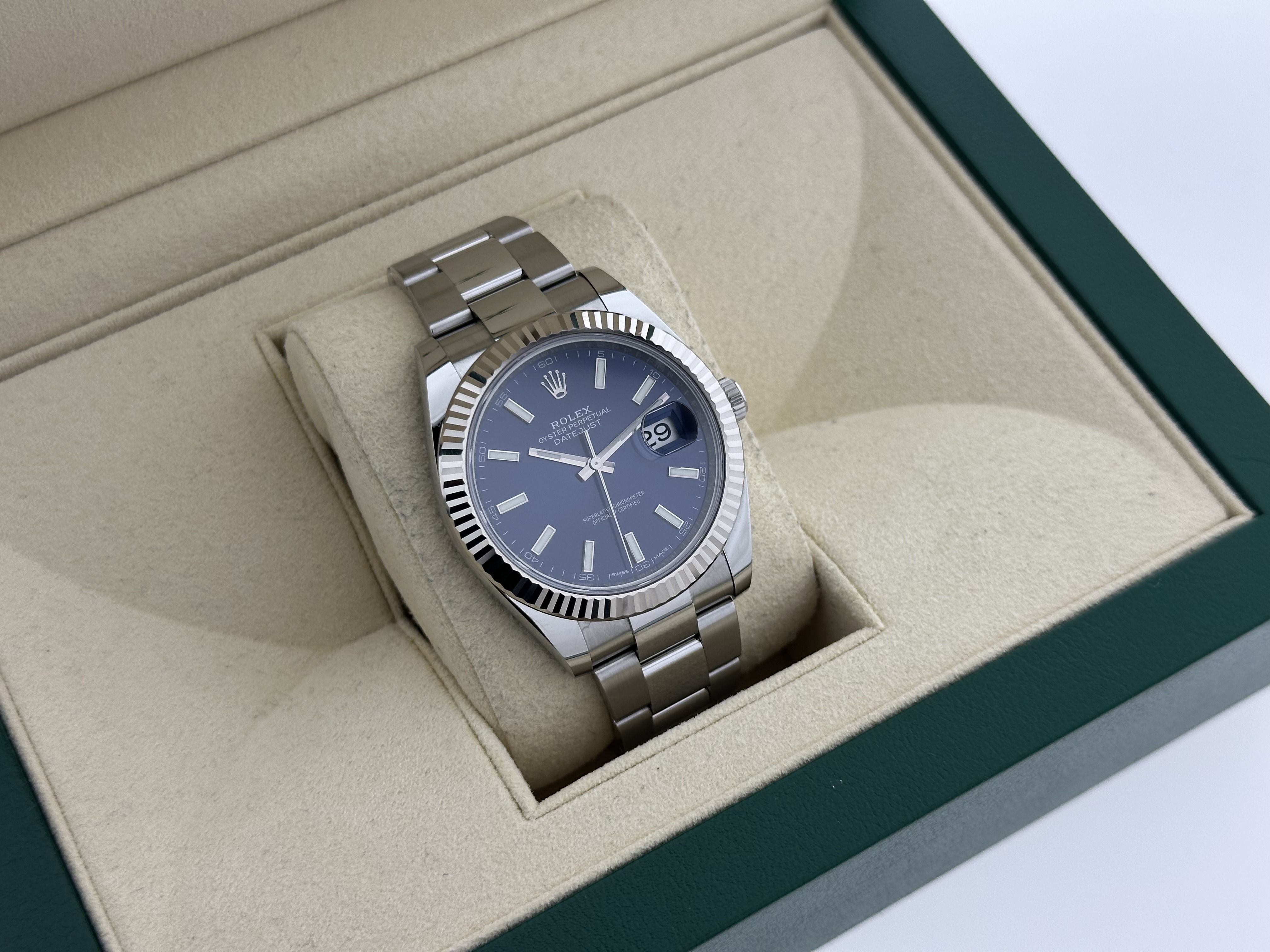 A steel Rolex Datejust 41, ref. 126334, fullset. The Rolex has a steel 41mm case with a fluted bezel and an Oyster-bracelet. The watch has a blue dial with a date-window at 3 o'clock. The Rolex is from 2019 and complete with box and certificate. Note: the watch has scratches on the bracelet.