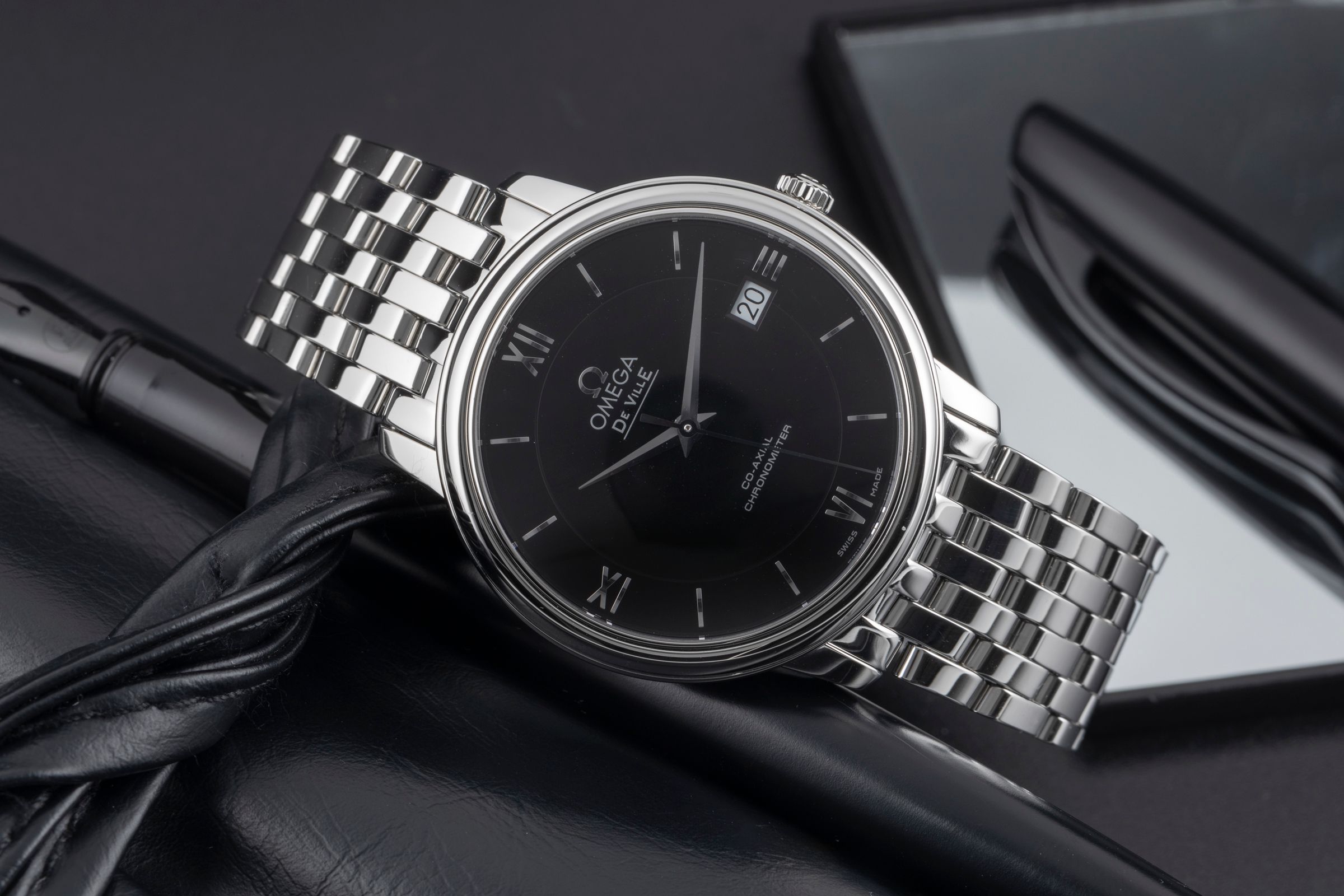 Alternative title: Omega 424.10.37.20.01.001 De Ville Prestige Co-Axial 36.8 Stainless Steel / Black / Bracelet; Omega De Ville Prestige Automatik Stahl Herrenuhr Ref. 424.10.37.20.01.001 B&P [2507095]