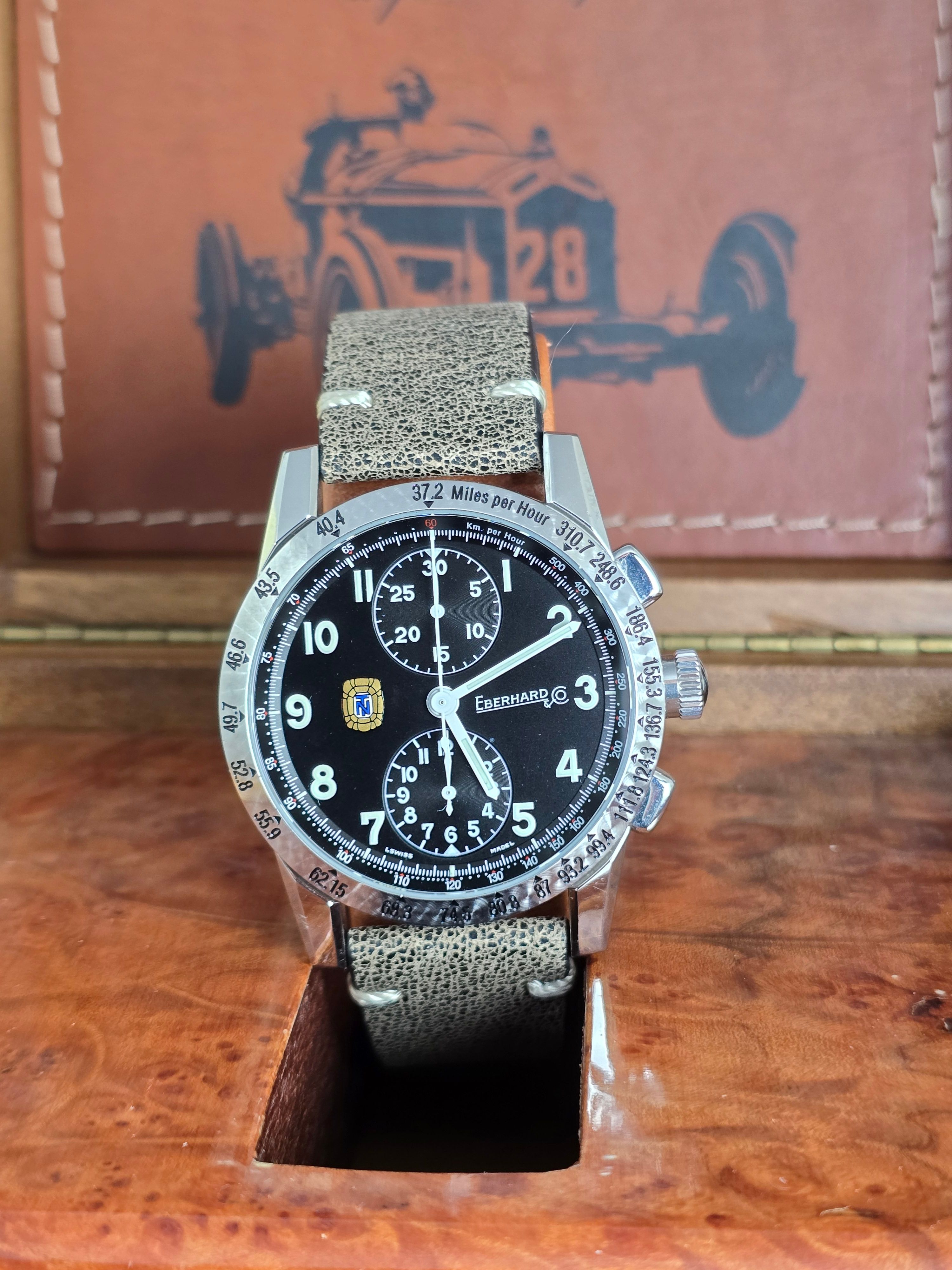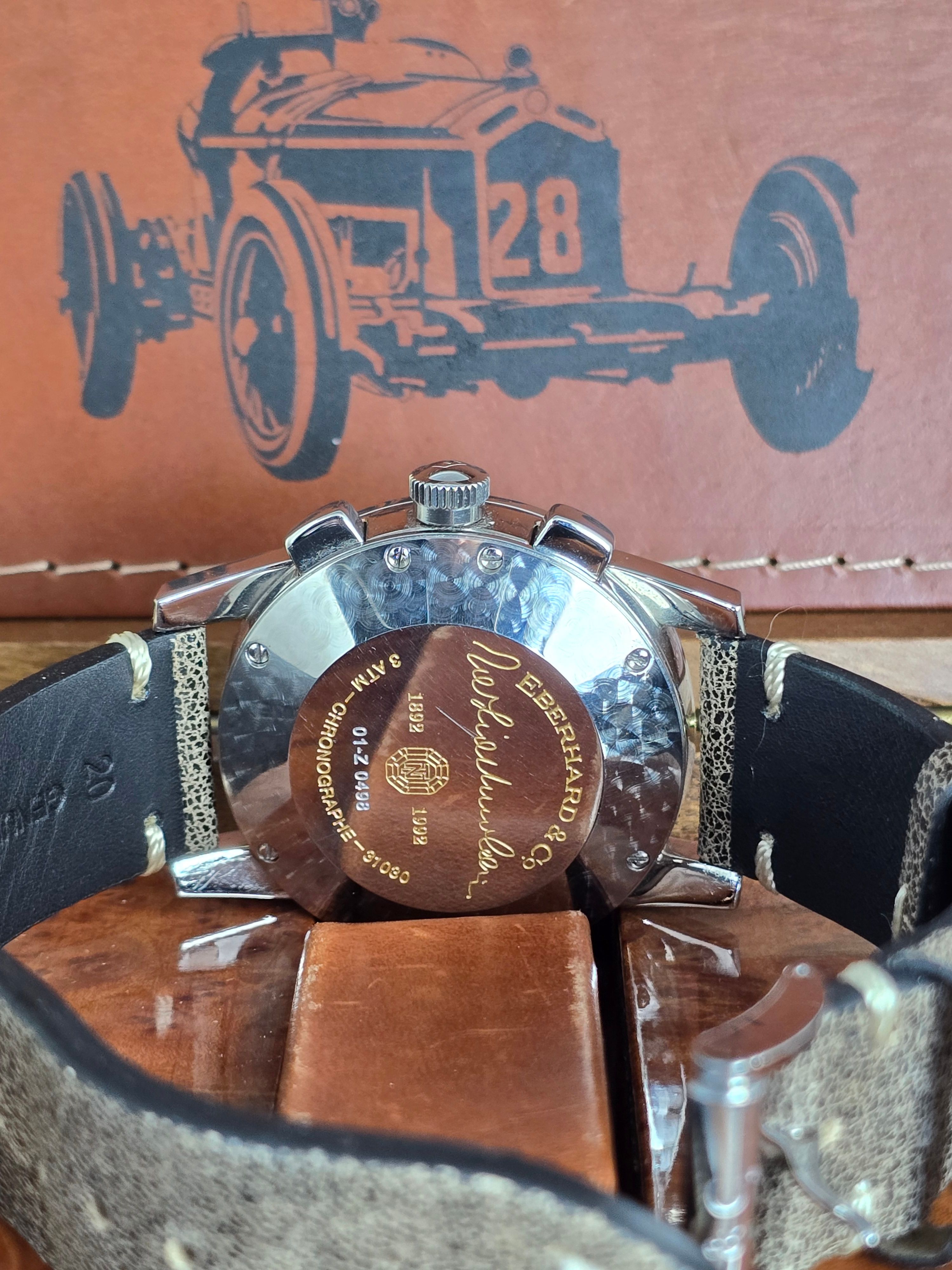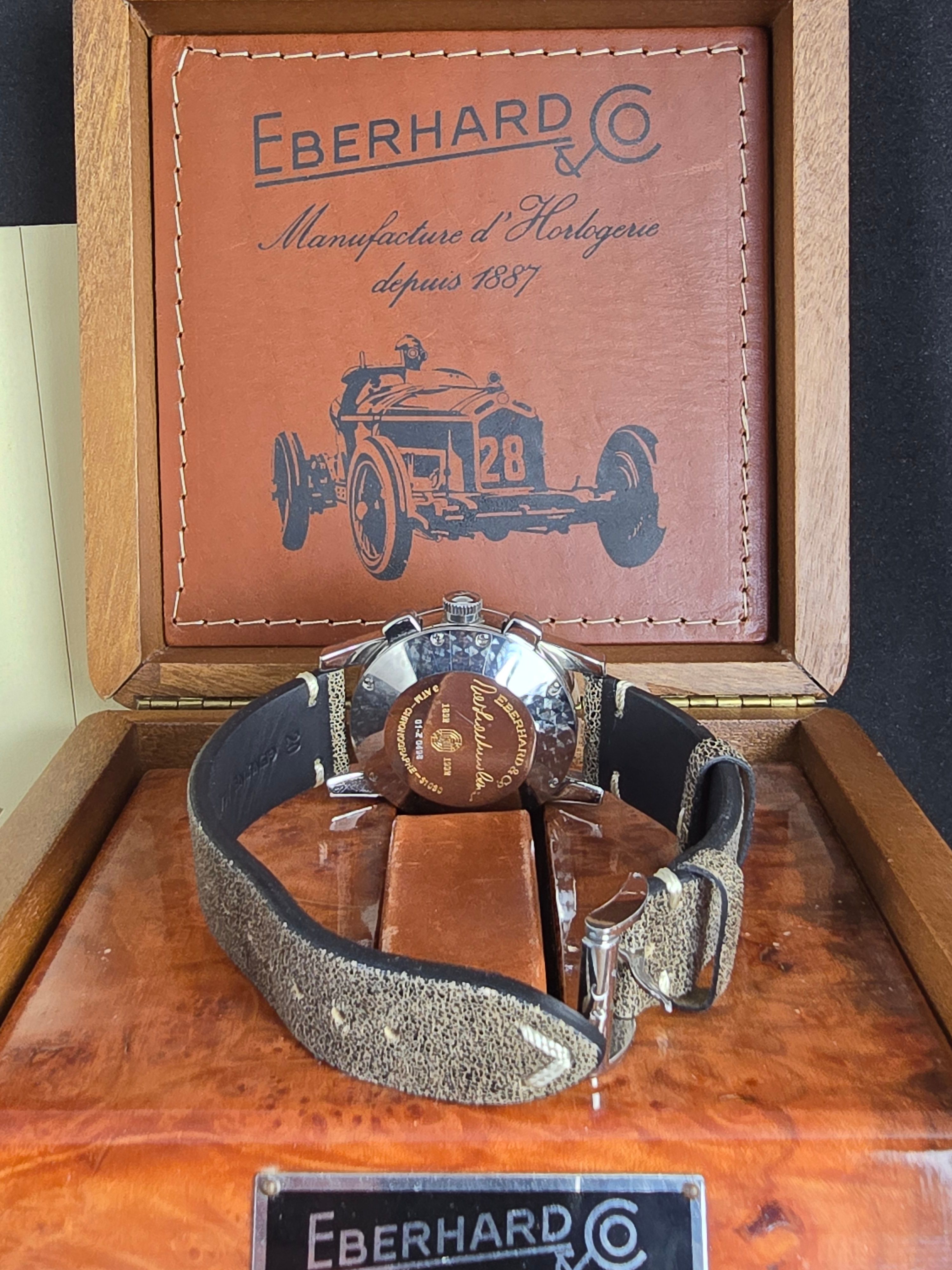Includes: Full set – original Eberhard wooden watch box with a custom-stained display base. Outer packaging features printed leather with a detailed illustration of a 1920s racecar, making this a true collector’s presentation set.