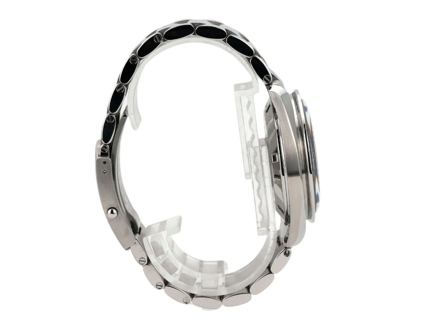 Case polished and satin-finished stainless steel, case diameter 42 mm, case height 14 mm, stainless steel bezel with black inlay and tachymeter scale, stainless steel bracelet polished and satin-finished with safety folding clasp, black dial with luminous markers, luminous hands, manual winding, Omega caliber 1861, 21,600 vibrations per hour, power reserve approx. 48 hours, stopwatch, small seconds at 9 o’clock, hesalite glass, screwed and engraved stainless steel back, water-resistant up to 5 bar.