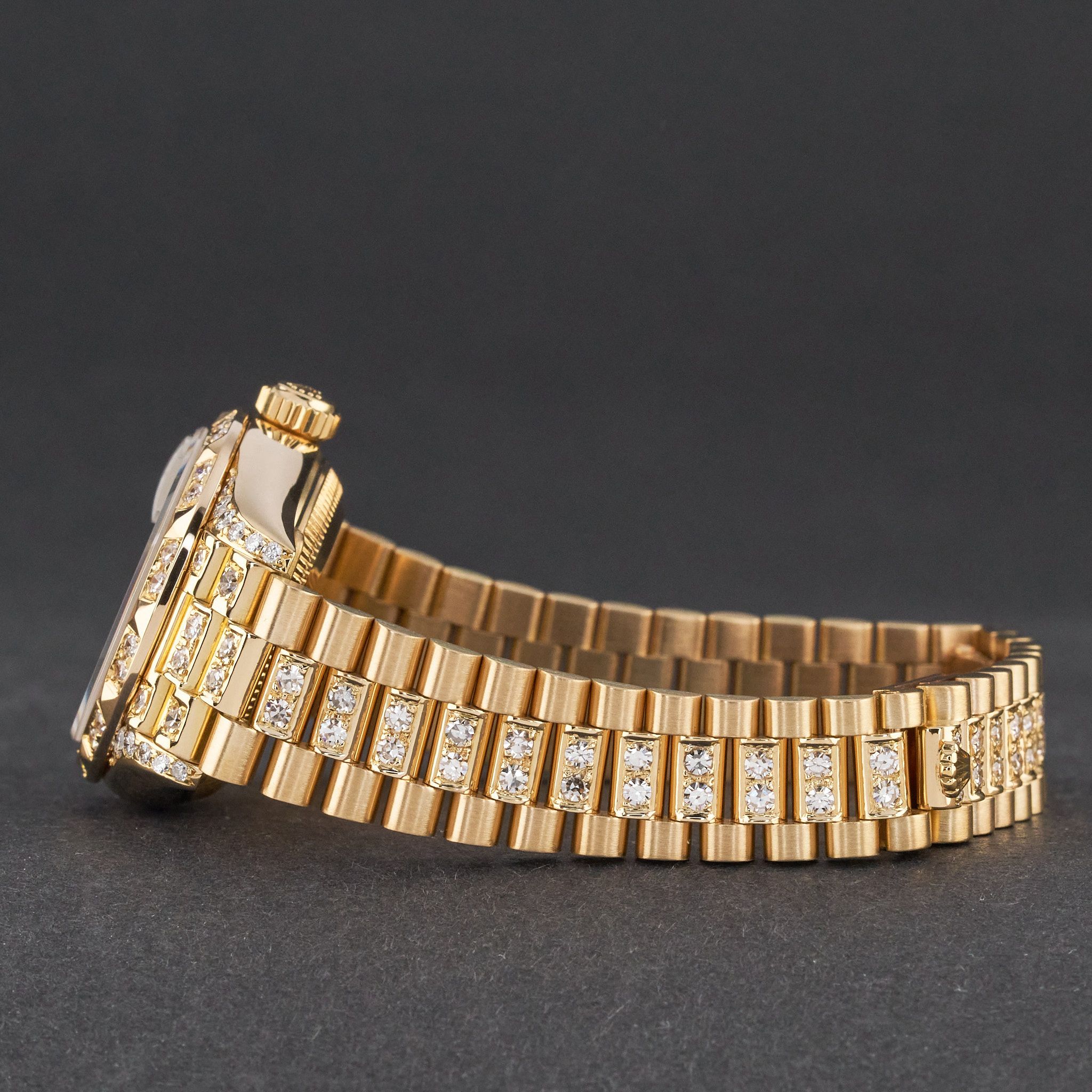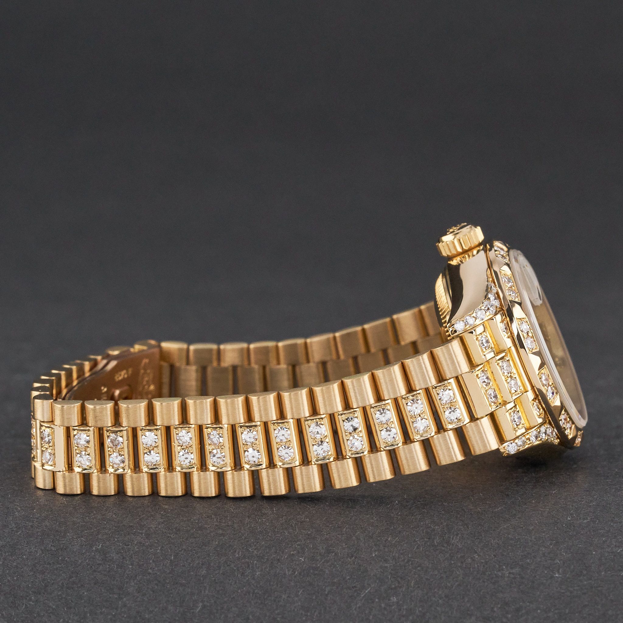 This Rolex Lady-Datejust 69178 features a Silver small diamond dial and is crafted from 18K yellow gold, with a production year of 1991. Bezel, case and bracelet are original, but have aftermarket diamond setting.
