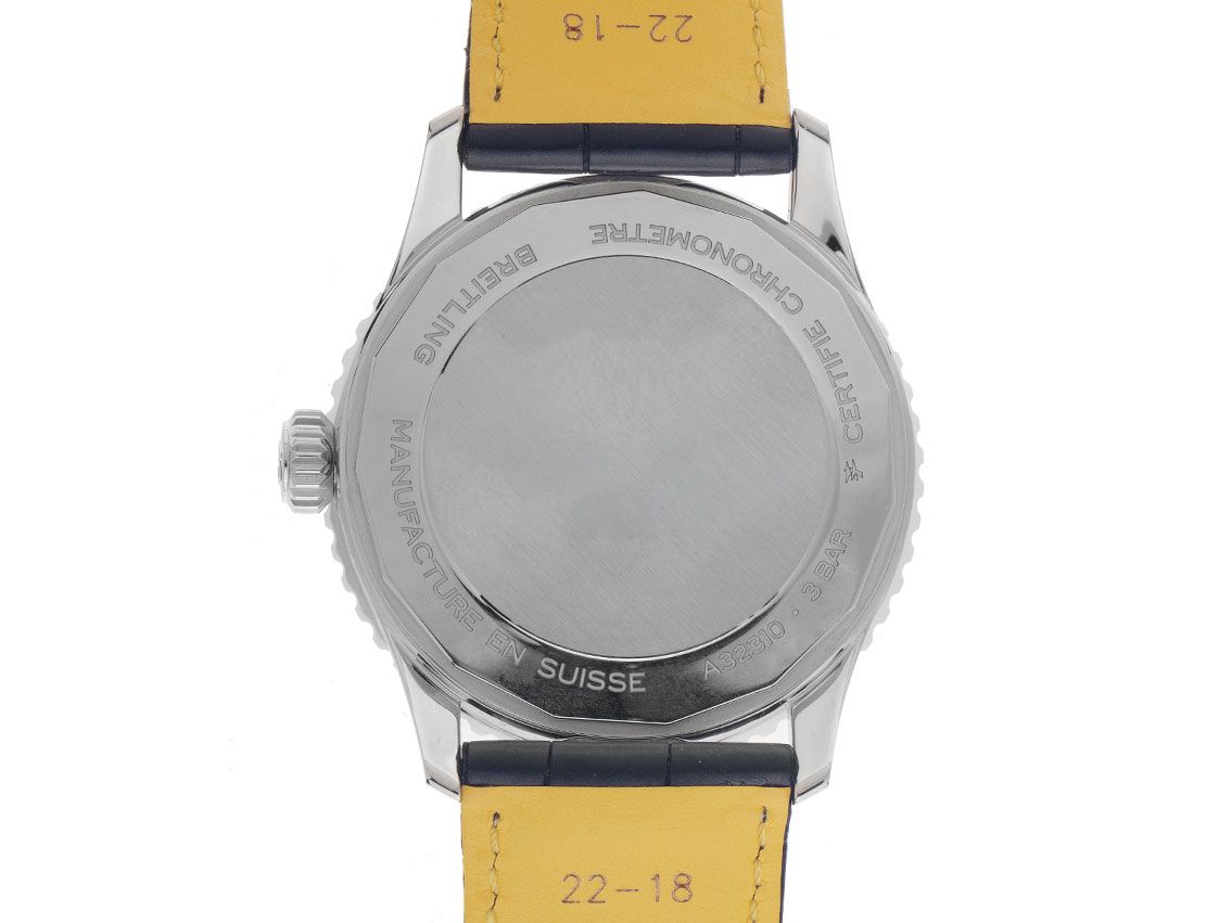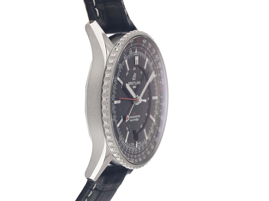 Gehäuse Edelstahl poliert und satiniert, Gehäusedurchmesser ohne Krone 41mm, Gehäusehöhe 11,6mm. Lünette Edelstahl gerädelt mit Unterglas Rechenschieber, beidseitig drehbar. Armband Krokoleder schwarz / gelb, Anstoßbreite 22mm, Sicherheitsfaltschließe Edelstahl mit Hersteller-Logo. Zifferblatt schwarz mit aufgesetzten Edelstahl Leuchtindexen und Edelstahl Leuchtzeigern. Uhrwerk Automatik, Chronometer mit Zeugnis, Kaliber Breitling B32 mit 21 Edelsteinen, Gangreserve ca. 42 Stunden. Anzeige von Stunde, Minute und Sekunde über Zeiger aus der Mitte mit Sekundenstopp zur sekundengenauen Einstellung der Uhrzeit, Datumsanzeige mit Schnellverstellung bei 6 Uhr, GMT (zweite Zeitzone) ablesbar über Zeiger aus der Mitte mit roter Spitze. Saphirglas kratzfest und gewölbt. Krone mit Hersteller-Logo. Boden Edelstahl verschraubt und graviert. Gewicht der Uhr inklusive Armband 85g. Wasserdicht bis 3 ATM. Referenznummer: A32310251B1P1, ID: ST116081440226H-6000, Artikelnummer: 10000084624. Original Breitling Box und Garantie Papiere von 2026, Full Set. Ungetragen. Lieferzeit sofort.