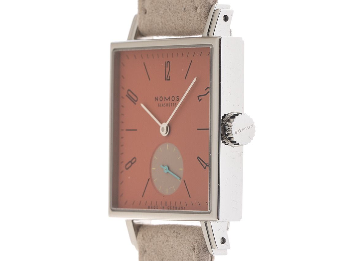 Gehäuse Edelstahl poliert, quadratisch, Gehäusemaße ohne Krone (L x B x H) 29,5 x 29,5 x 6,5mm. Armband Veloursleder beige, Anstoßbreite 18mm, Stiftschließe Edelstahl mit Hersteller-Logo. Zifferblatt Terrakotta rot mit arabischen Ziffern und Indexen sowie rhodinierten Zeigern und türkisenem Sekundenzeiger. Uhrwerk Handaufzug, Nomos Glashütte Manufakturkaliber DAU4001 mit 17 Edelsteinen. Anzeige von Stunde und Minute über Zeiger aus der Mitte, kleine Sekunde mit Sekundenstopp zur sekundengenauen Einstellung der Uhrzeit bei 6 Uhr. Saphirglas kratzfest. Krone mit Hersteller-Logo. Boden Edelstahl 4-fach verschraubt und graviert mit Saphirglas Sichtfenster. Gewicht der Uhr inklusive Armband 36g. Wasserdicht bis 3 ATM. Referenznummer: 438.SB, ID: ST116027060226H-1960, Artikelnummer: 10000084633. Original Nomos Box und Garantie Papiere von Januar 2026, Full Set. Neu. Lieferzeit sofort.