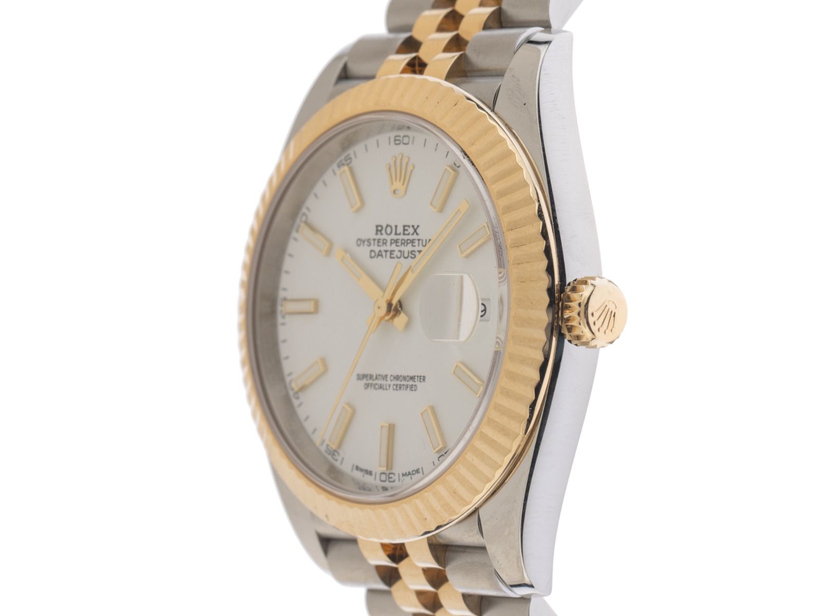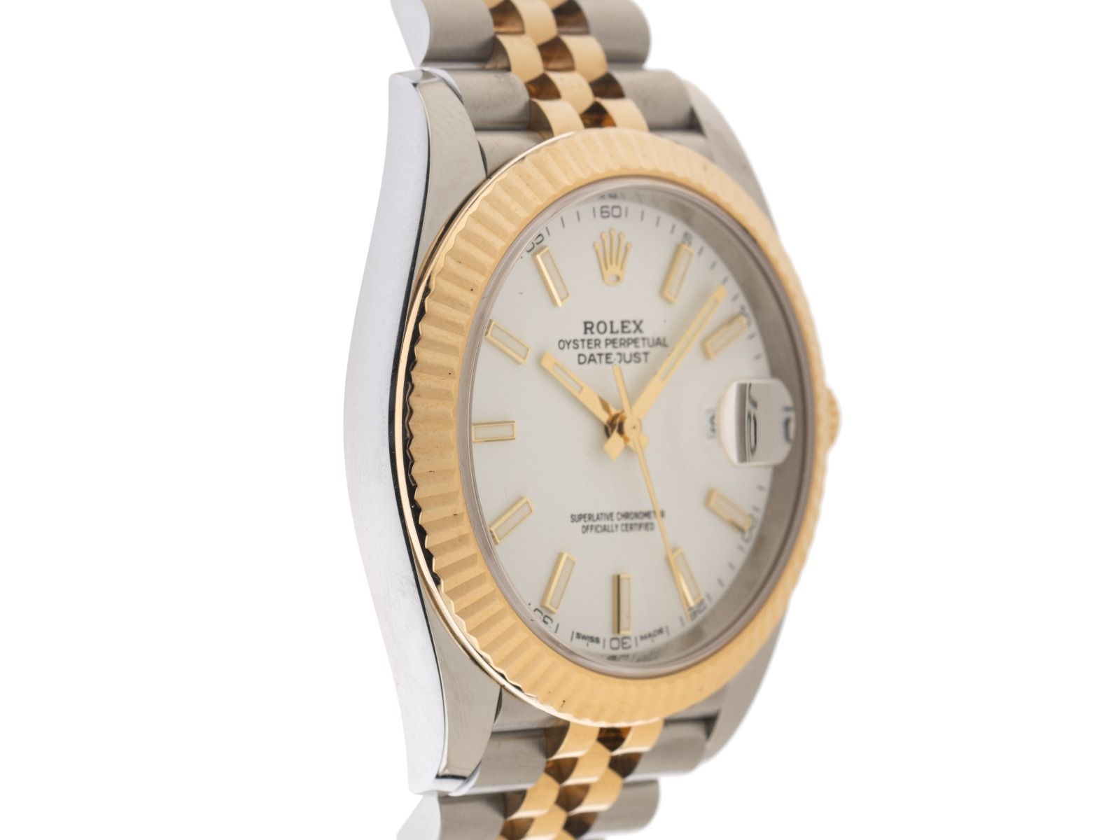 Gehäuse Edelstahl poliert und satiniert, Gehäusedurchmesser ohne Krone 41mm, Gehäusehöhe 11,8mm. Lünette 18kt Gelbgold geriffelt und poliert. Armband Jubilé Edelstahl / 18kt Gelbgold poliert und satiniert, Faltschließe mit Hersteller-Logo. Zifferblatt weiß mit aufgesetzten gelbgoldenen Leuchtindexen und gelbgoldenen Leuchtzeigern. Uhrwerk Automatik, Chronometer mit Zeugnis, Rolex Manufakturkaliber 3235 mit 31 Edelsteinen. Anzeige von Stunde, Minute und Sekunde über Zeiger aus der Mitte mit Sekundenstopp zur sekundengenauen Einstellung der Uhrzeit, Datumsanzeige mit Schnellverstellung unter Glaslupe bei 3 Uhr. Saphirglas kratzfest. Krone verschraubbar mit Hersteller-Logo. Boden Edelstahl verschraubt. Gewicht der Uhr inklusive Armband 146g, Länge des Armbandes inklusive Gehäuse 170mm. Wasserdicht bis 10 ATM. Referenznummer: 126333, Gehäusenummer: 23W18XXX, ID: P2451248000226H-16900/16700, Artikelnummer: 10000084636. Mit Gangkontrolle und kompletter äußerlicher Aufarbeitung von Februar 2026. Original Rolex Box mit Umkarton und Garantie Papiere von Februar 2018, LC 228 / Dänemark sowie Beschreibung, Ledermäppchen, Rolex Chronometer-Siegel, Tag und Watchregister Auszug von Februar 2026, The Watch Register Zertifikat / ohne Eintrag (Internationale Datenbank für verlorene oder gestohlene Uhren), Full Set. Kapitalanlage mit Wertsteigerungspotential. Wie Neu. Lieferzeit sofort.