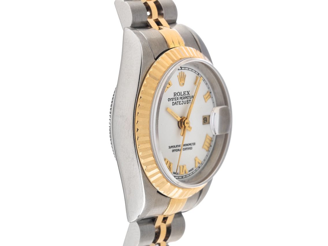 Gehäuse Edelstahl poliert und satiniert, Gehäusedurchmesser ohne Krone 26mm, Gehäusehöhe 10,5mm. Lünette 18kt Gelbgold geriffelt und poliert. Armband Jubilé Edelstahl / 18kt Gelbgold poliert und satiniert, Faltschließe Edelstahl mit Hersteller-Logo. Zifferblatt weiß mit aufgesetzten gelbgoldenen römischen Ziffern und gelbgoldenen Zeigern. Uhrwerk Automatik, Chronometer mit Zeugnis, Rolex Manufakturkaliber 2235 mit 31 Edelsteinen. Anzeige von Stunde, Minute und Sekunde über Zeiger aus der Mitte mit Sekundenstopp zur sekundengenauen Einstellung der Uhrzeit, Datumsanzeige mit Schnellverstellung unter Glaslupe bei 3 Uhr. Saphirglas kratzfest. Krone verschraubbar mit Hersteller-Logo. Boden Edelstahl verschraubt. Gewicht der Uhr inklusive Armband 55g, Länge des Armbandes inklusive Gehäuse 170mm. Referenznummer: 79173, Gehäusenummer: P100XXX, ID: P245487900226H-8100, Artikelnummer: 10000084642. Mit Gangkontrolle und kompletter äußerlicher Aufarbeitung von Februar 2026. Original Rolex Box mit Umkarton und Garantie Papiere von Juni 2000, LC 888 / Hong Kong sowie Beschreibung, Ledermäppchen, Übersetzungsheft, Rolex Chronometer-Siegel, Tag und Watchregister Auszug von Februar 2026, The Watch Register Zertifikat / ohne Eintrag (Internationale Datenbank für verlorene oder gestohlene Uhren), Full Set. Superschnäppchen, Kaptalanlage mit Wertsteigerungspotential, sehr seltenes Sammlerstück, fast nicht getragen. Sehr guter Zustand. Lieferzeit sofort.