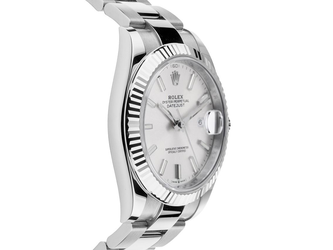 Gehäuse Edelstahl poliert und satiniert, Gehäusedurchmesser ohne Krone 41mm, Gehäusehöhe 11,6mm. Lünette 18kt Weißgold geriffelt und poliert. Armband Oyster Edelstahl poliert und satiniert, Rolex Faltschließe Edelstahl mit Hersteller-Logo. Zifferblatt silberfarben mit aufgesetzten in Weißgold gefassten Leuchtindexen und weißgoldenen Leuchtzeigern. Uhrwerk Automatik, Chronometer mit Zeugnis, Rolex Manufakturkaliber 3235 mit 31 Edelsteinen, Gangreserve ca. 70 Stunden. Anzeige von Stunde, Minute und Sekunde über Zeiger aus der Mitte mit Sekundenstopp zur sekundengenauen Einstellung der Uhrzeit, Datumsanzeige mit Schnellverstellung unter Glaslupe bei 3 Uhr. Saphirglas kratzfest. Krone verschraubbar mit Hersteller-Logo. Boden Edelstahl verschraubt. Gewicht der Uhr inklusive Armband 146g, Länge des Armbandes inklusive Gehäuse 180mm. Wasserdicht bis 10 ATM. Referenznummer: 126334, Gehäusenummer: H97Z1XXX, ID: P2477186000226H-13900/11250, Artikelnummer: 10000084717. Mit Gangkontrolle und kompletter äußerlicher Aufarbeitung von Februar 2026. Original Rolex Box mit Umkarton und Garantie Papiere von März 2021, neue Rolex Garantie Karte ohne Ländercode sowie Beschreibung, Ledermäppchen, Rolex Chronometer-Siegel und Watchregister Auszug von Februar 2026, The Watch Register Zertifikat / ohne Eintrag (Internationale Datenbank für verlorene oder gestohlene Uhren), Full Set. Superschnäppchen, Kapitalanlage mit Wertsteigerungspotential. Wie Neu. Lieferzeit sofort.