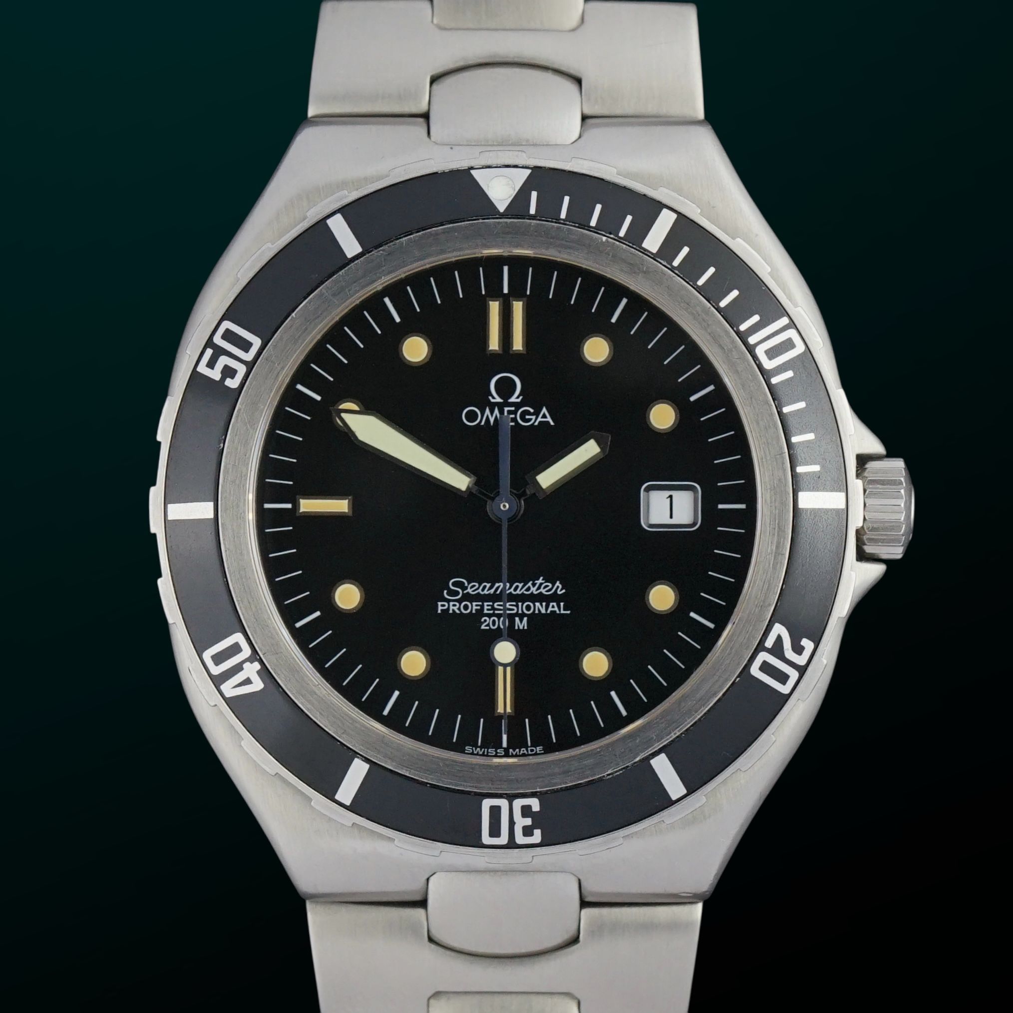 This vintage Omega Seamaster Professional 200M was produced in 1995 and is a more uncommon variant, as this example is the XL sized model measuring 39 millimeters in width, instead of the far more common 36 millimeter version. The watch is fitted with a quartz movement, which was overhauled in February 2026 and currently runs and functions excellently. The dial is perfect, and both the case and bracelet retain their original polish, showing almost no signs of wear whatsoever. This piece comes with the original Omega box and is not only in complete mint condition with only very tiny signs of wear, but also entirely original. A beautiful and highly wearable daily watch.