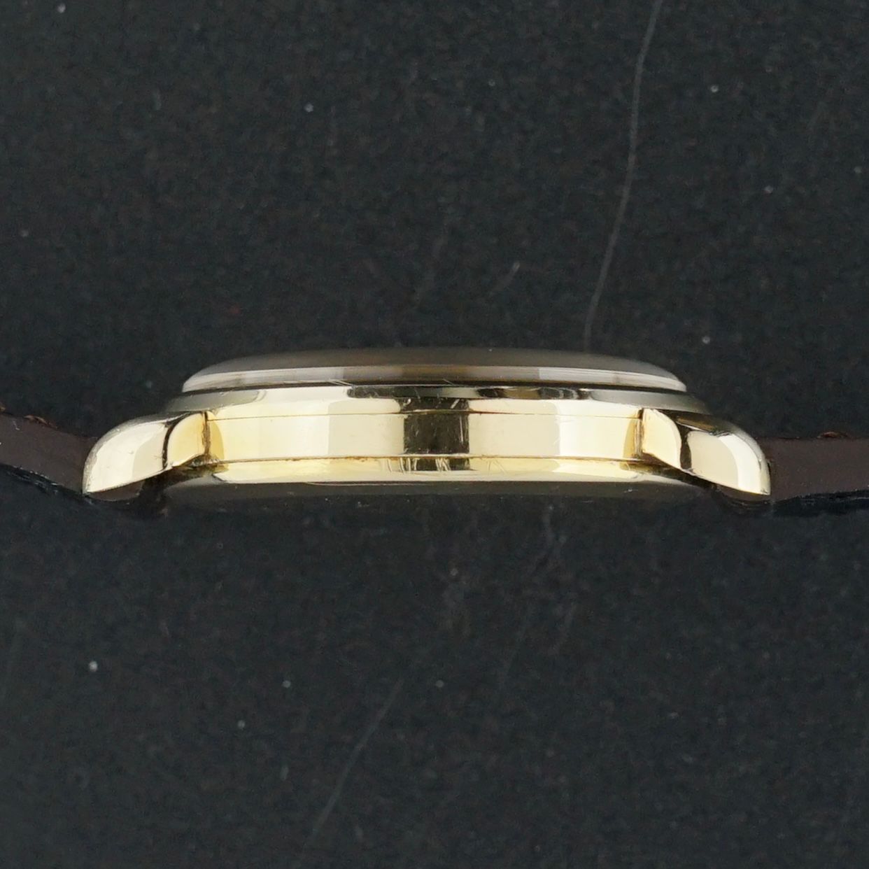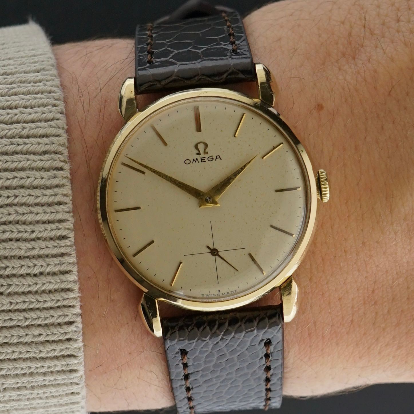 This vintage Omega “small seconds” was produced in 1954. This piece is in beautiful condition, featuring a white dial with very fine and even patina speckling across the surface, giving it outstanding vintage character. The case is gold capped, with an 80 micron thick gold layer, making it significantly more durable than later gold plated variants with only 20 microns of gold. Inside is the Omega caliber 266 manual wind movement, which was serviced in February 2026 and now runs and functions excellently. The watch is paired with a grade 3 brown leather strap with a crocodile motif, which suits the watch beautifully. It remains entirely original, with the exception of the brand new strap.
