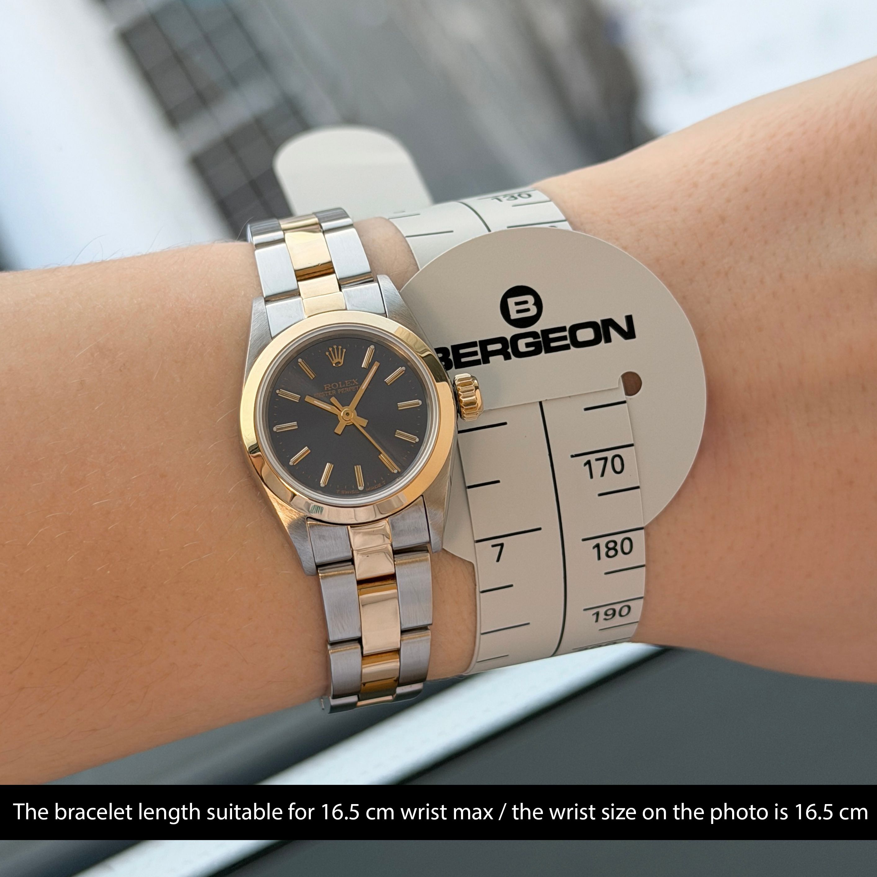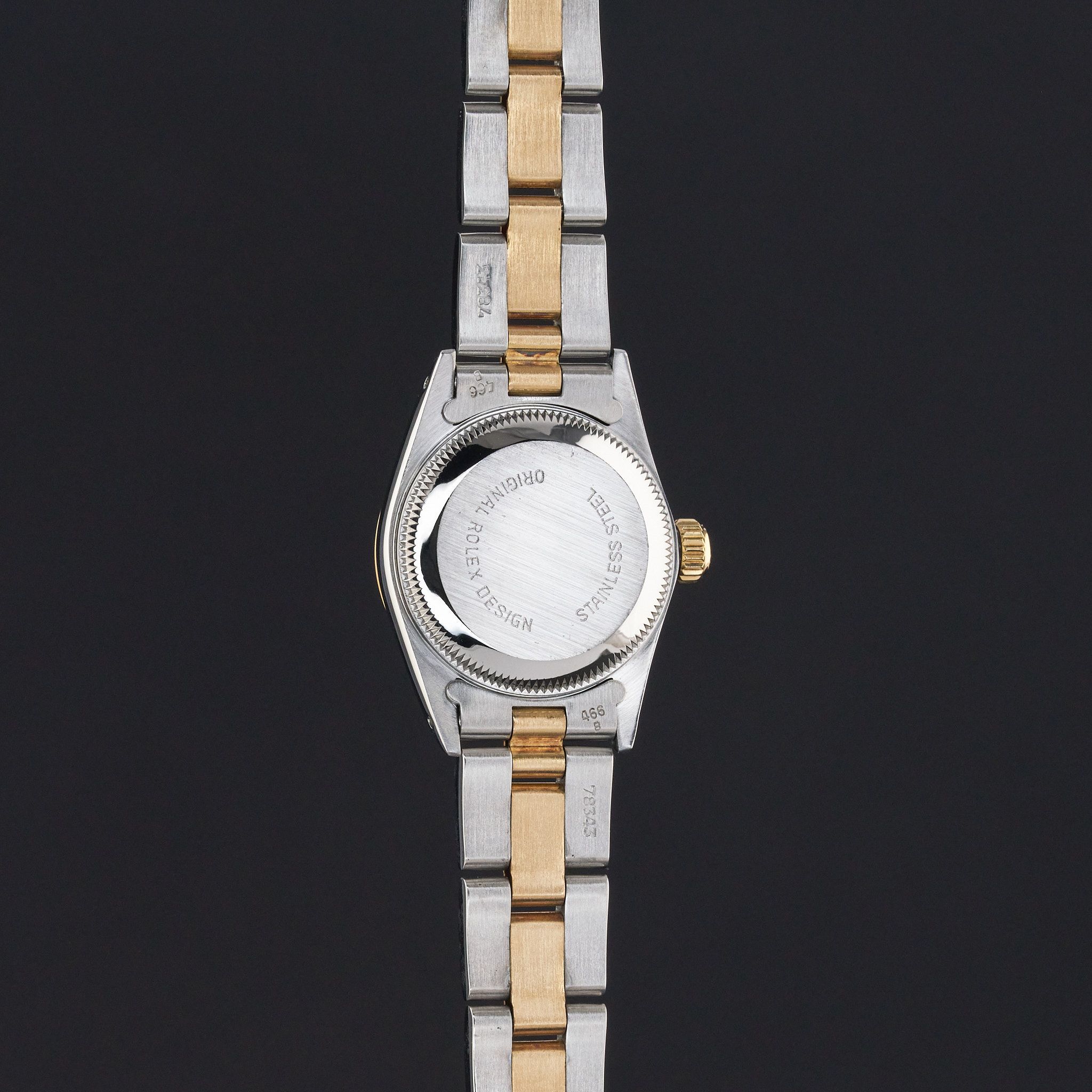 This Rolex Oyster Perpetual Lady 67183 features a Blue dial and is crafted from 18K yellow gold and stainless steel, with a production year of 1988.